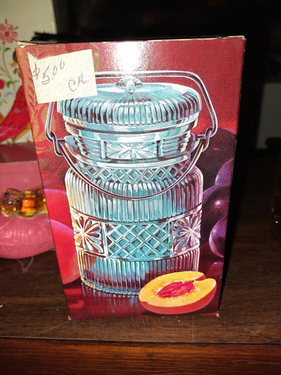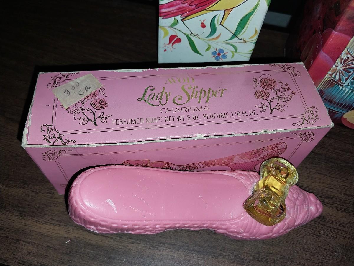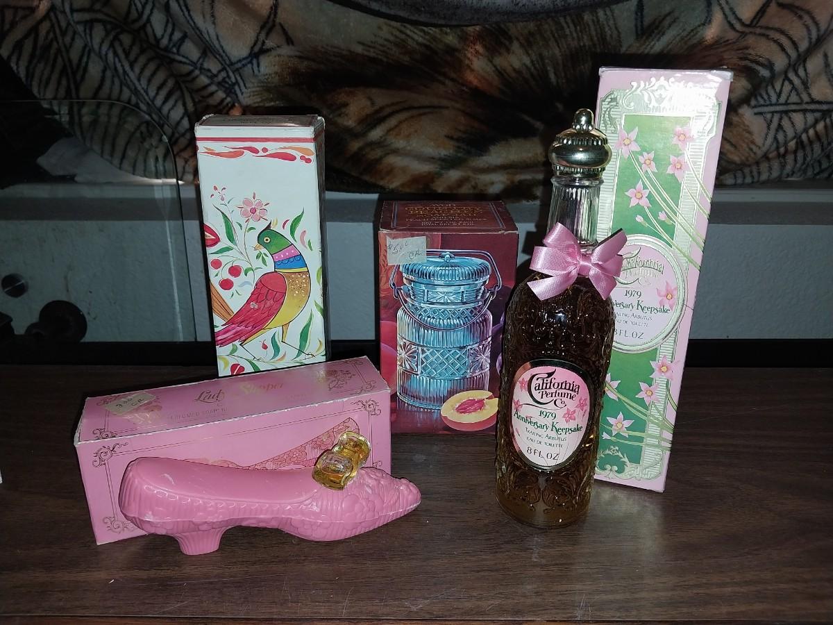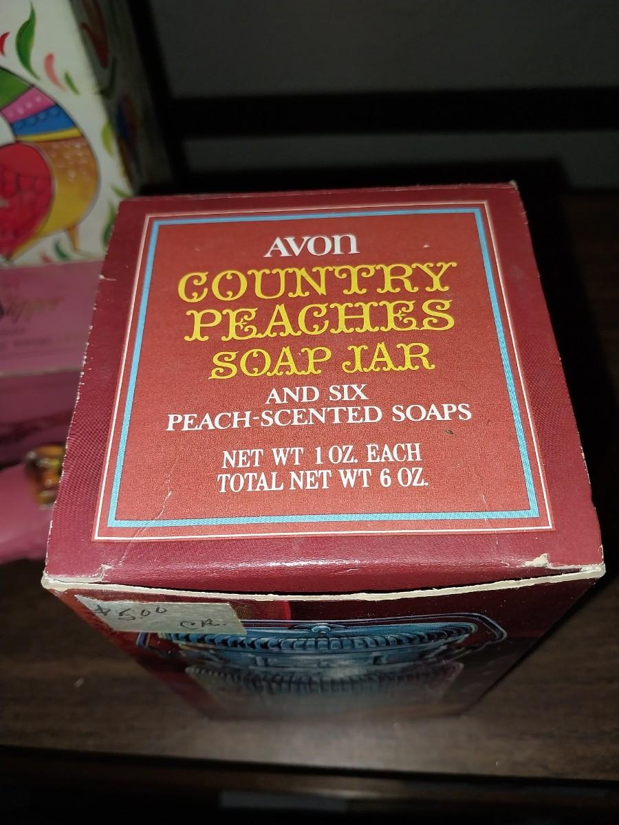 VINTAGE PEACHS SOAP JAR-CREAMERY HAND LOTION-CHAMPAGNE BOTTLE PERFUME-LADY SLIPPER