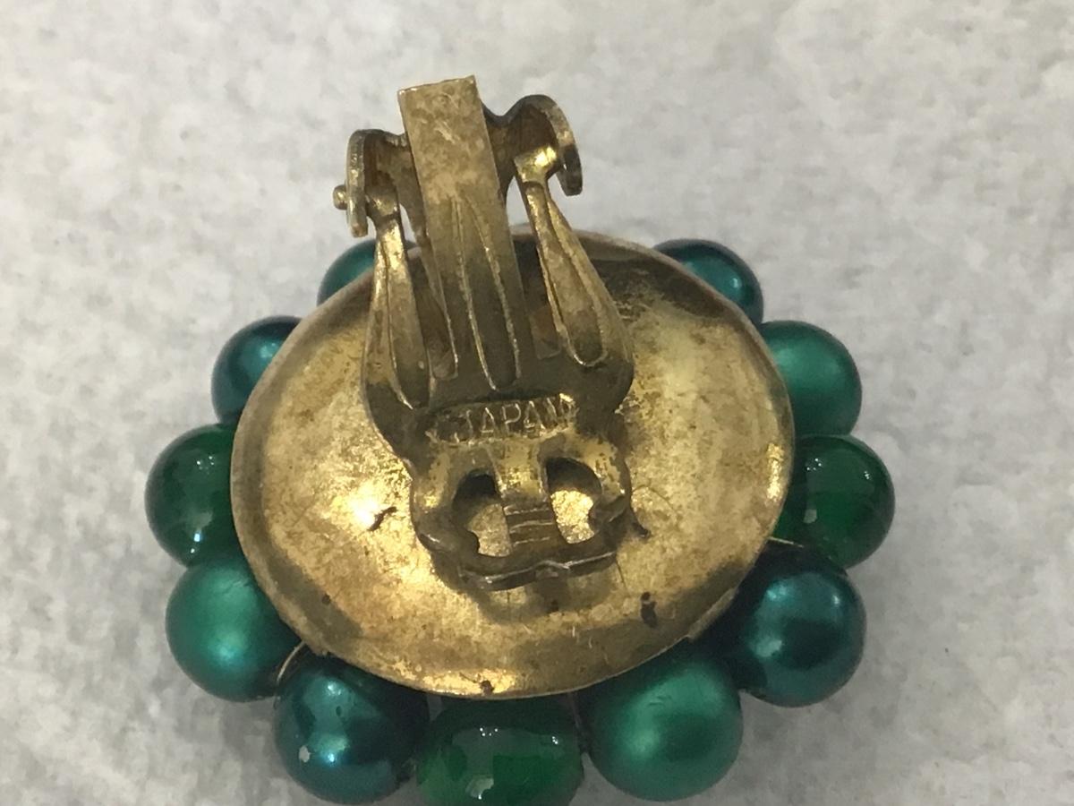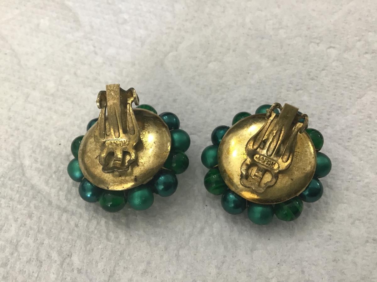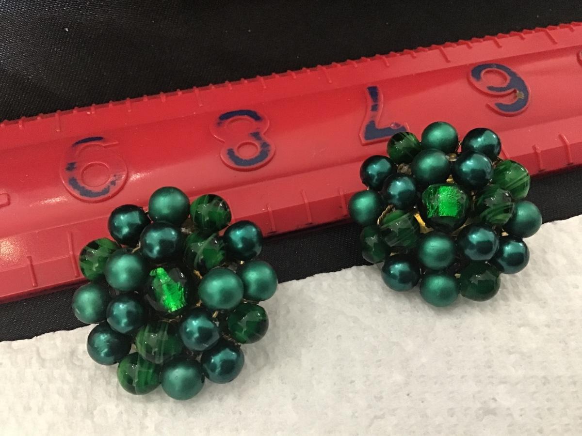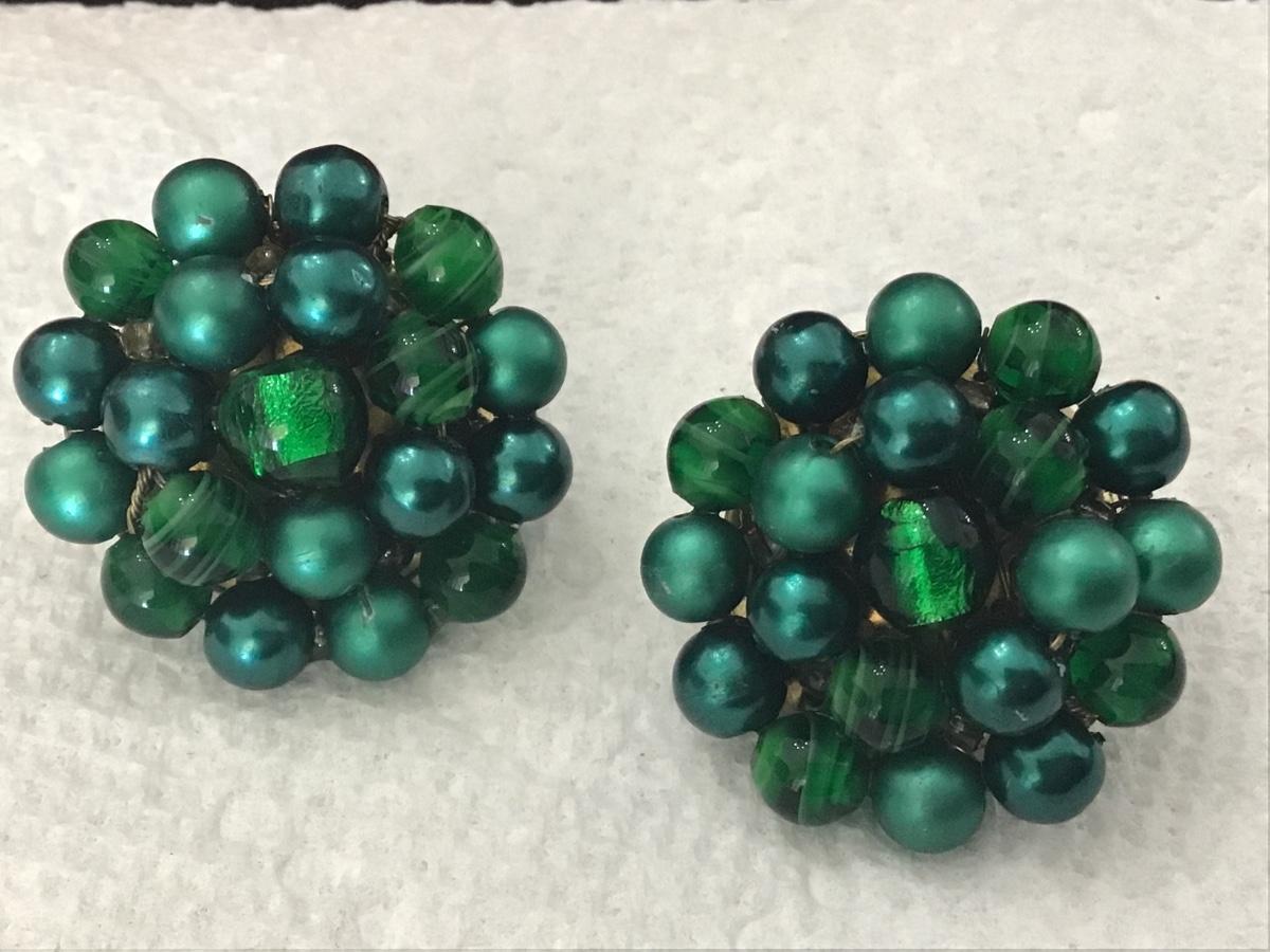 Vintage Peacock Green Glass and Bead Clip on Earrings. Japan