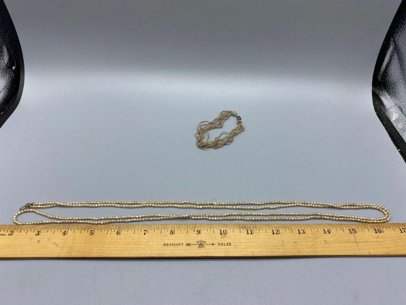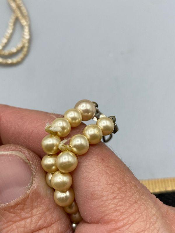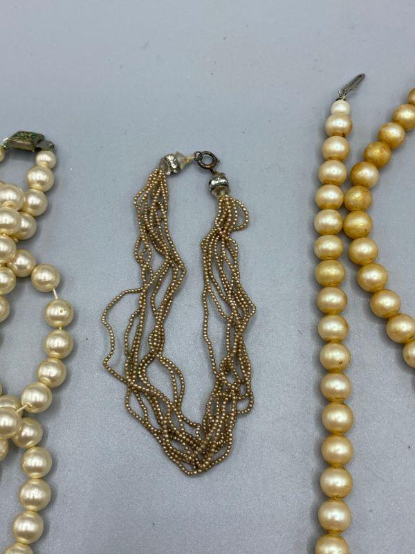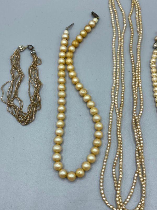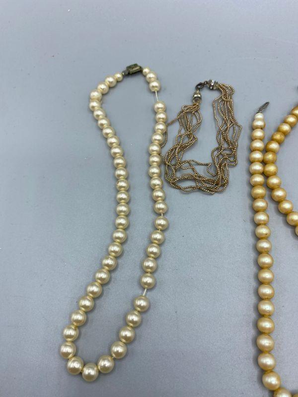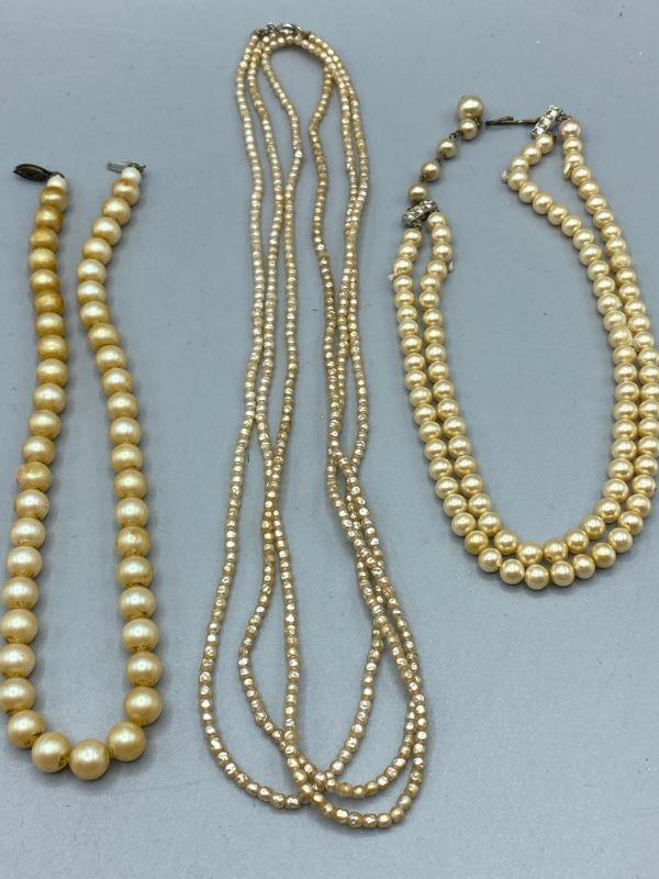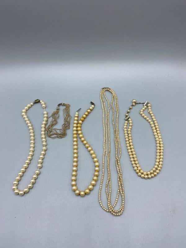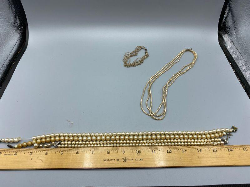Vintage pearl jewelry lot. Think they are faux, but they need to be cleaned up. 4 necklaces and a bracelet. 3 necklaces are short choker style, one is extra long easily wrap a couple of times.
