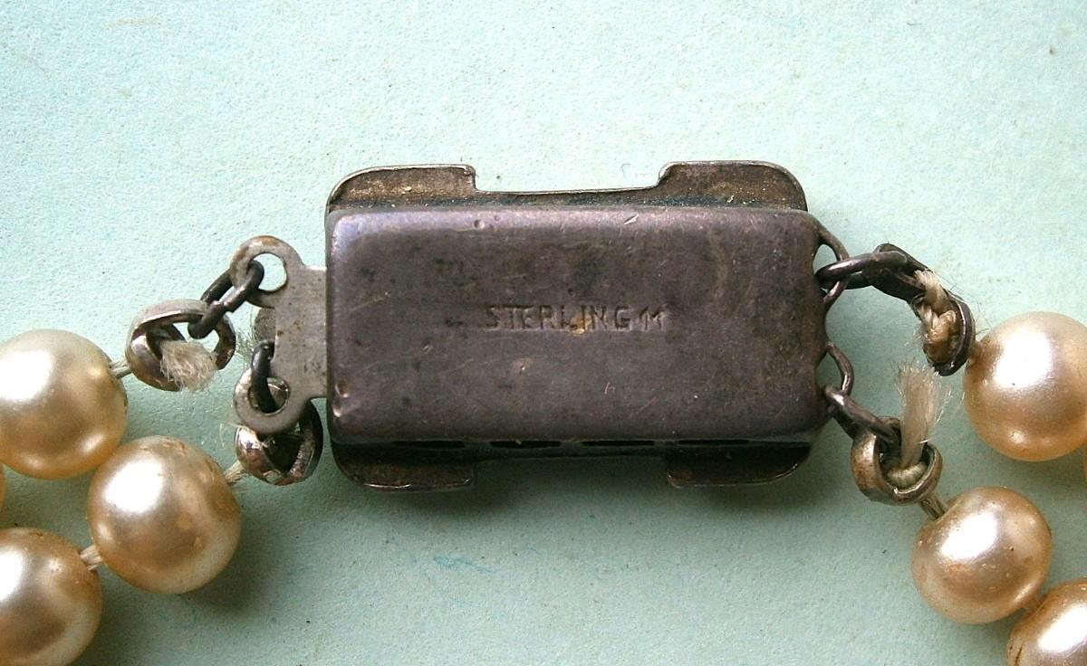 Vintage Double Strand Pearl Necklace with Sterling Silver Clasp, 14 in. long, missing one rhinestone on claps.