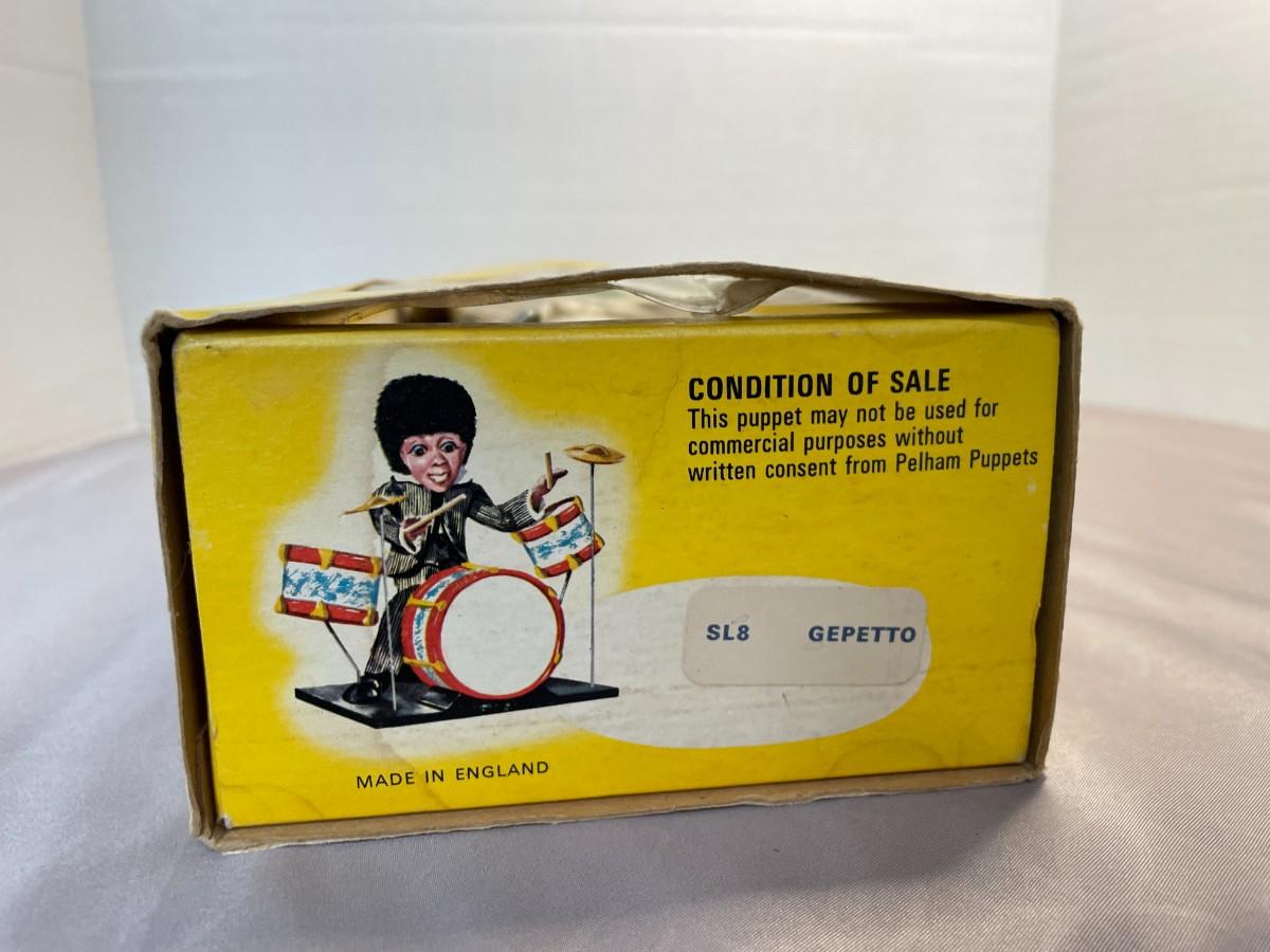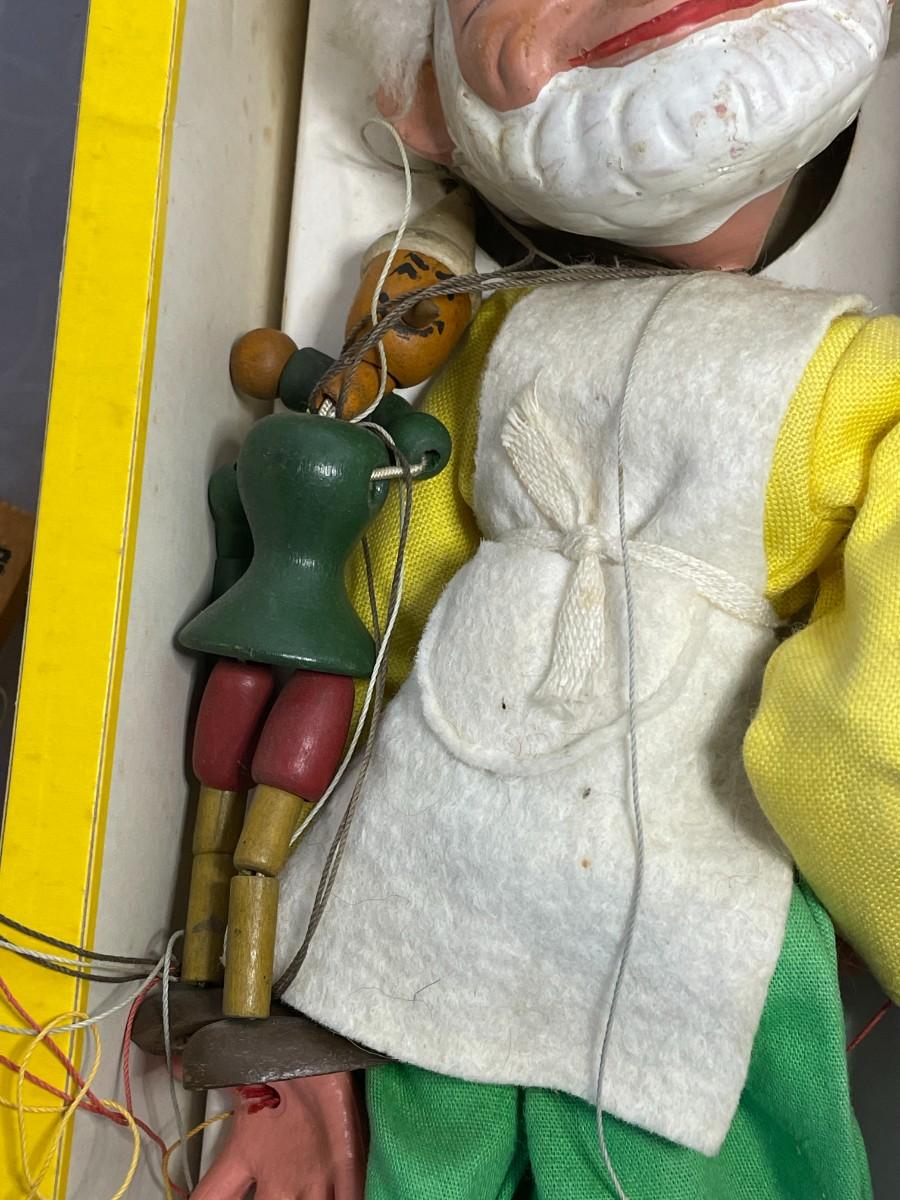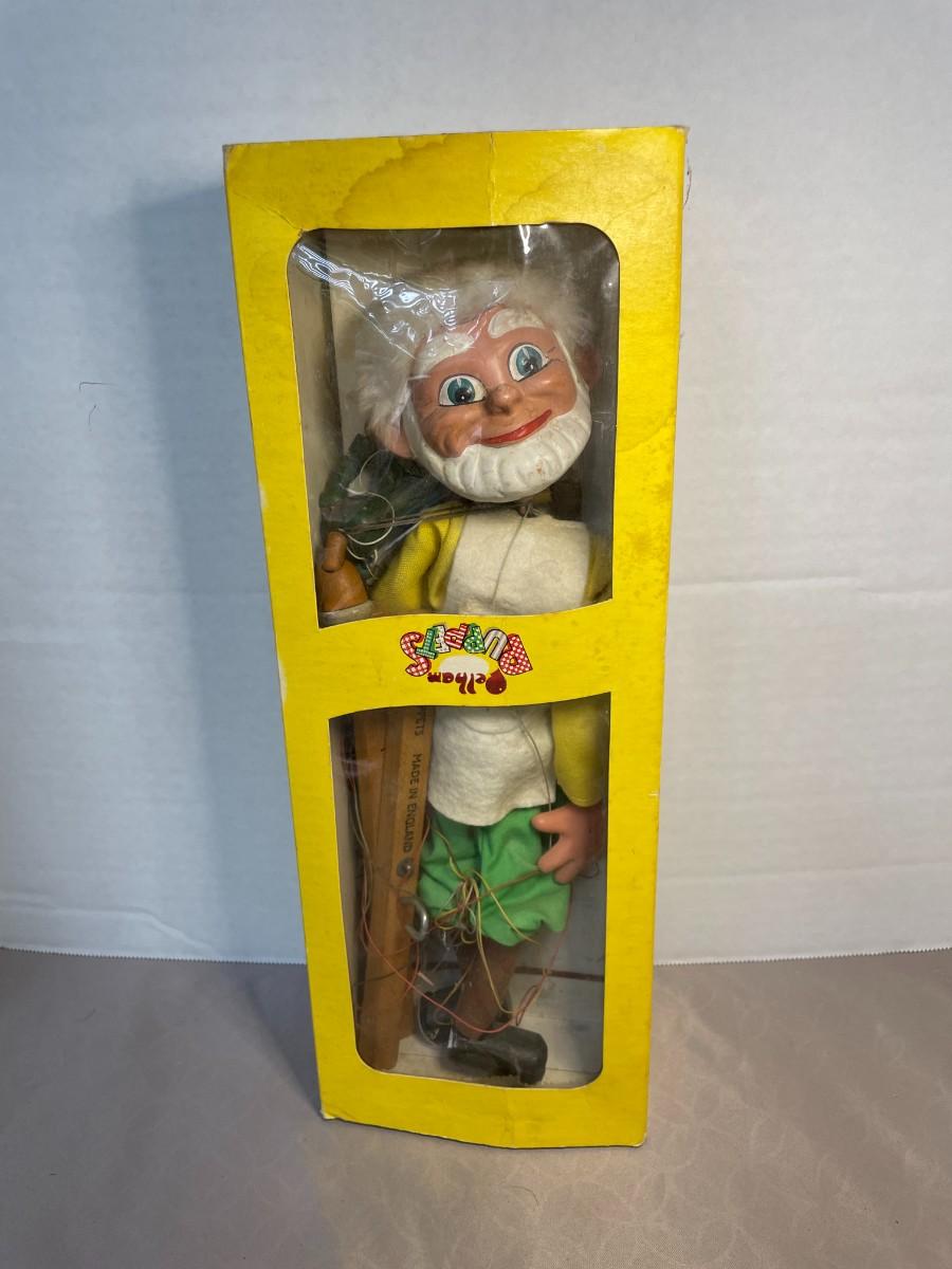 This puppet is in very good condition and was made in England by Pelham Puppets. Pelham Puppets are hand made puppets designed for children and not for professional use. This puppet is about 12 inches tall. Gepetto has his boy puppet with him and all of the strings appear intact and complete, but they are tangled. Circa 1950s-1960s.
