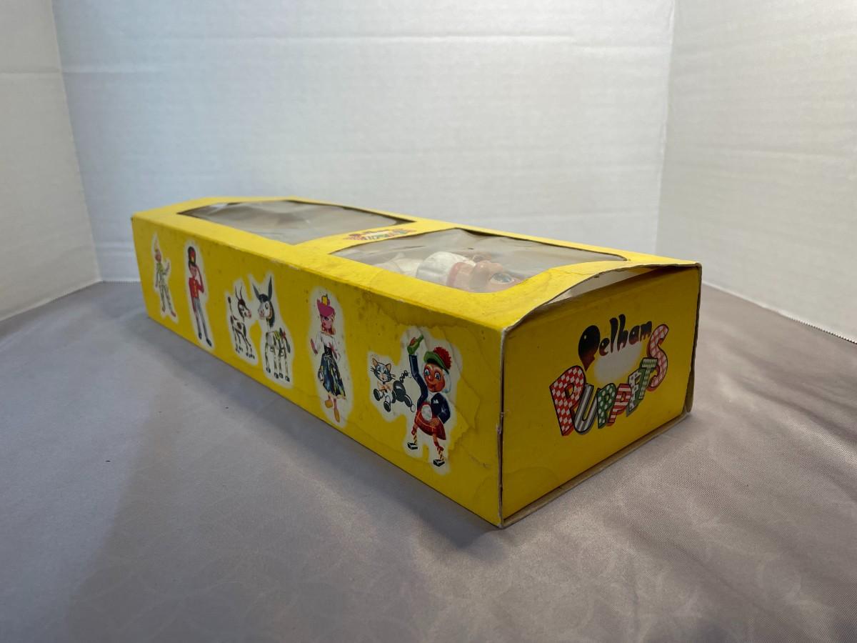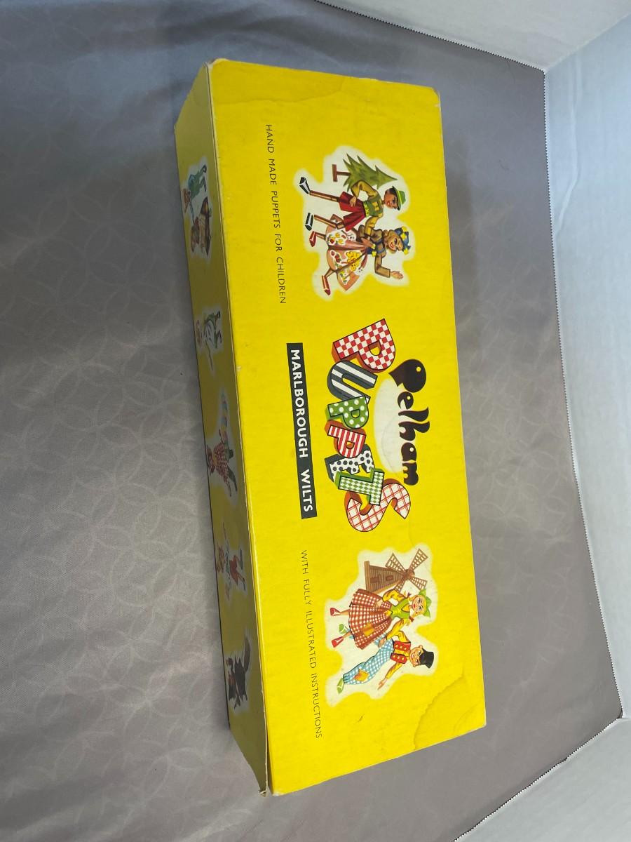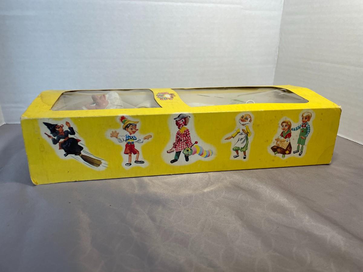 This puppet is in very good condition and was made in England by Pelham Puppets. Pelham Puppets are hand made puppets designed for children and not for professional use. This puppet is about 12 inches tall. Gepetto has his boy puppet with him and all of the strings appear intact and complete, but they are tangled. Circa 1950s-1960s.
