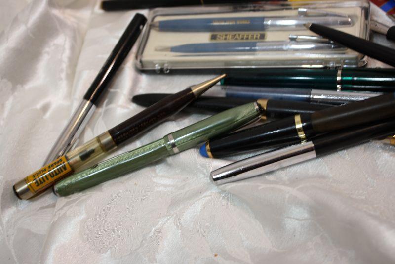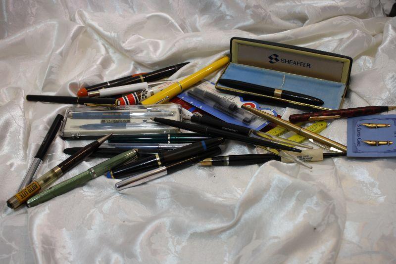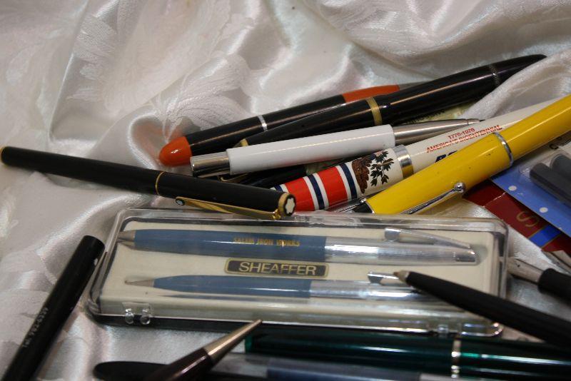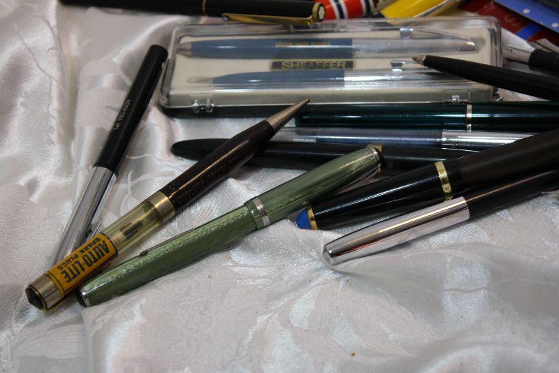 Mixed pen lot, lots of Sheaffer including 1 14nib, a thin MontBlanc fountain pen (nib looks bent to me), Estebrook, some cool advertising pens.