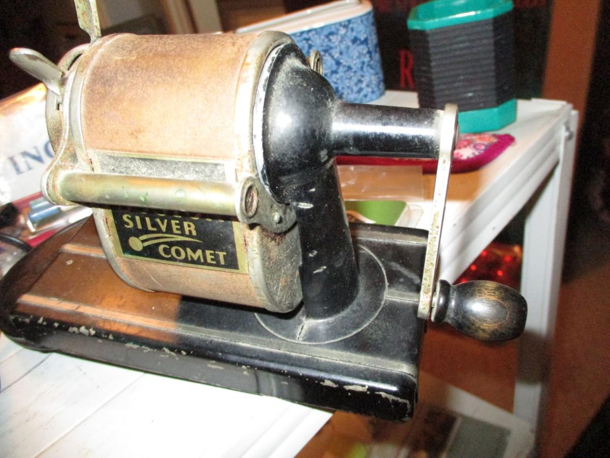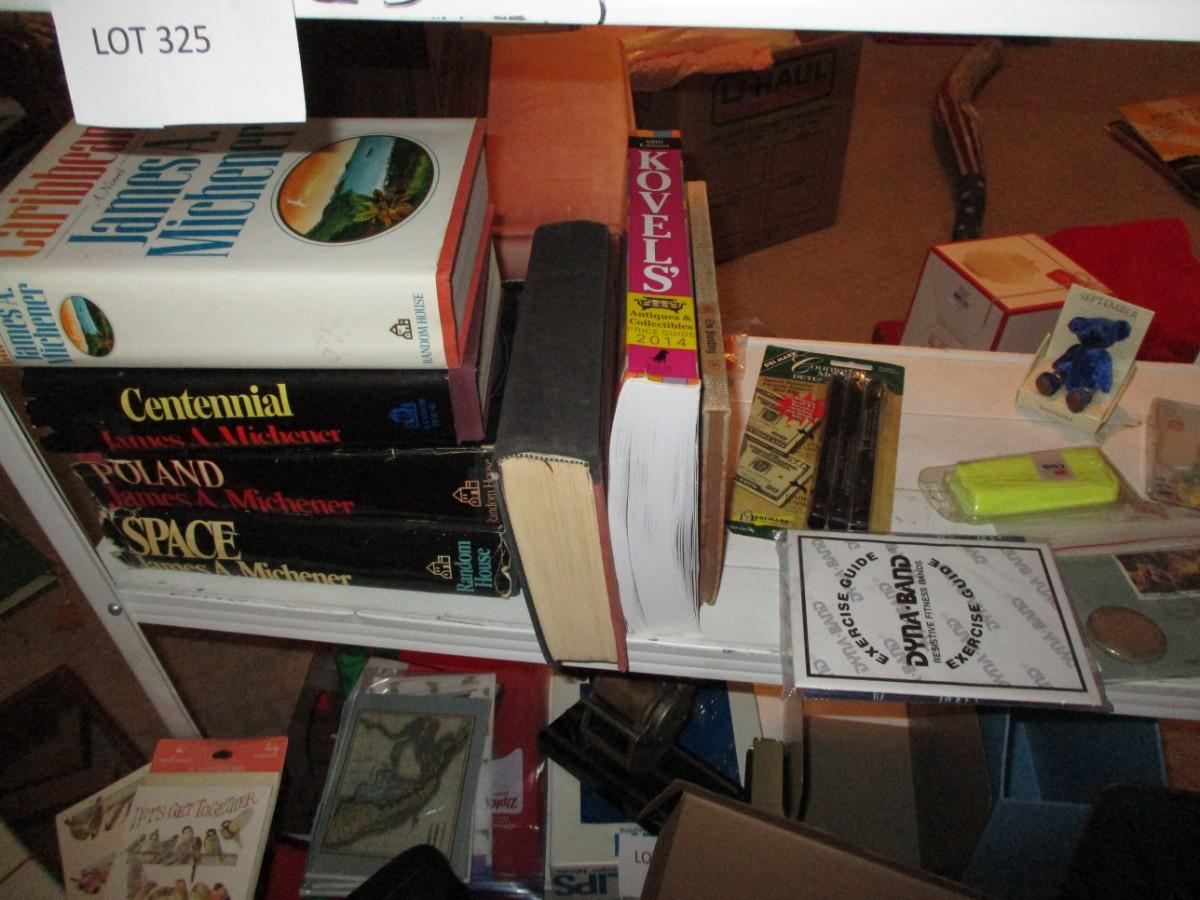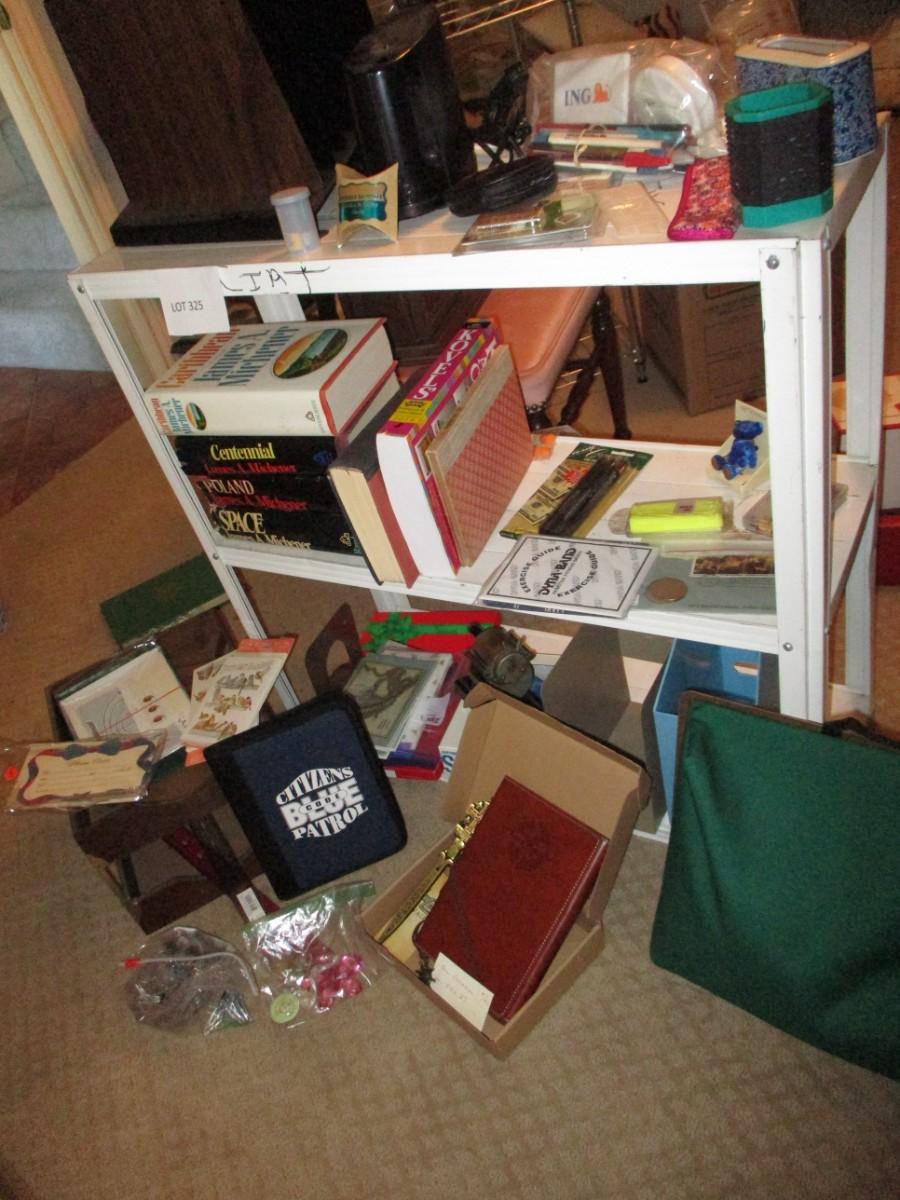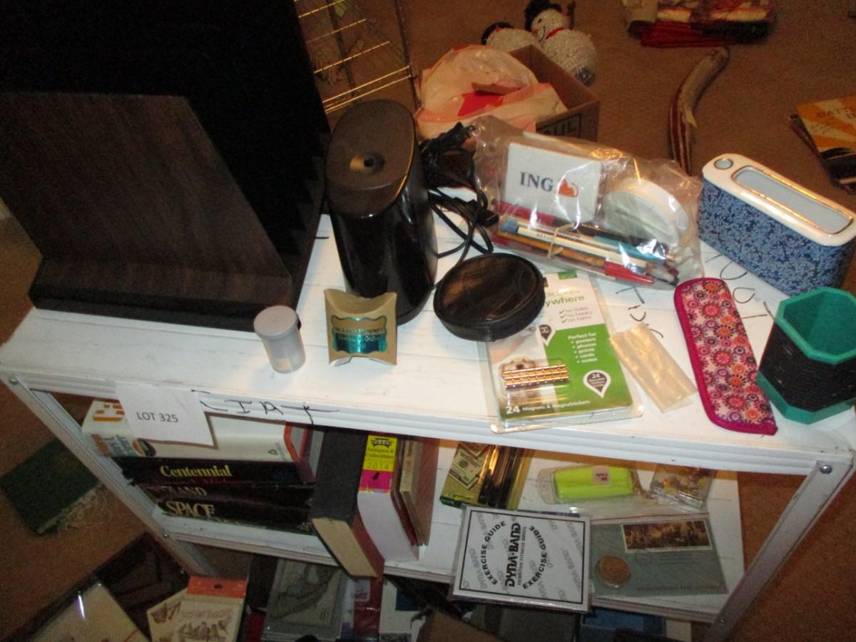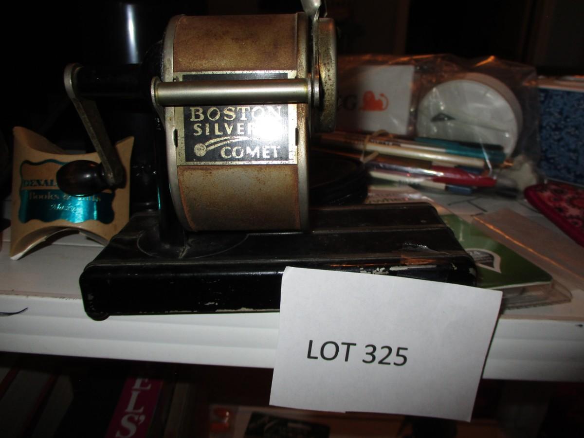 Lot 325 & 326. Boston Silver Comet vintage pencil sharpener, Electric pencil sharpner, Office supplies, books, Shelf not included. Leather bound journal. Letter opener from Jerusalem.