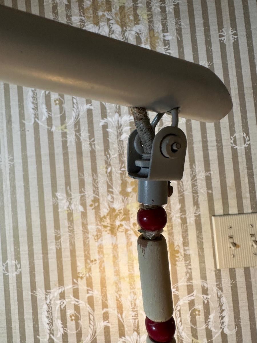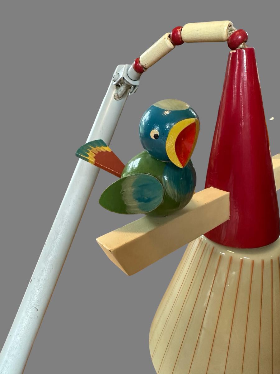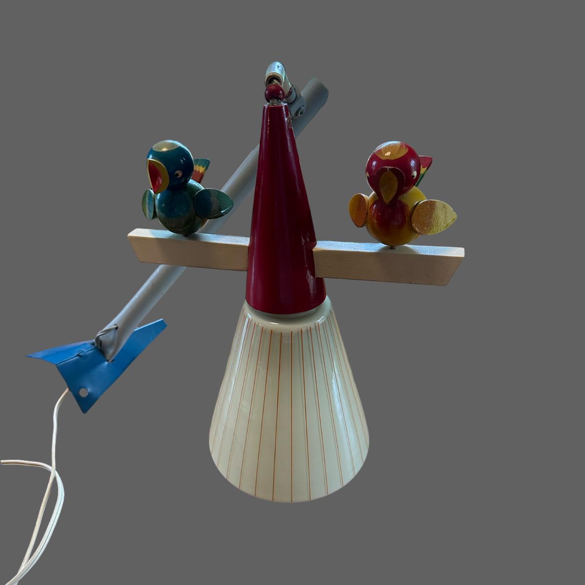 Lamp plugs in and works, does not have a switch for it. The birds are broken off with the wood still remaining inside the base. See pictures to see where they were once attached.
