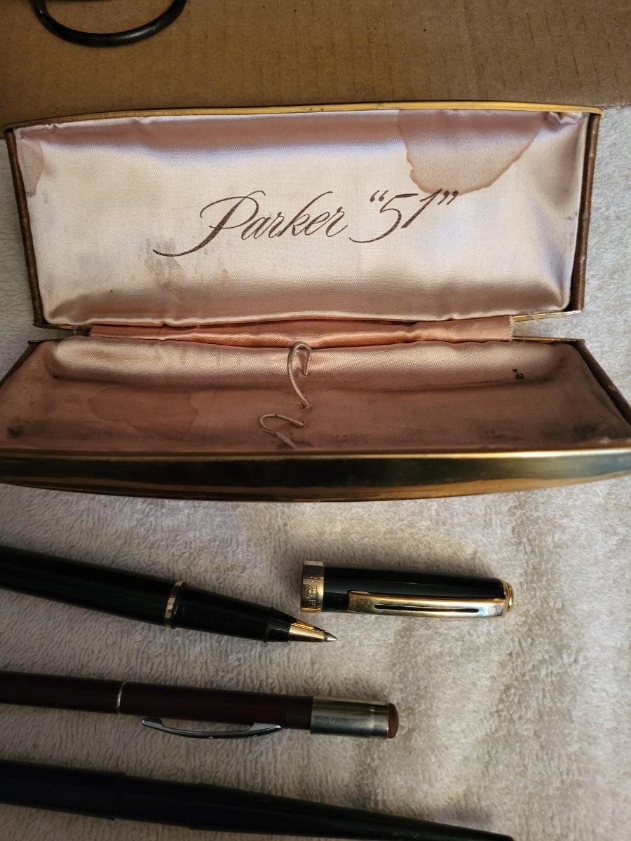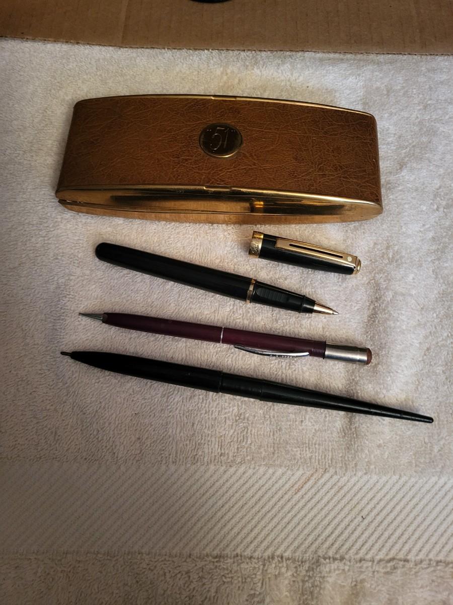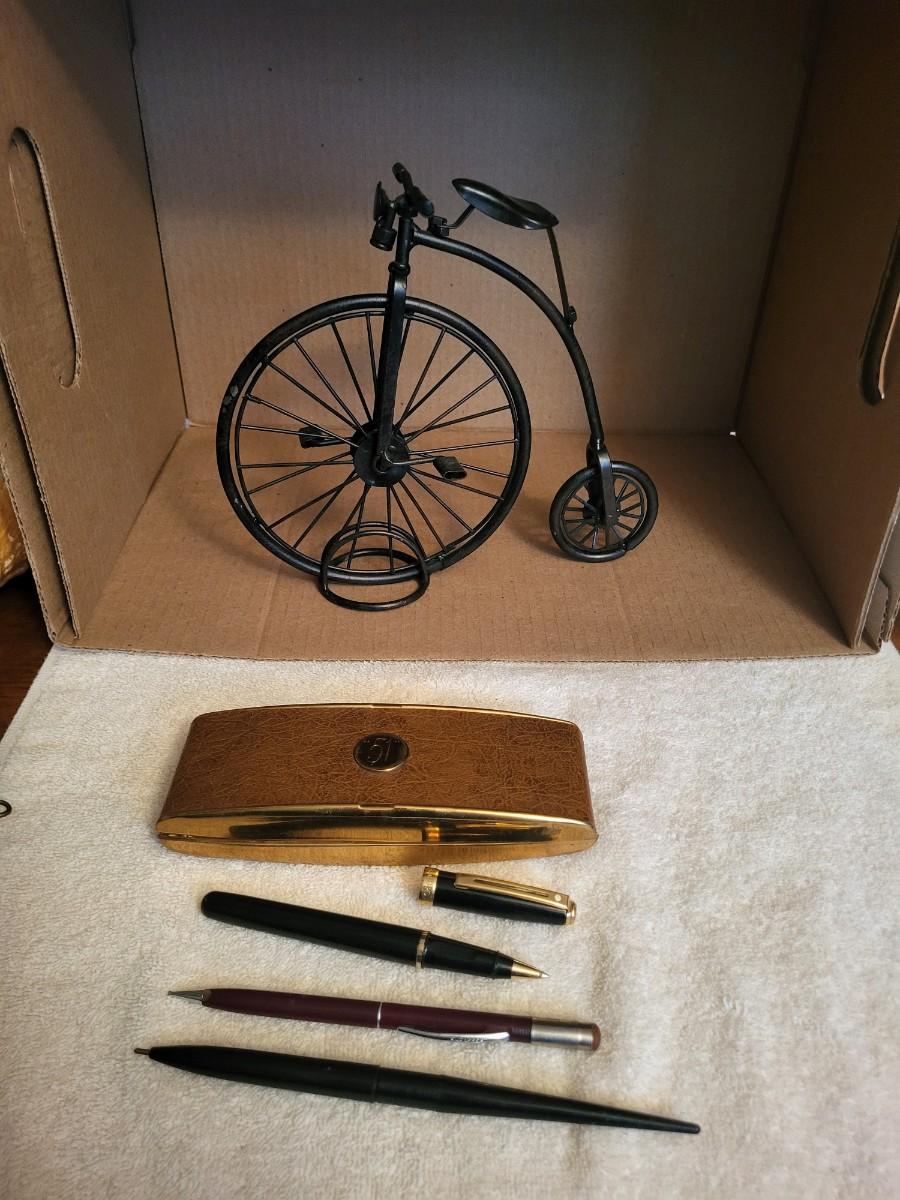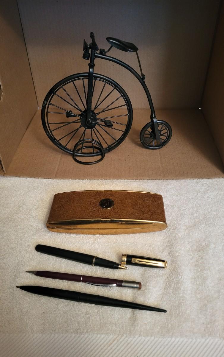 VINTAGE PENS AND PENCIL, PARKER 51 CASE AND METAL DECORATIVE BIKE