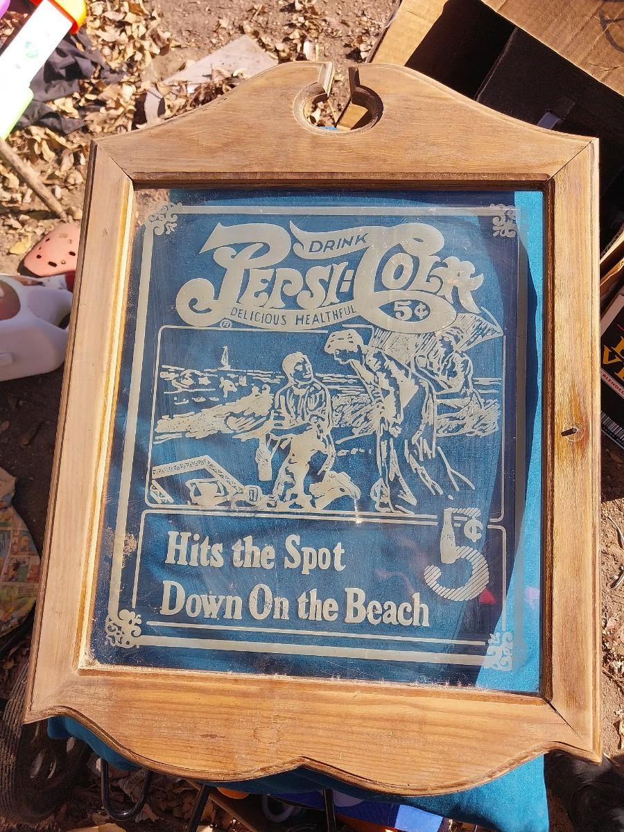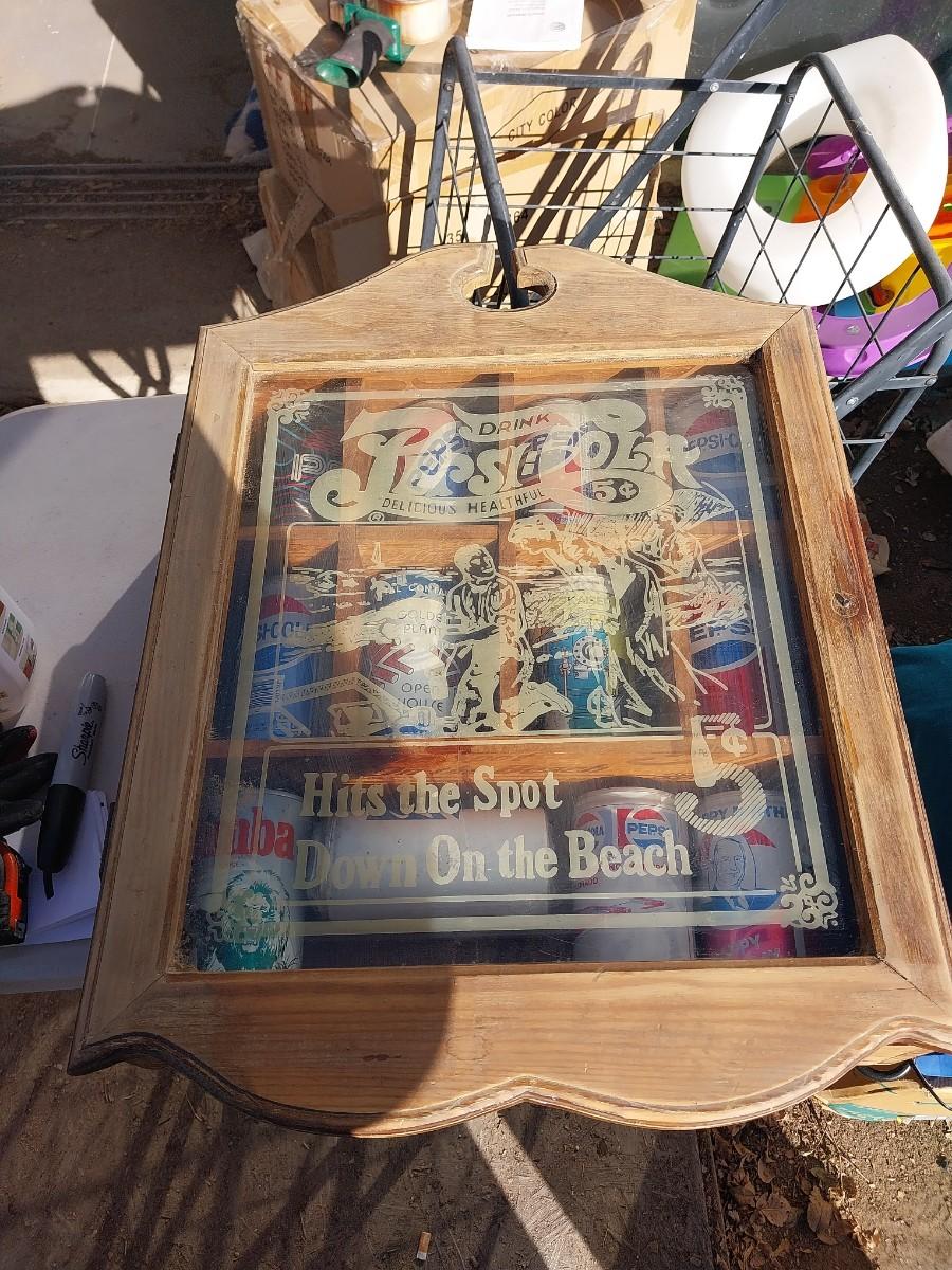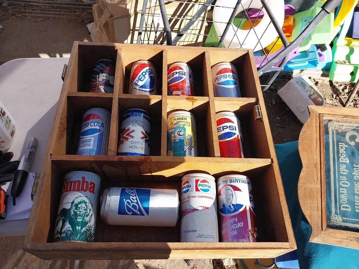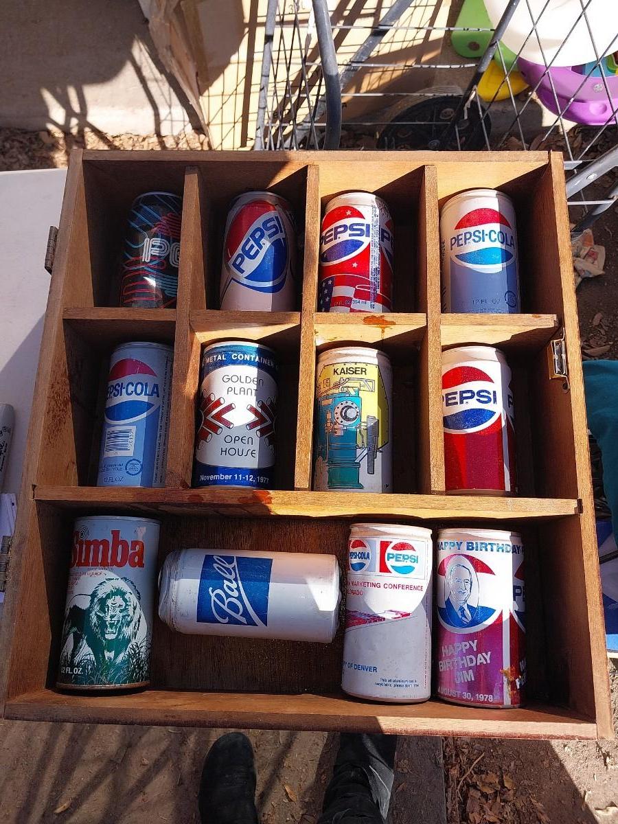 VINTAGE PEPSI-COLA WOODEN CABINET GLASS FRONT AND VINTAGE CANS