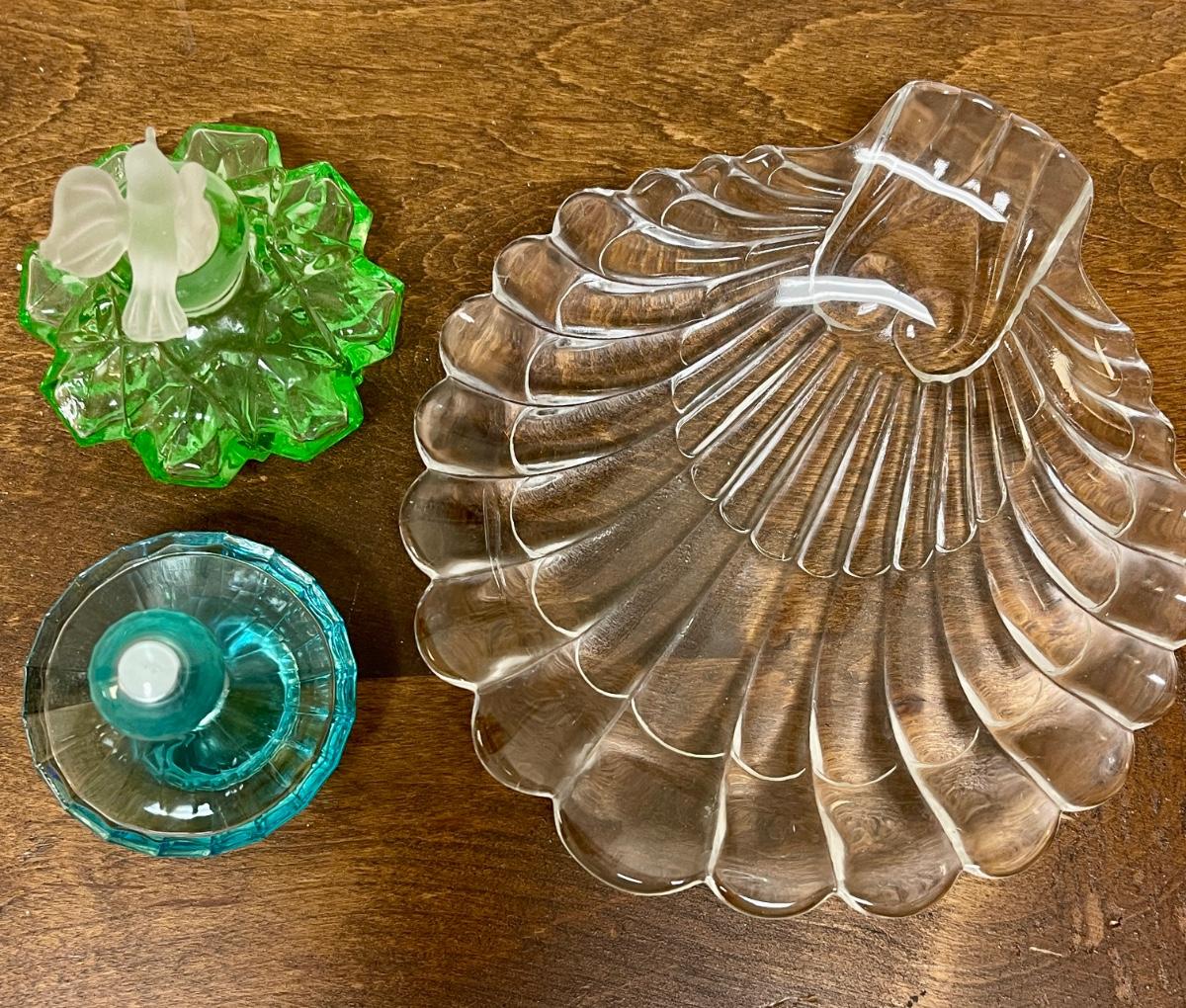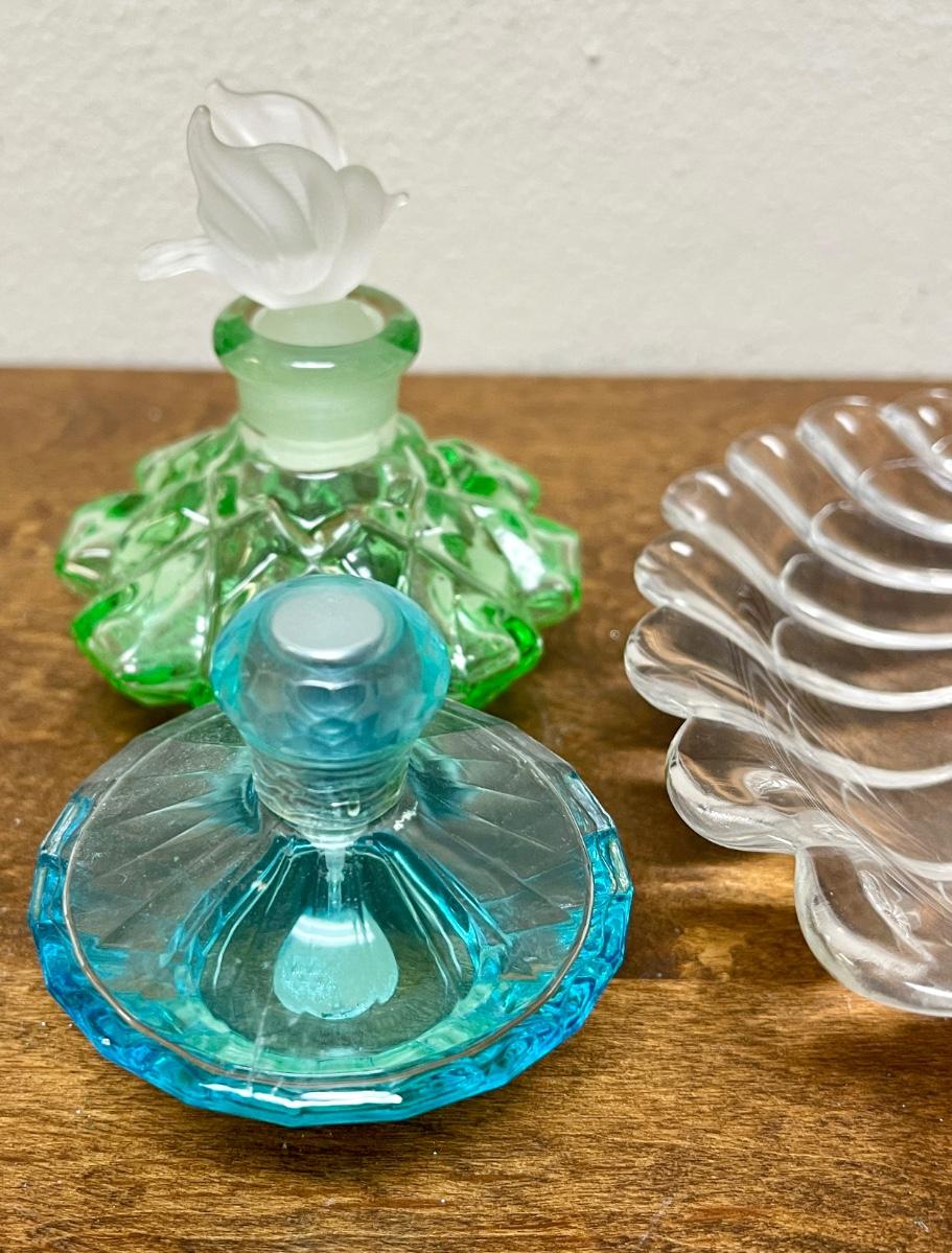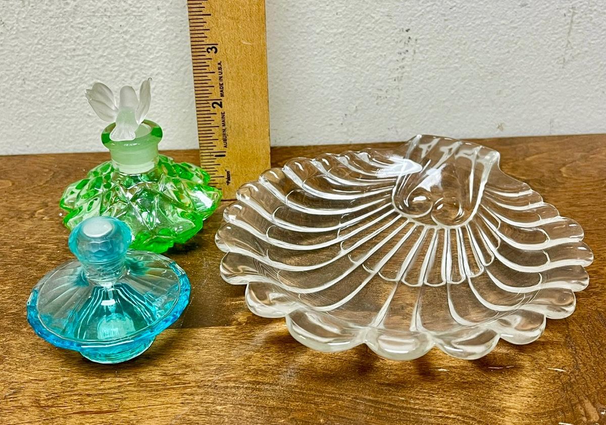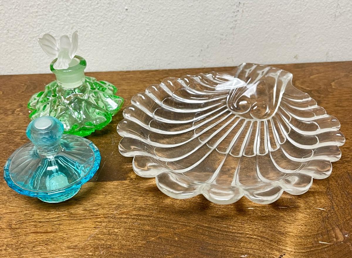 The blue perfume bottle looks like it’s missing a cap or top piece. Otherwise everything is in good condition. The shell shaped dish is glass.