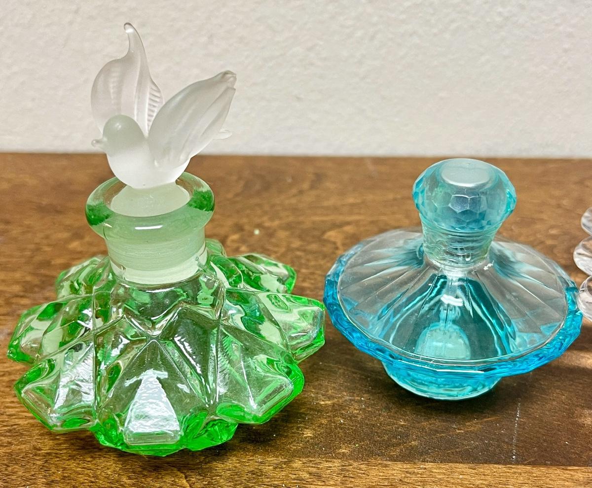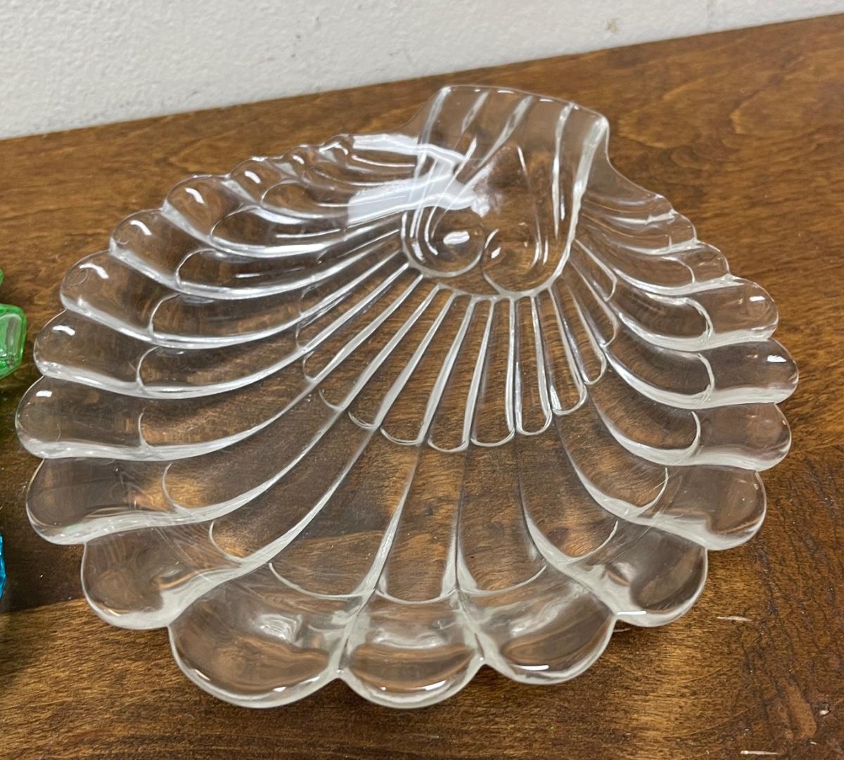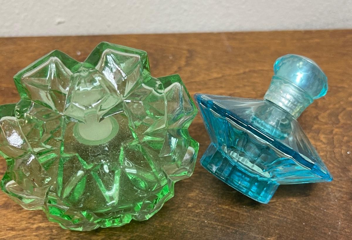 The blue perfume bottle looks like it’s missing a cap or top piece. Otherwise everything is in good condition. The shell shaped dish is glass.