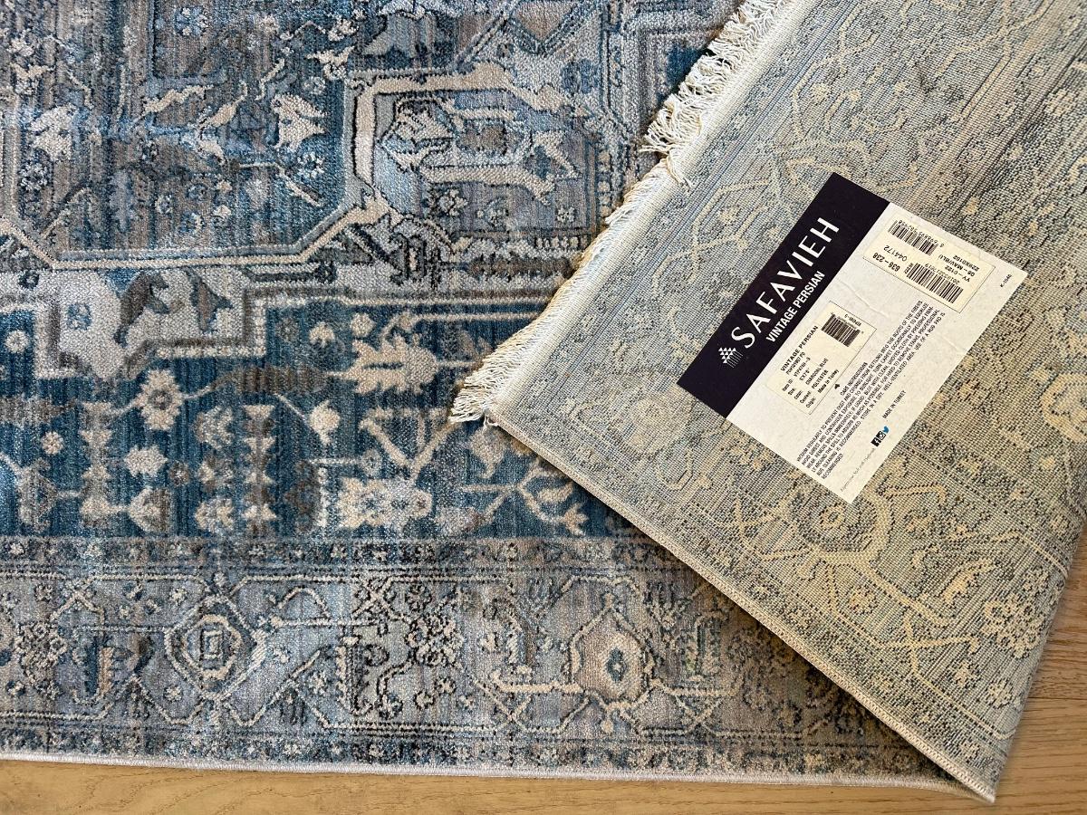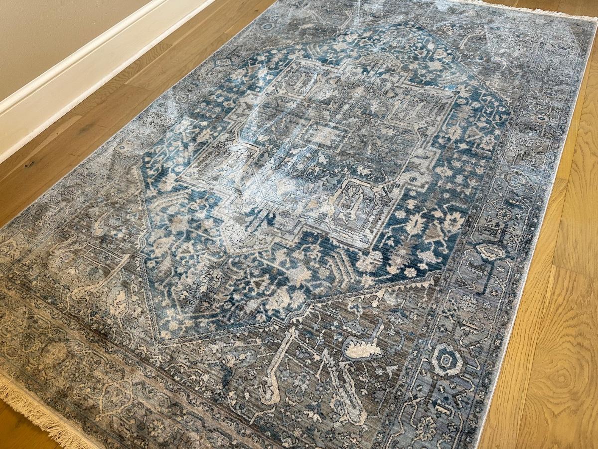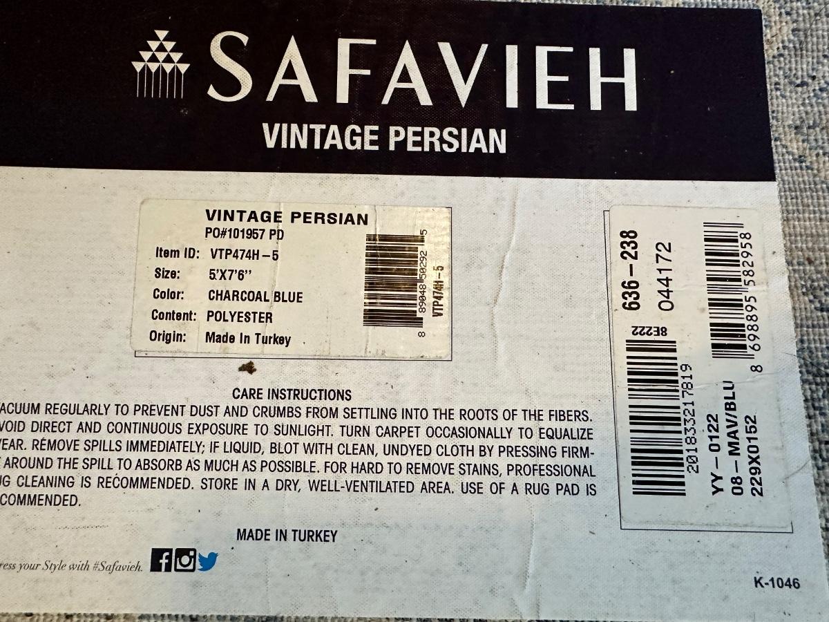 Vintage Persian 5’ x 7’6” Charcoal Blue Rug. Small dog in home.