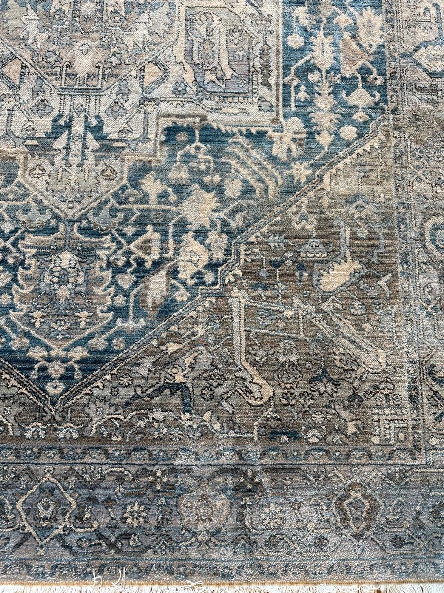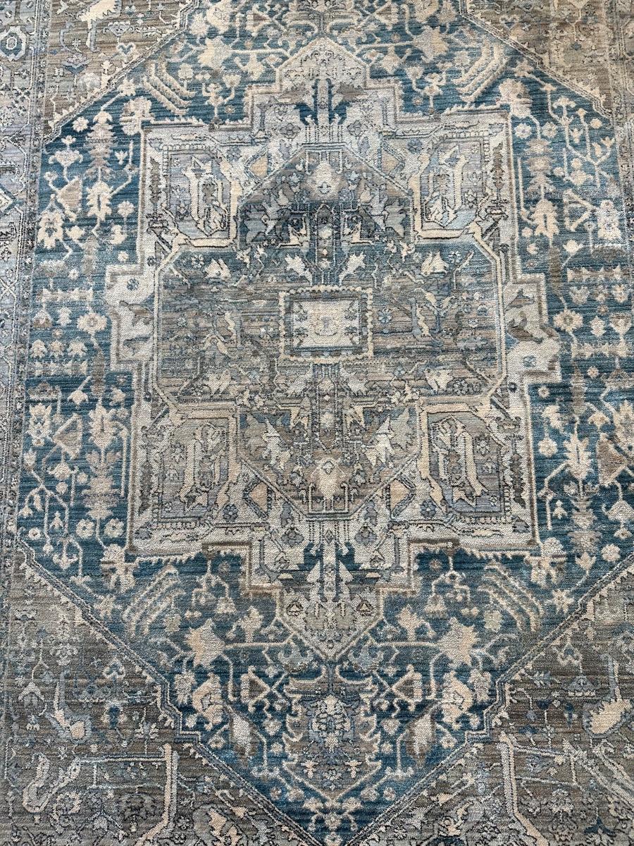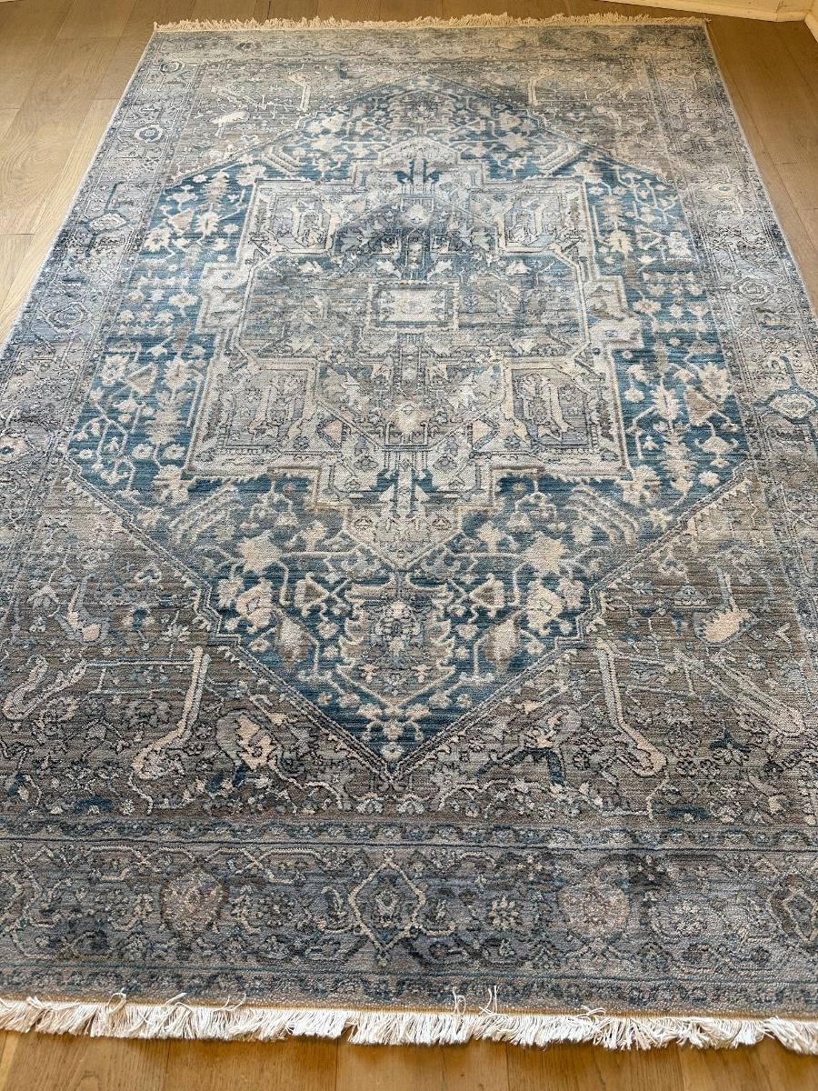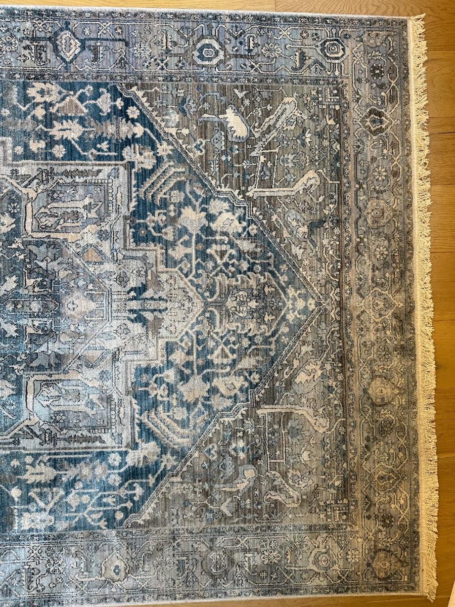 Vintage Persian 5’ x 7’6” Charcoal Blue Rug. Small dog in home.
