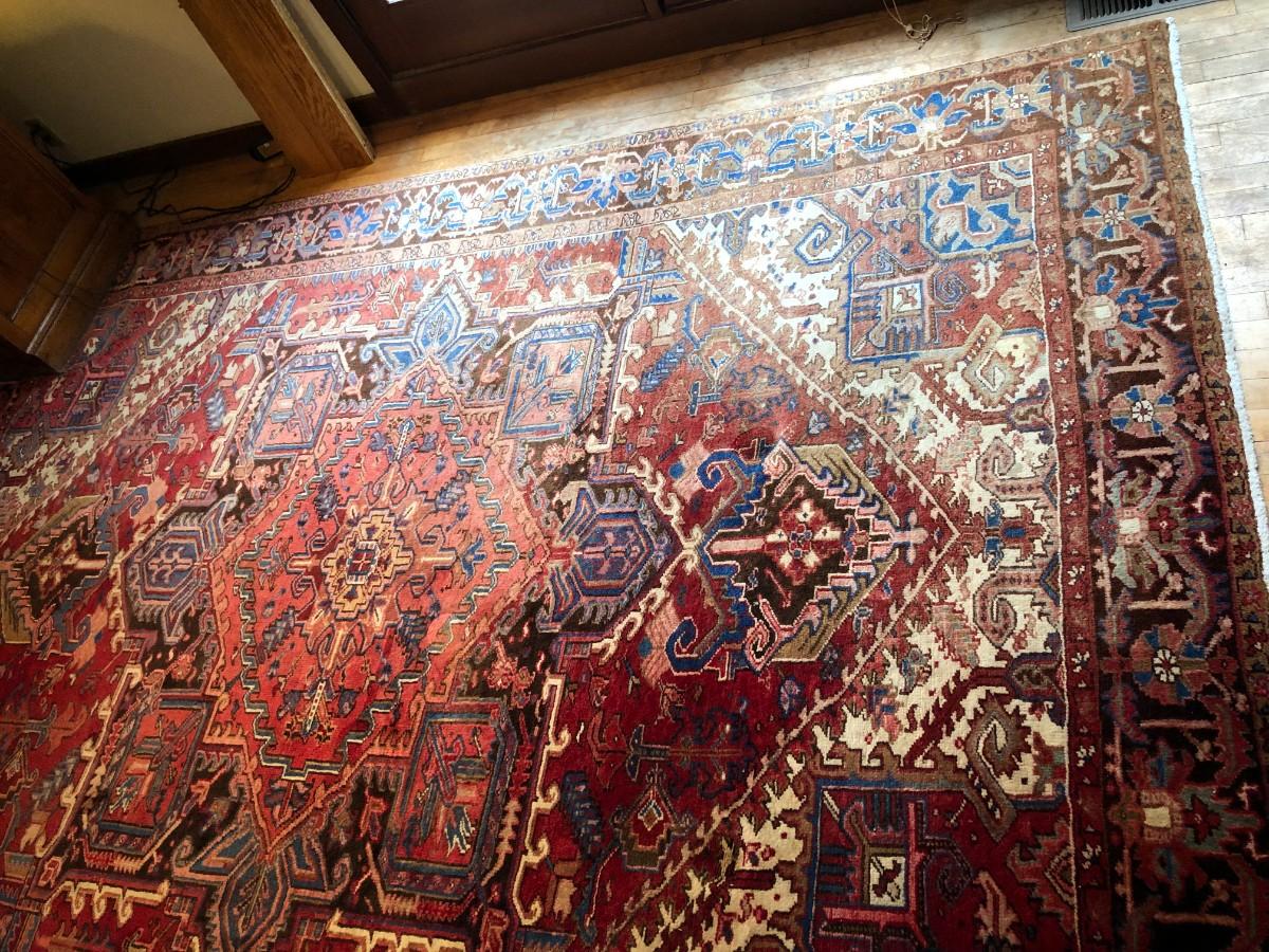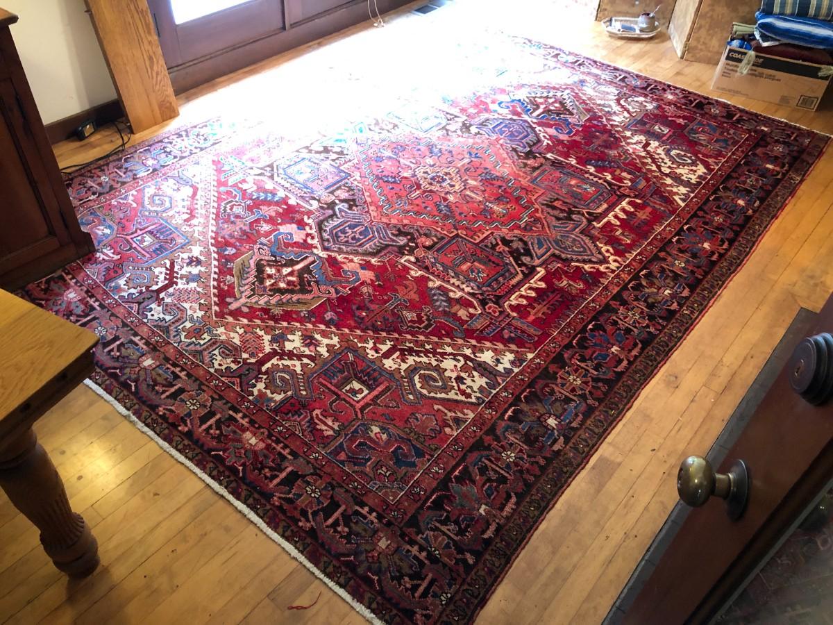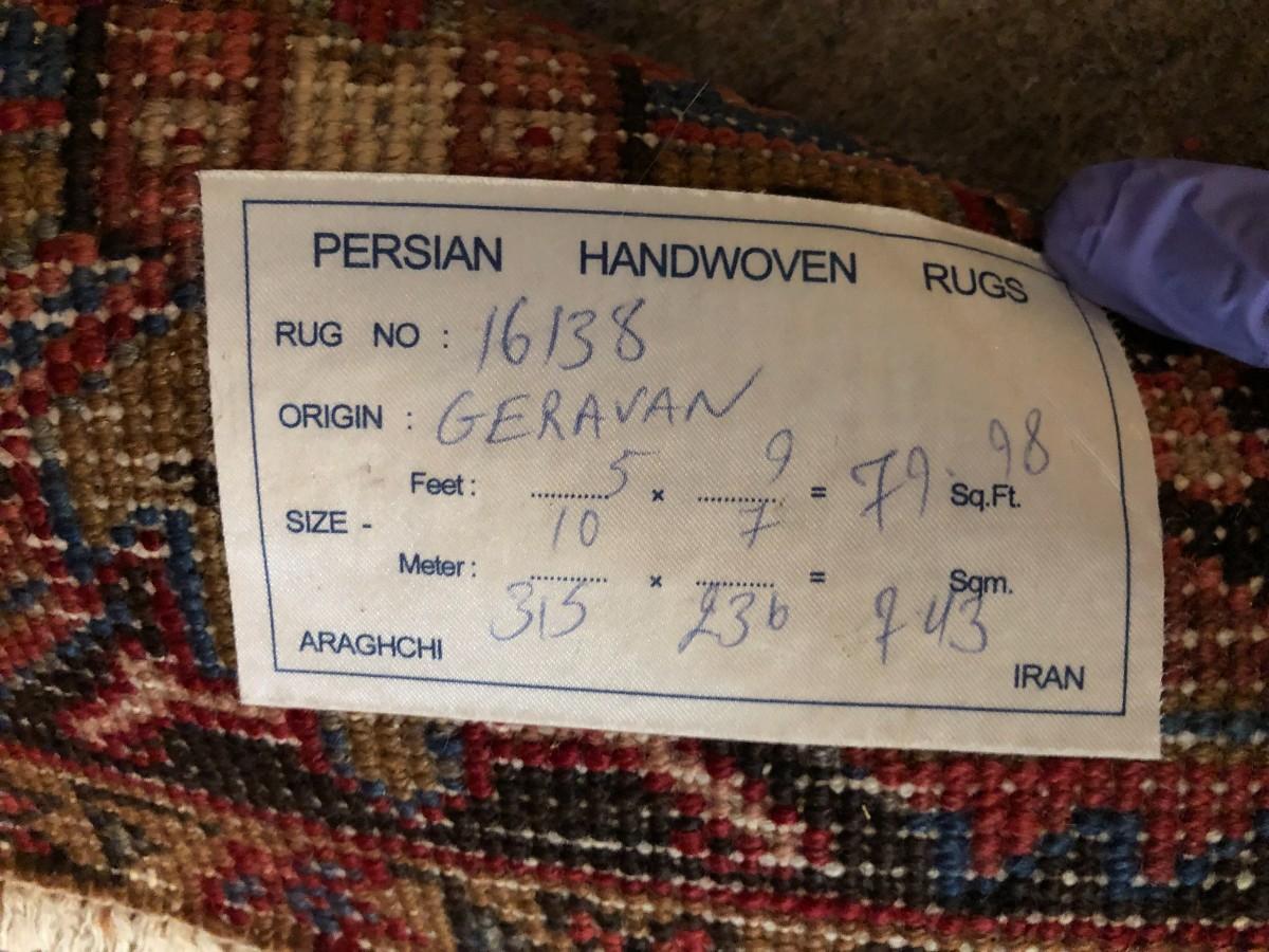 Beautiful hand woven Geravan rug made in Iran. Traditional persian design. One corner of the rug is faded from light exposure (shown in photos). In good condition.