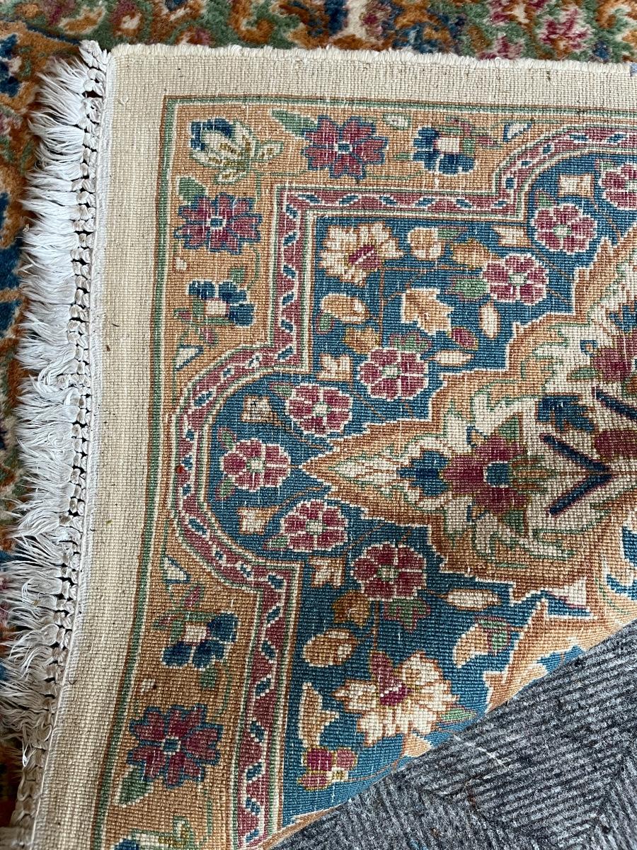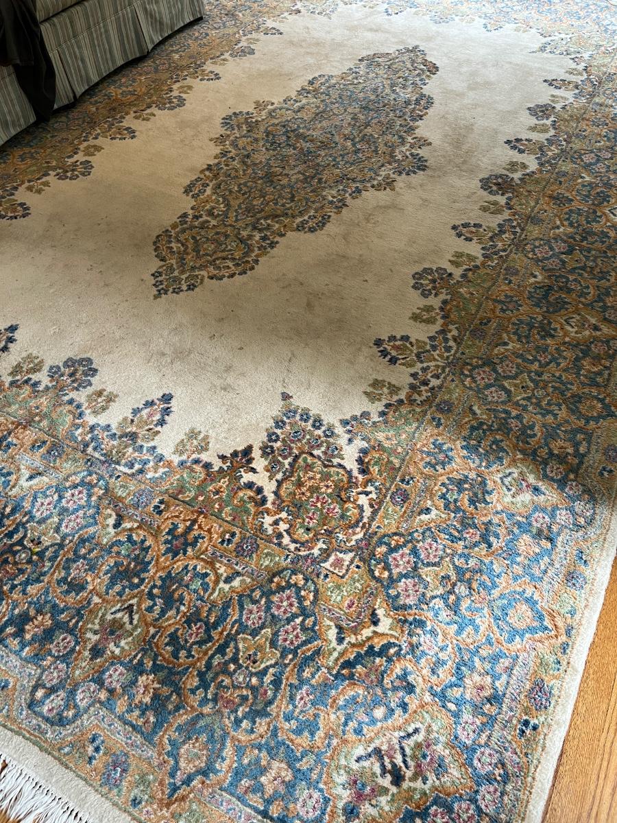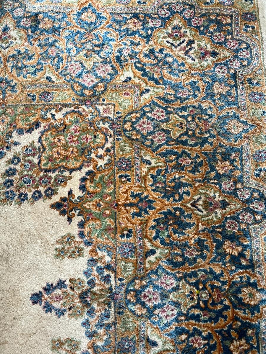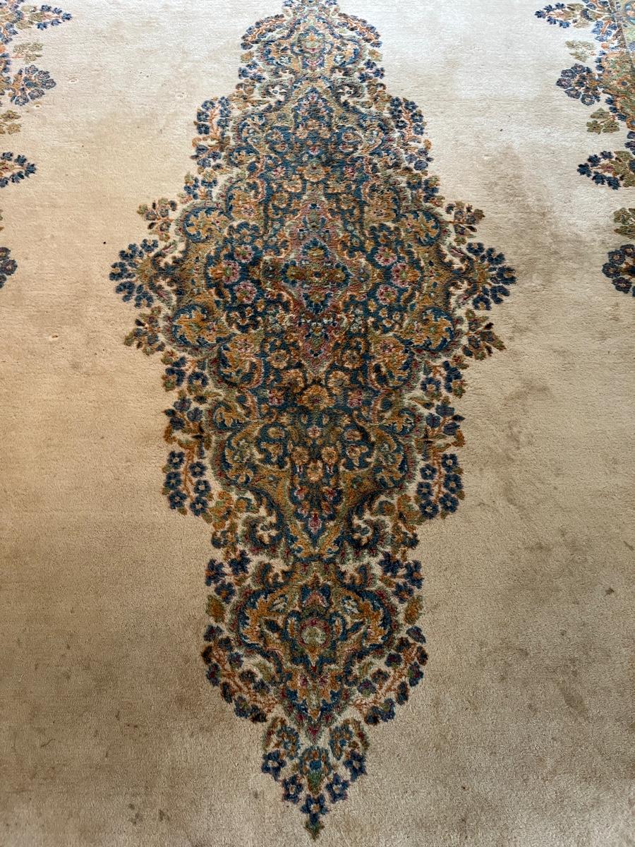 181"l x 117"w (15'l x 9.75'w)--beautiful hand-woven Kerman rug, 1980s, ivory background with blue, pink, green and gold medallions and borders. Some surface dirt, but otherwise very good condition.