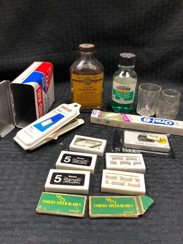 Vintage personal grooming products: razor blades mineral oil Band-Aids