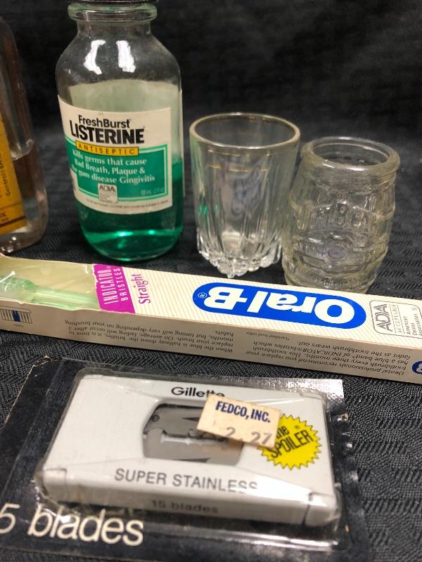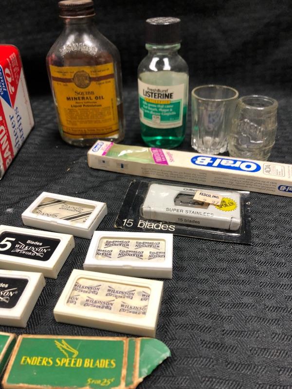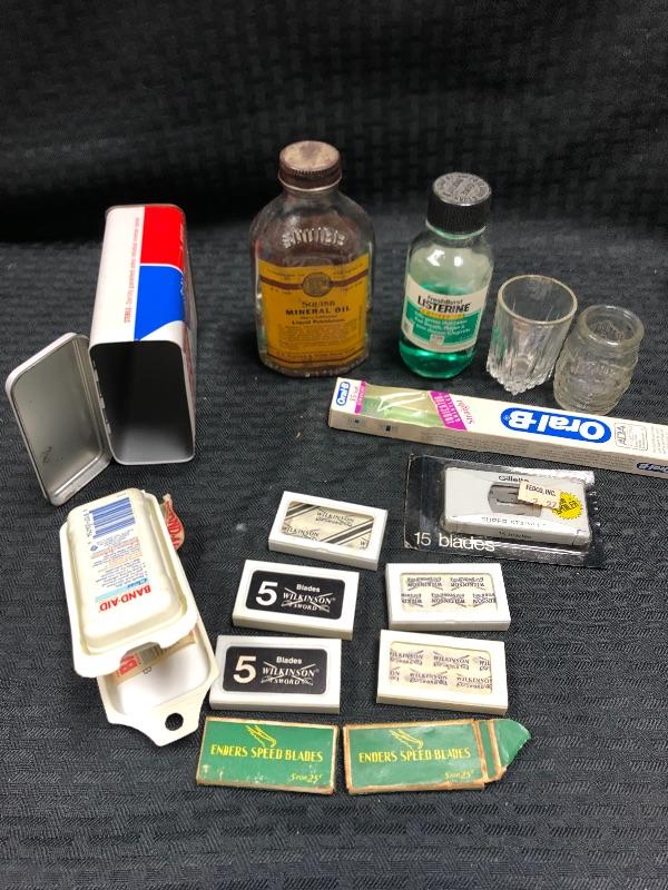 All in vintage condition, recommended for display only. Includes Band-Aid metal tin box, two shot glasses, toothbrush, a bunch of razor blades and a glass bottle of square mineral, and a bottle of fresh burst Listerine..