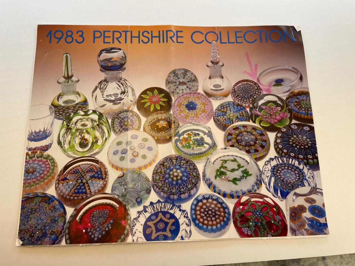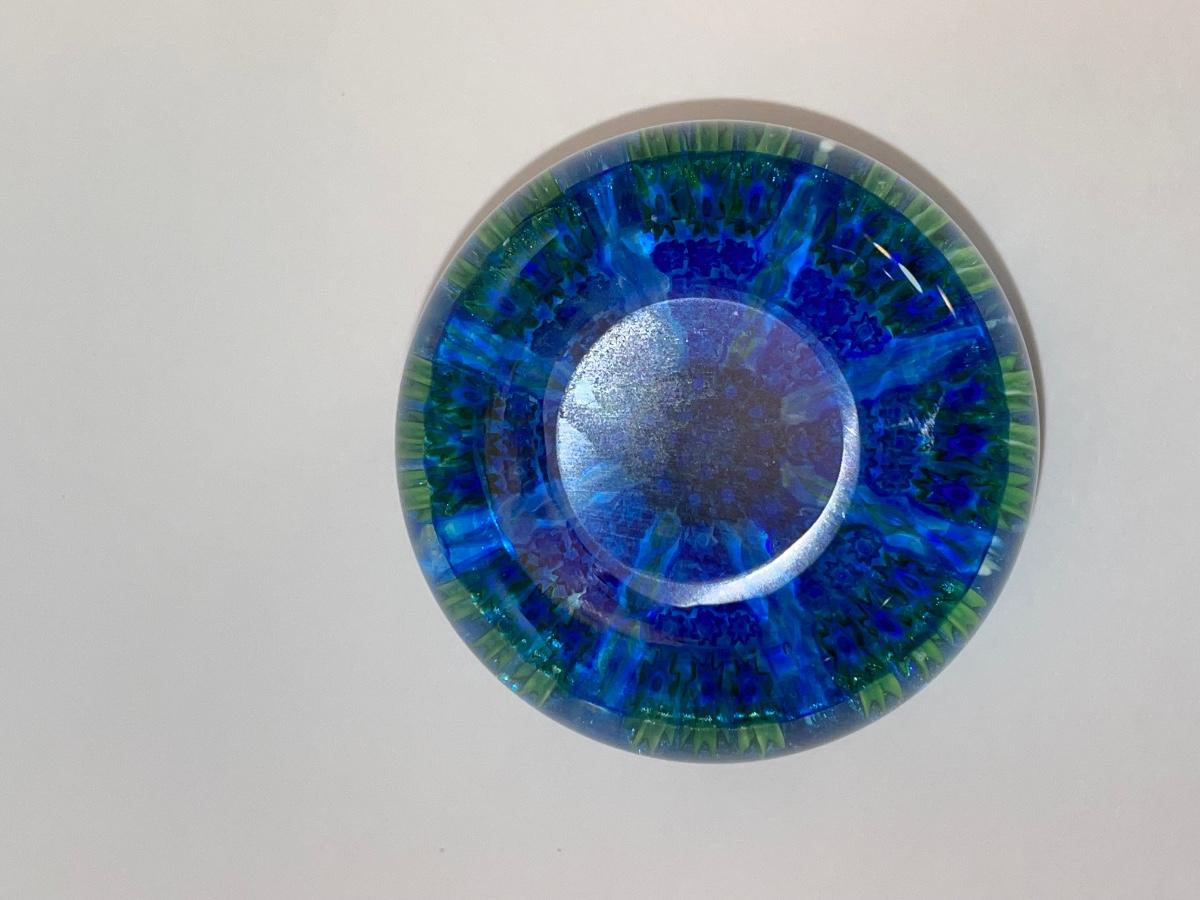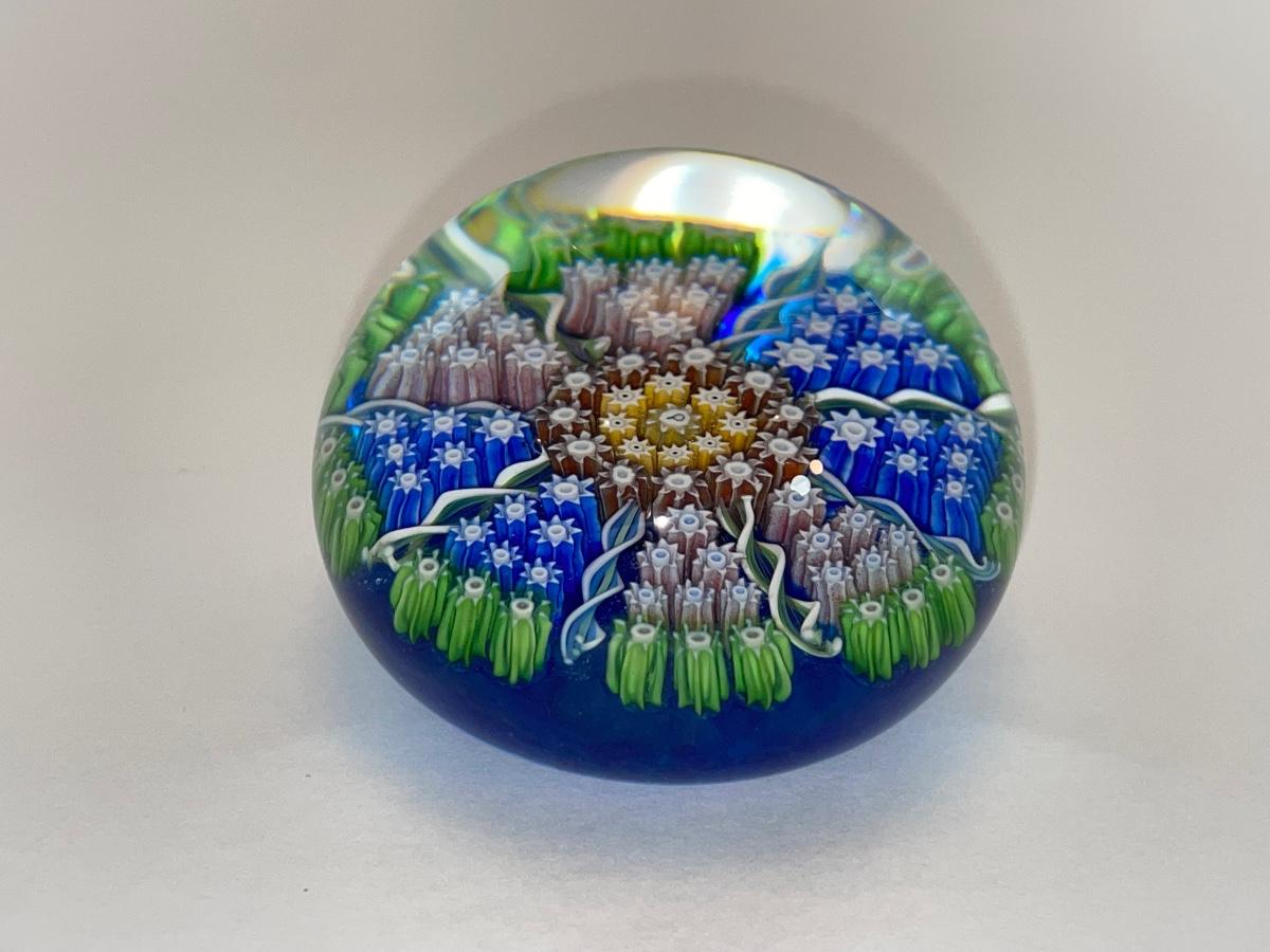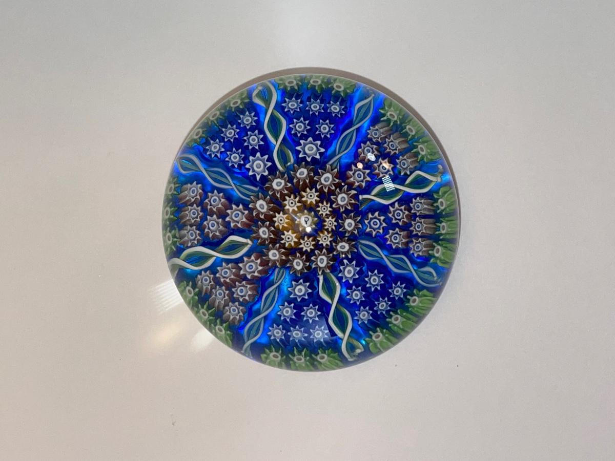 1983 Perthshire patterned millefiori divided by latticinio spokes. The design, which centers on a "P"signature cane, is set on a blue translucent ground. 2 1/2" x 1 3/4"