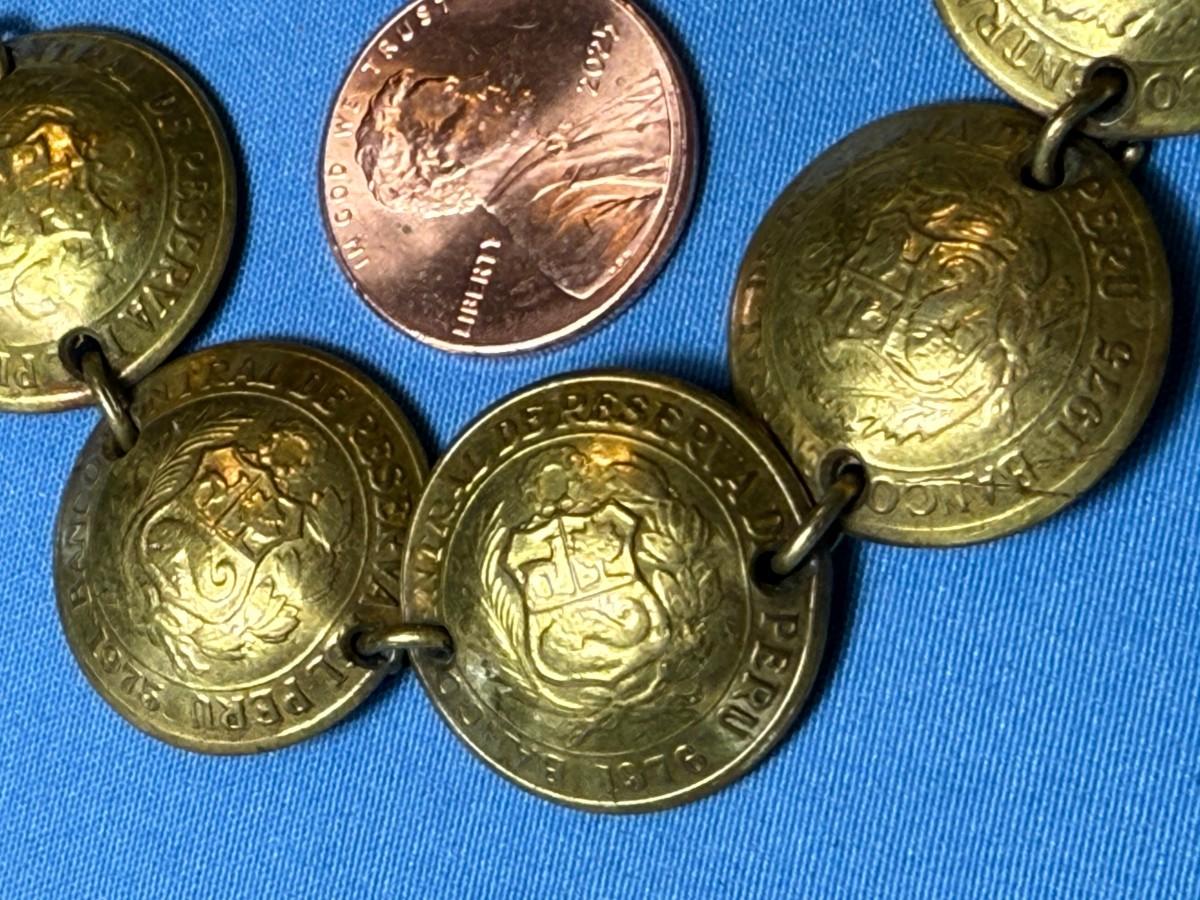 Vintage Peruvian Brass Coin Bracelet 7" from the 1970s in Good Preowned Condition as Pic'd. $5 DOMESTIC SHIPPING.