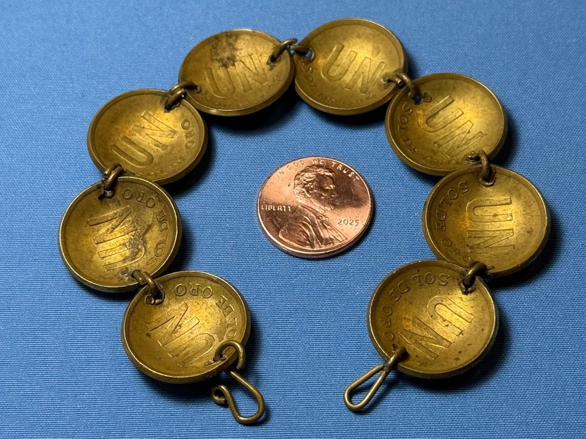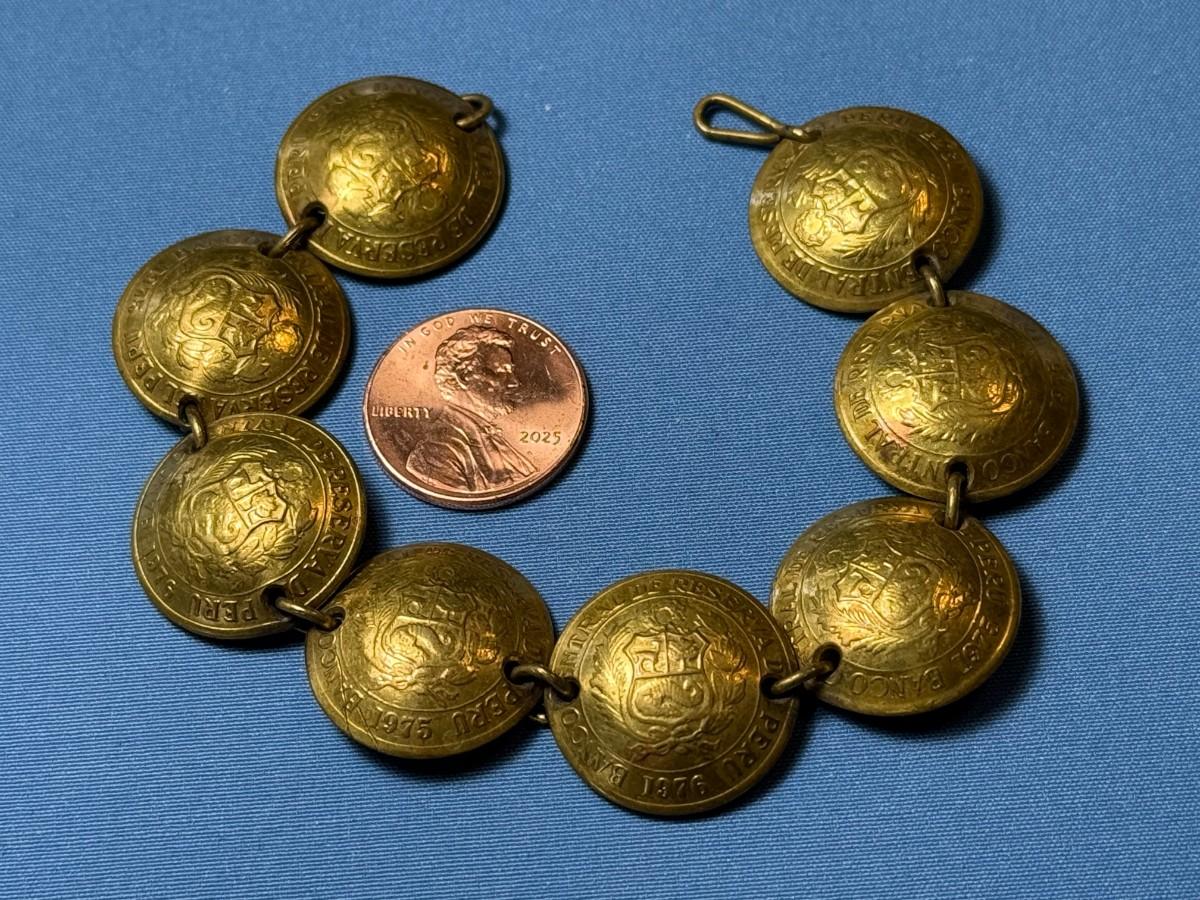 Vintage Peruvian Brass Coin Bracelet 7" from the 1970s in Good Preowned Condition as Pic'd.