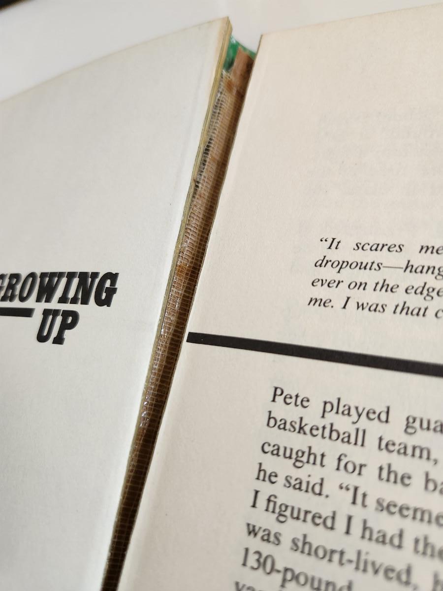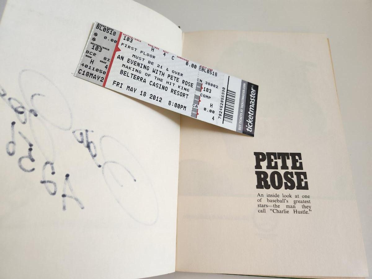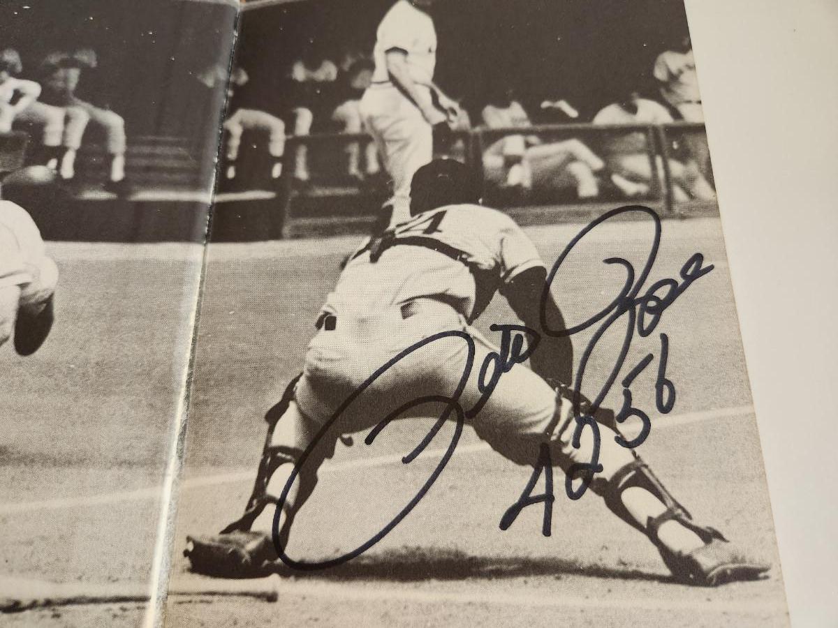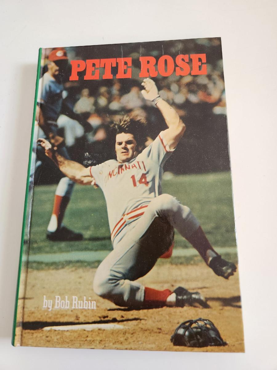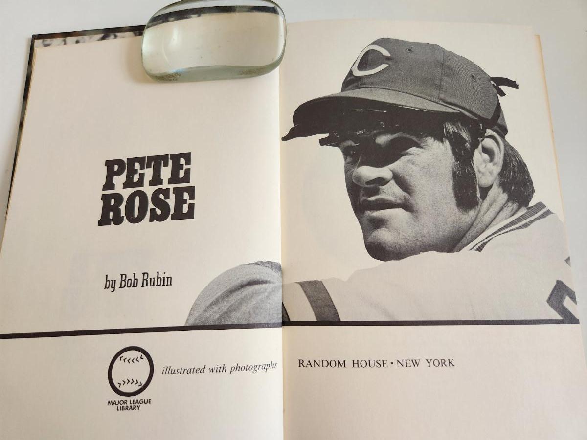 This auction lot is for a Vintage Pete Rose Book Signed by Pete Rose. This book was written by Bob Rubin for a series of books published in 1975 by Random House for the Major League Library. This vintage book was autographed at a "Signing Event" held on May 18, 2012. The ticket for that event is included as a page marker. Note: the book has not aged well and the binding has dried and is coming lose at the spine. Needs a good shot of glue to tighten. The signature is authentic and a nice item of baseball memorabilia.