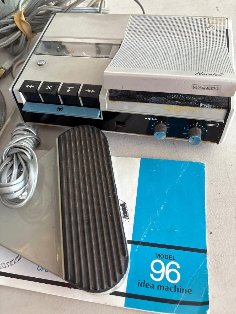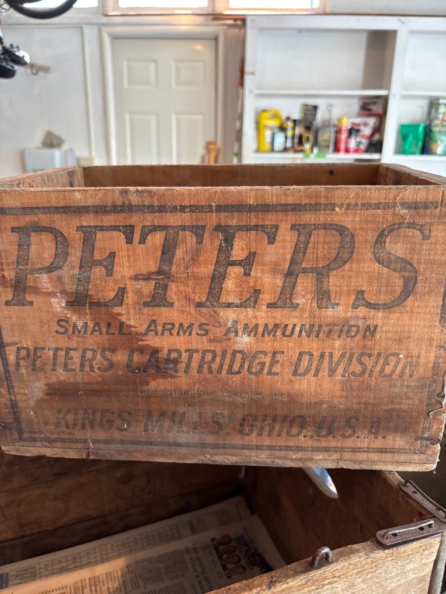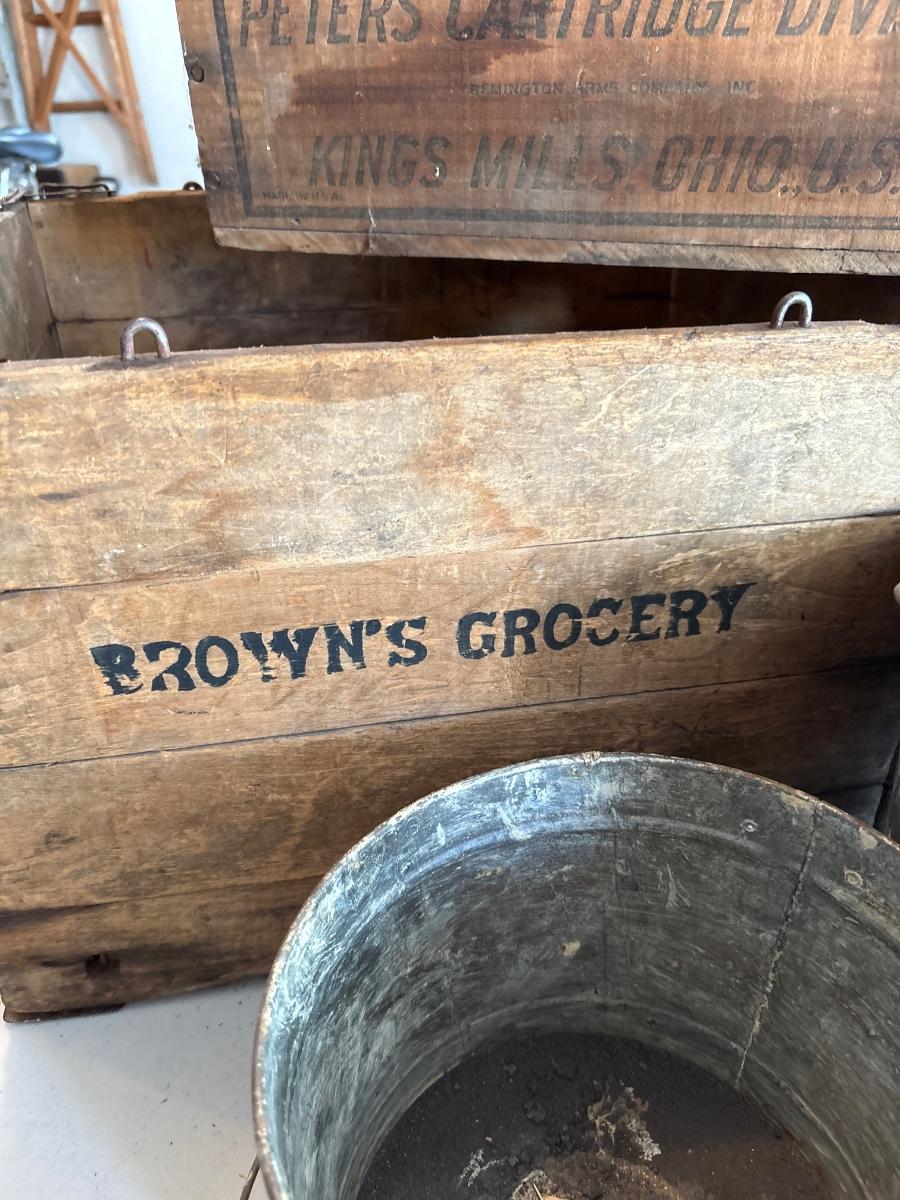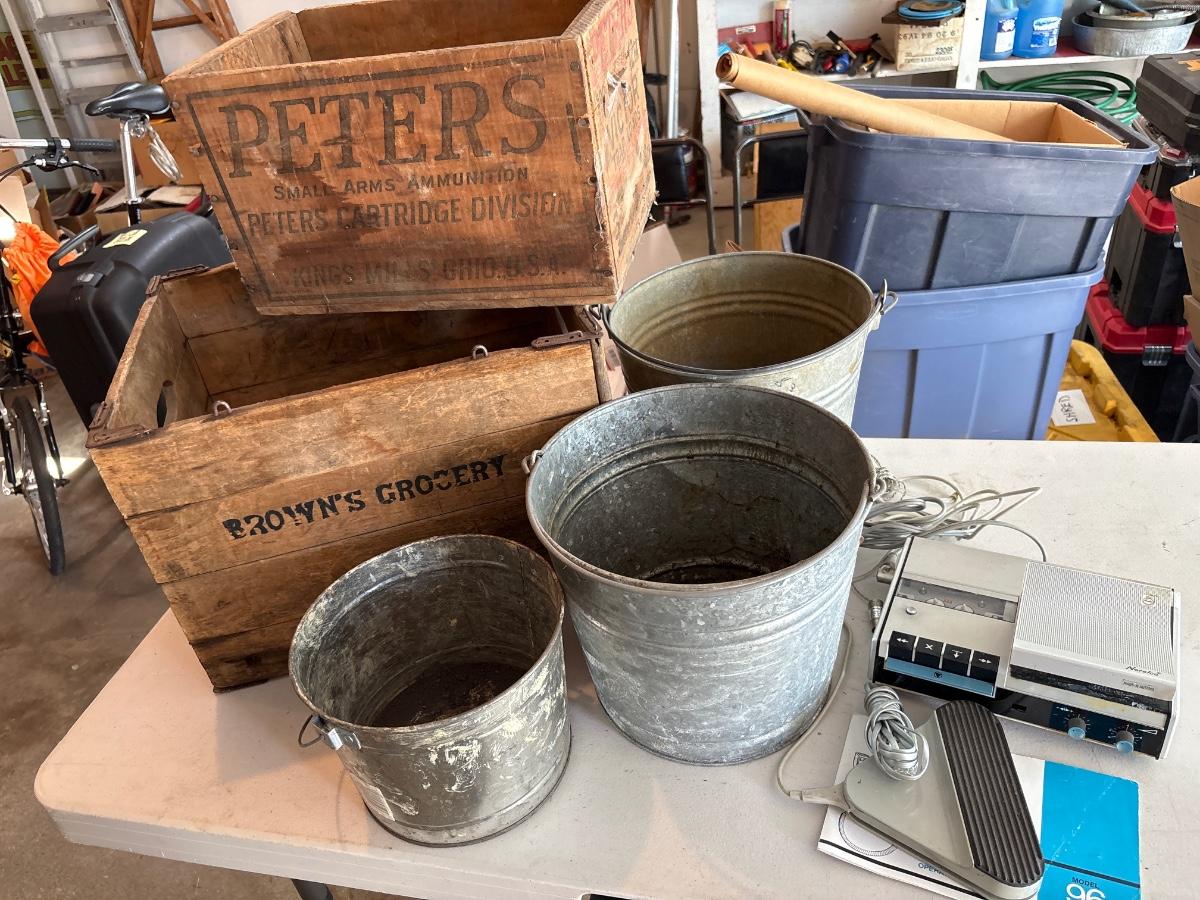 Vintage Peter’s Ammmunition box, Brown’s grocery wood box, metal pail, and vintage dictation machine