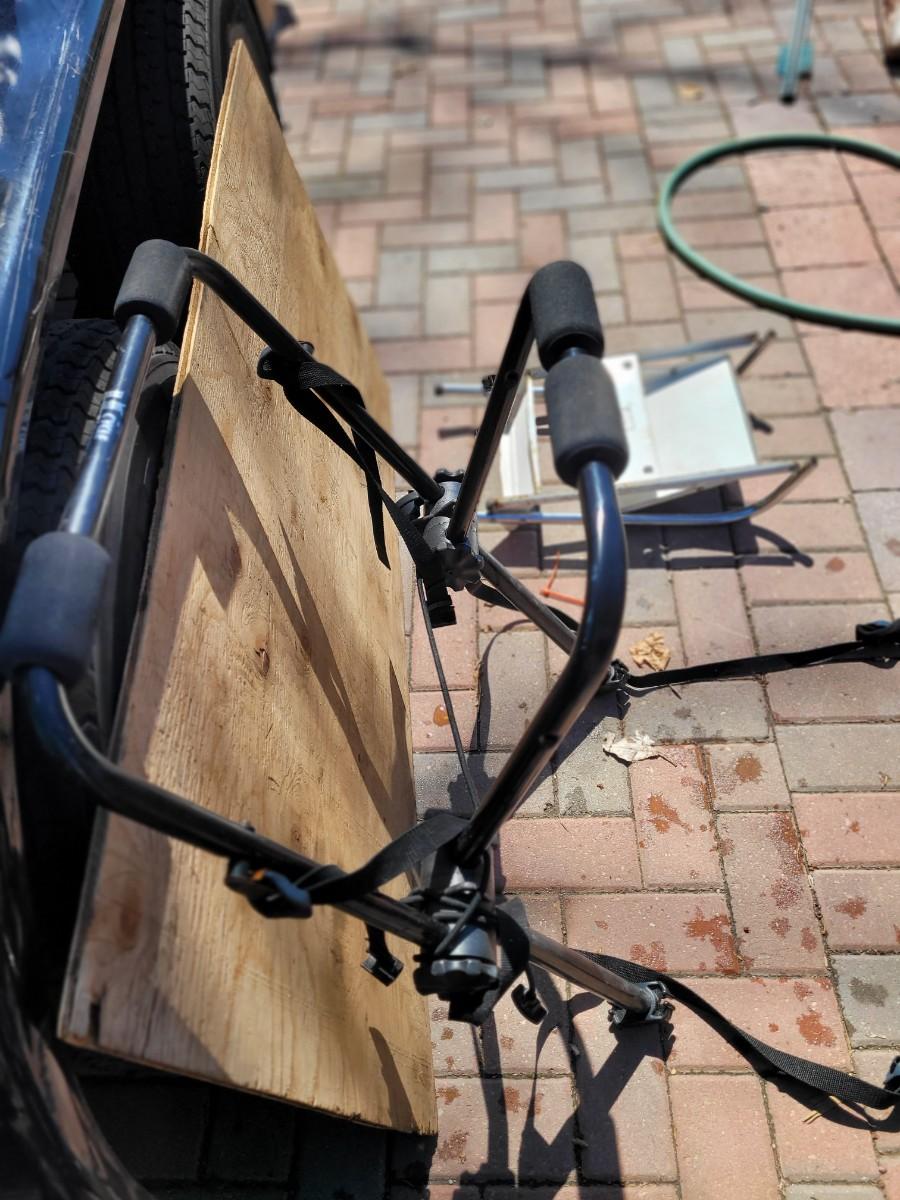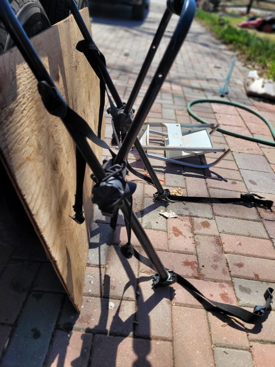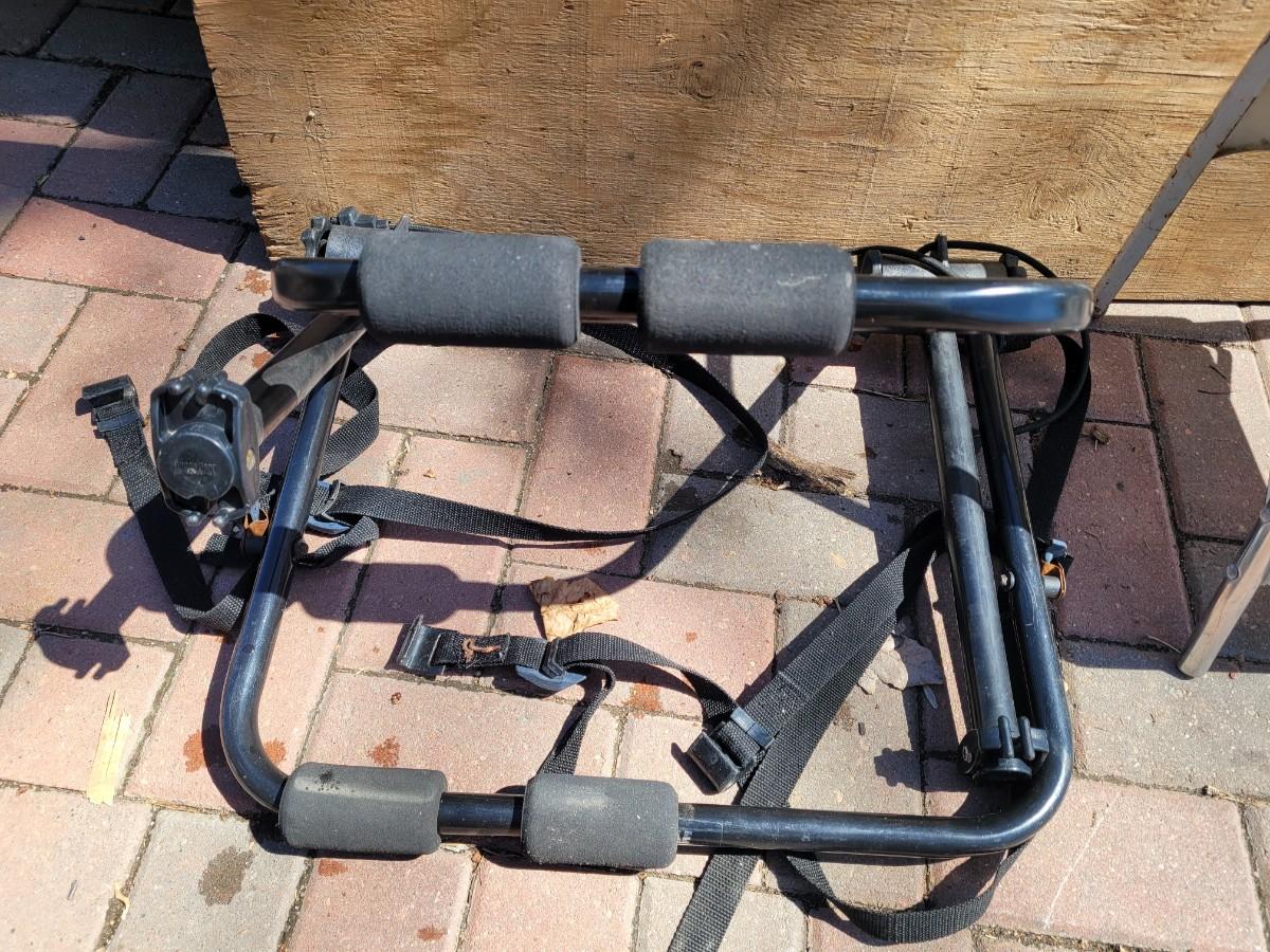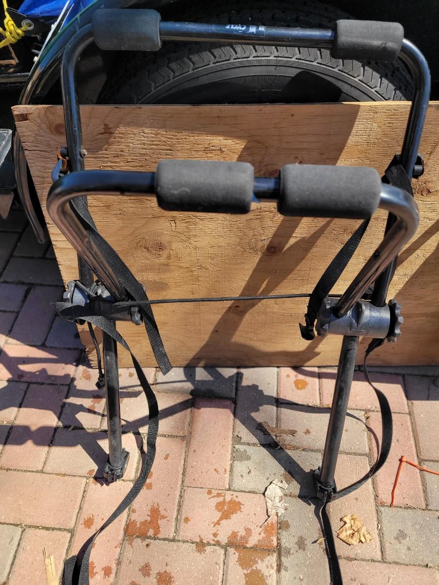 Step ladder is smaller, first step is five and a half inches tall and the second step is just over 11 in. The bike carrier seems to be complete amd does adjust and does have all the straps.