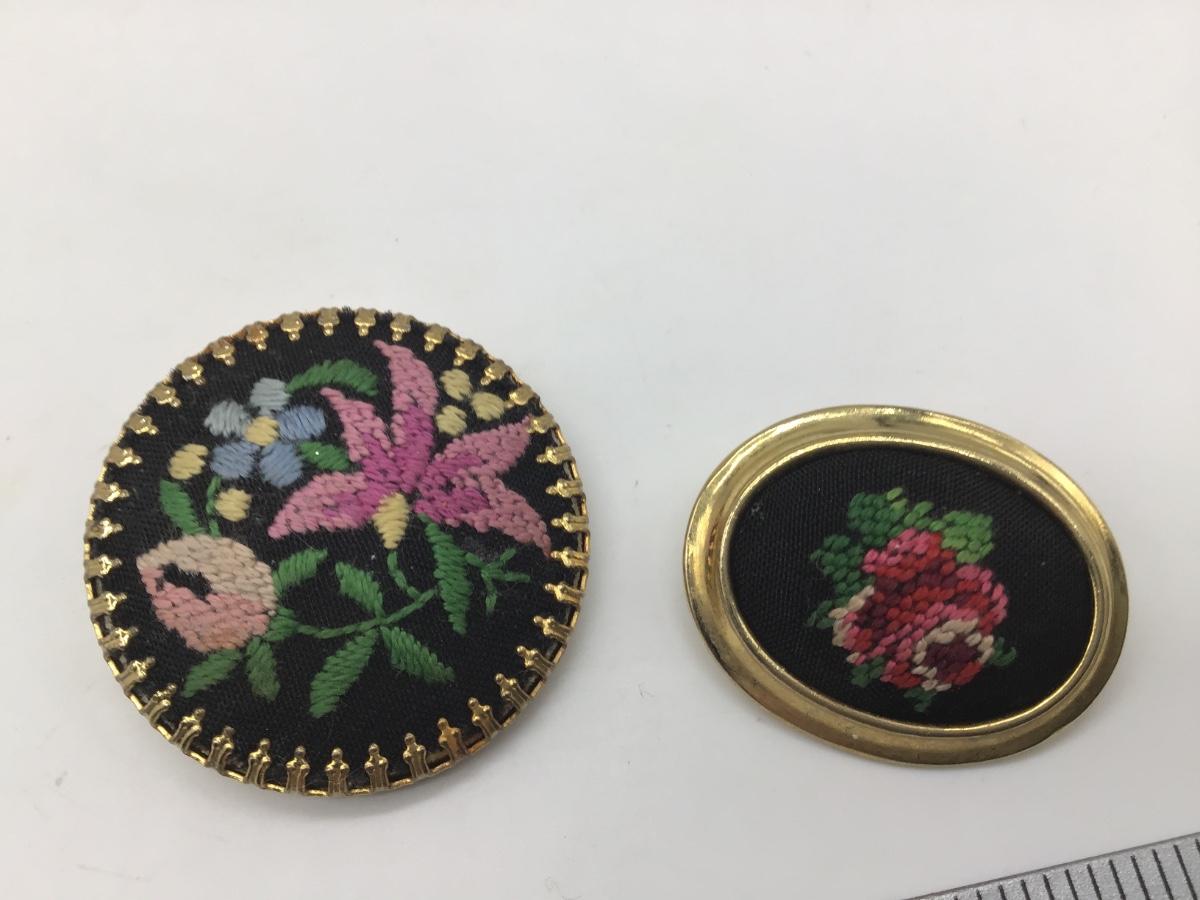 Vintage Petit Point Embroidered Pin Brooch’s Gold Tone Bezel