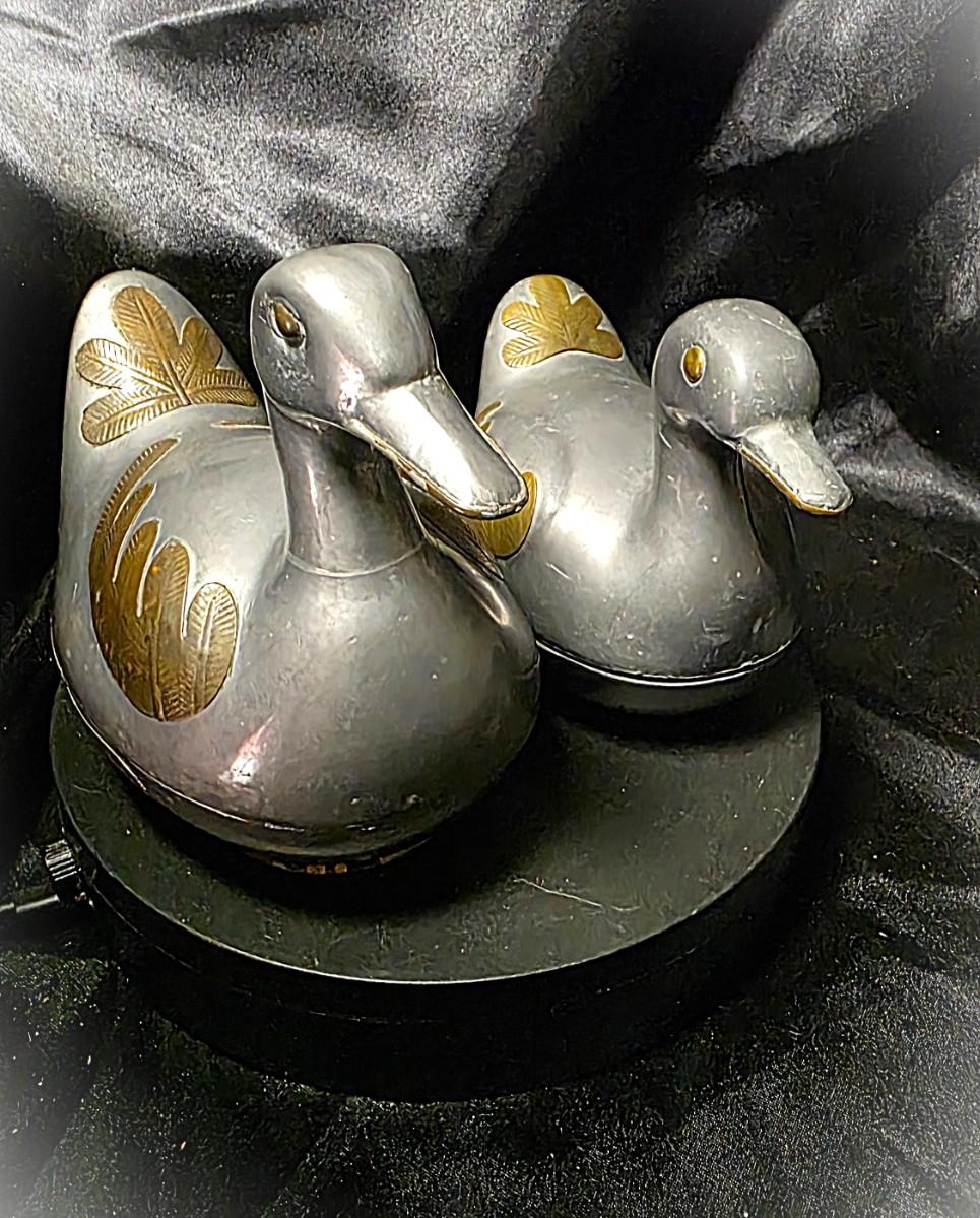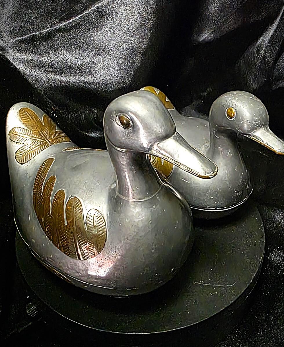 Cast in smooth pewter with warm brass accents, each duck features delicately detailed wings, tail feathers, eyes, and beak that catch the light subtly as you move around them. The form is rounded and tactile, inviting the hand, while the hinged construction allows the top half of each duck to lift open, revealing a hidden interior space once intended for rings, coins, or keepsakes that mattered enough to be tucked away.