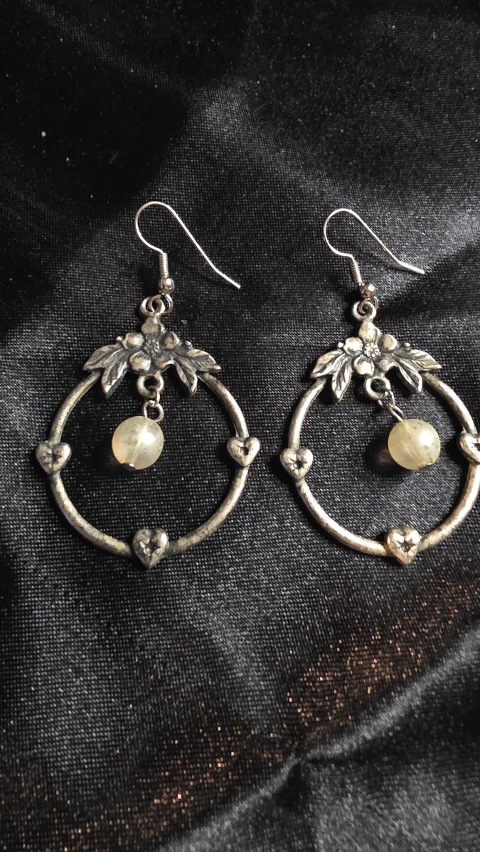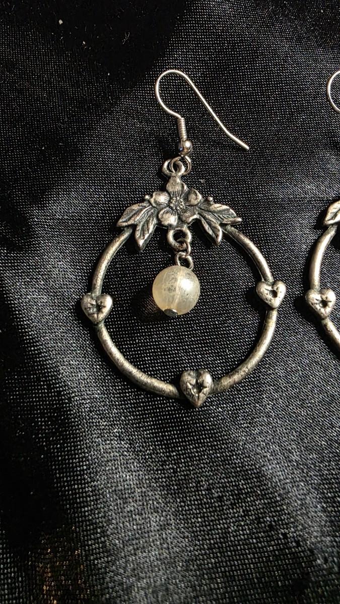 In the silver hush of a moonlit garden, where night-blooming jasmine releases its secret perfume, a pair of pewter hoop earrings unfurls like ancient wreaths—each circle forged in antiqued silver tone, crowned with delicate leaves and blossoms that curl in quiet reverence, a single moonstone teardrop suspended at the center like dew caught on a petal, its milky glow shifting with every breath. The metalwork bears the soft patina of time, the hoops swaying gently from French wires that whisper against the ear, evoking the romance of forgotten arboretums and midnight confessions beneath star-drenched skies.
