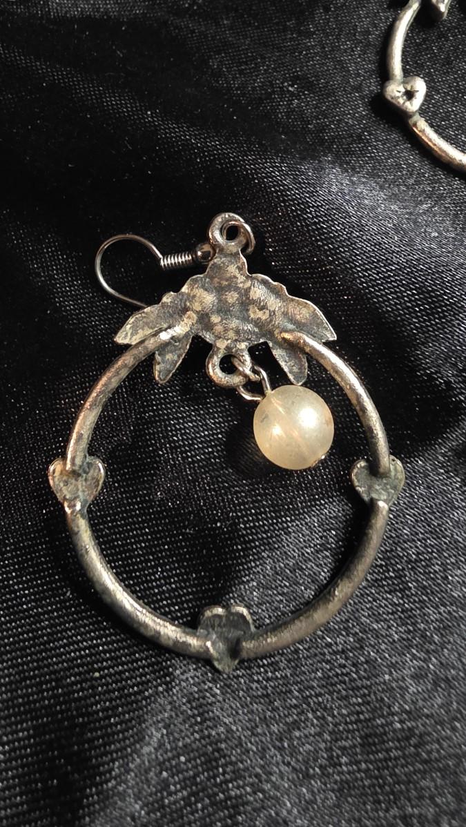 Vintage Pewter Floral Wreath Hoop Earrings with Moonstone Drop - Antiqued Silver Tone