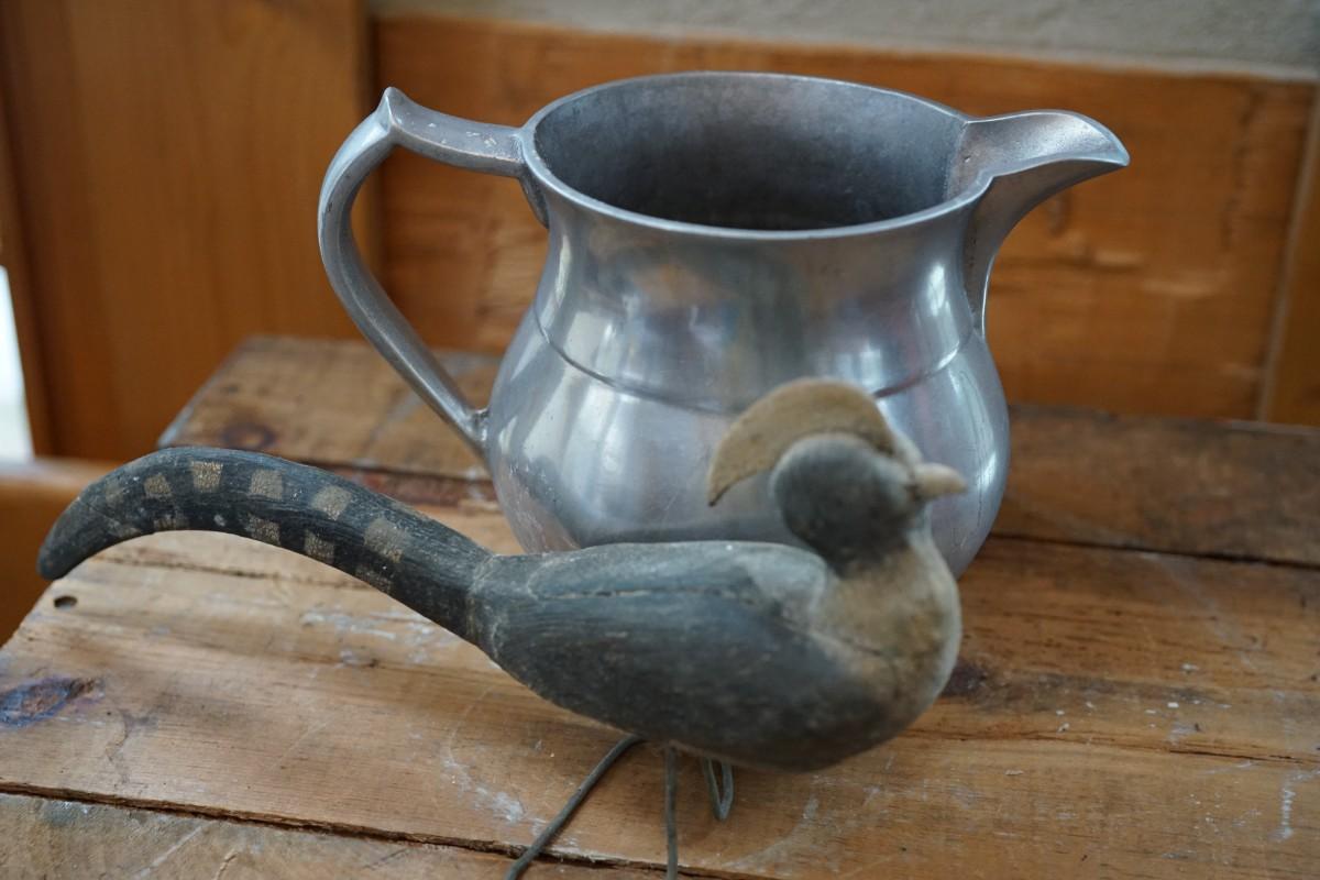VINTAGE PEWTER PITCHER OF 1 GALLON / EXCELLENT ANTIQUE FOLK ART PAINTED WOODEN BIRD