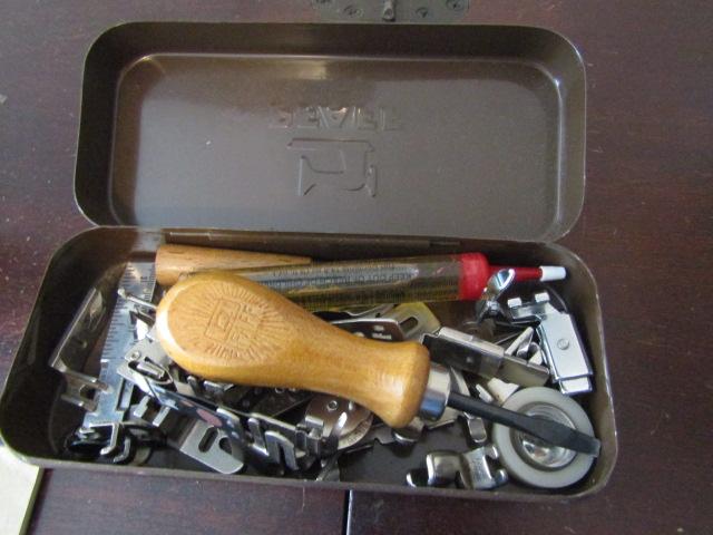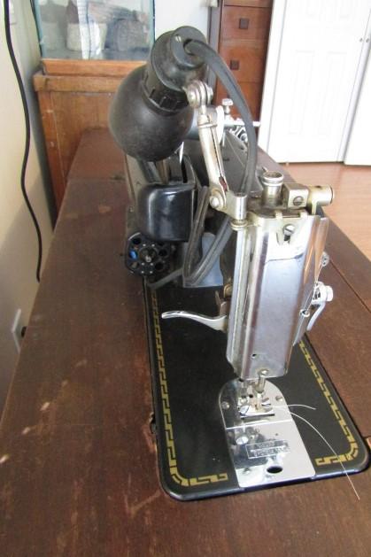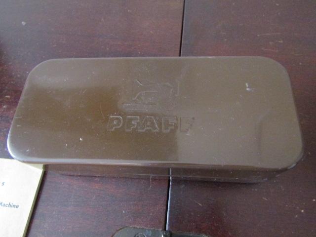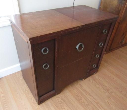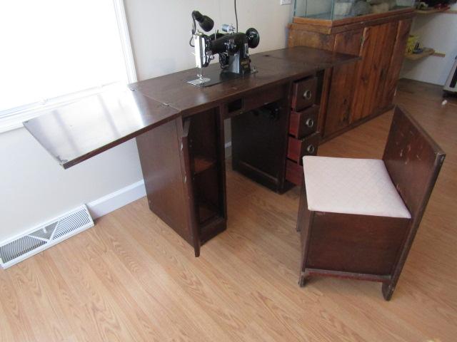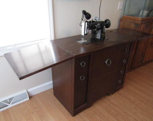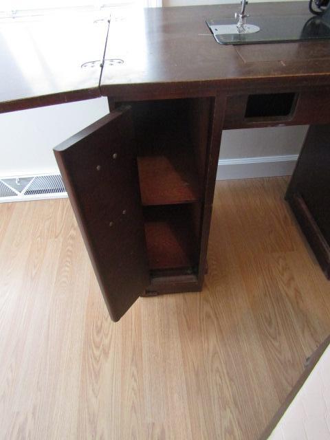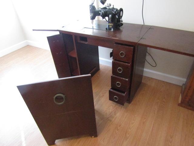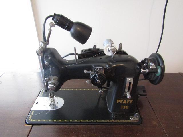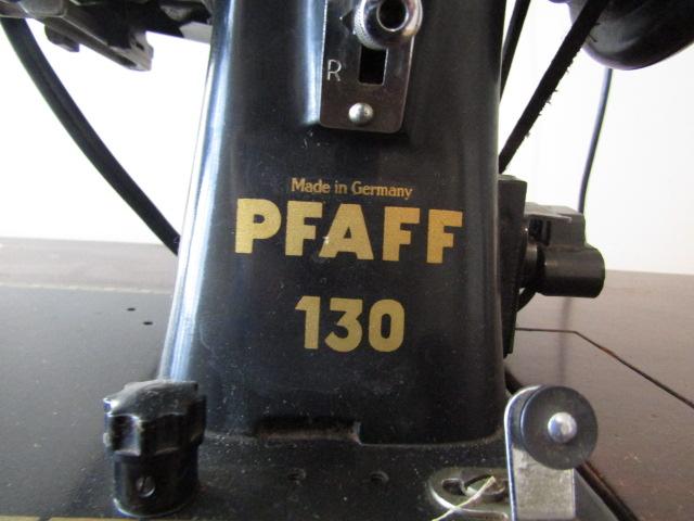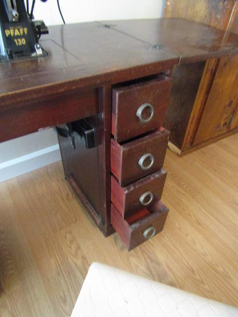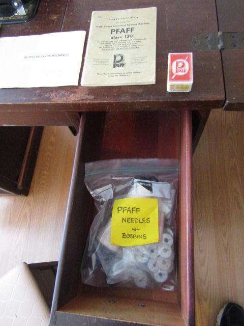 Vintage Pfaff 130 Sewing Machine with Extended Table Surface Work Cabinet. Please see pictures- Includes Instruction Booklets and Accessory Box. Cabinet has some scratching and small places of missing veneer.