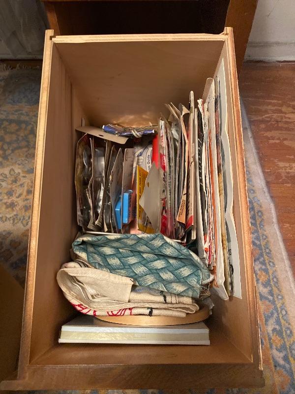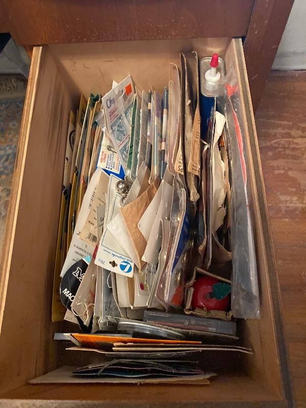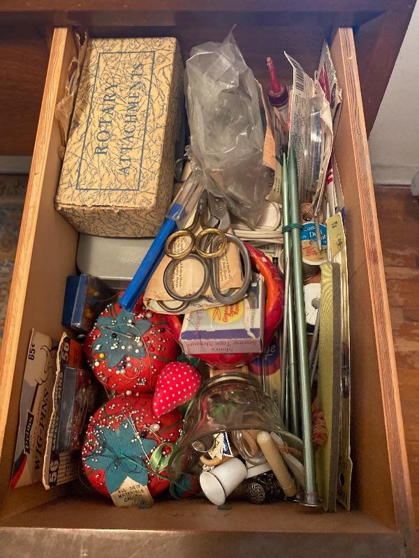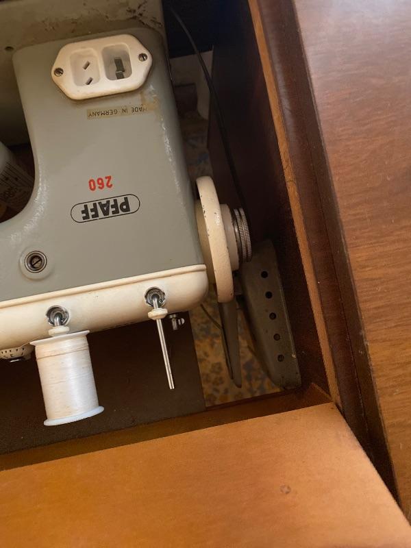Vintage PFAFF 260 sewing machine with sewing table and drawers packed full of vintage notions. Wheel turns but needle does not move, not sure if machine is working or not. Drawers are full of sewing notions. Did not find a power plug for the machine, will keep look out for it. Table closed is 31”x17.5” and 30.75” tall. Good condition. Few scratches to the surface.