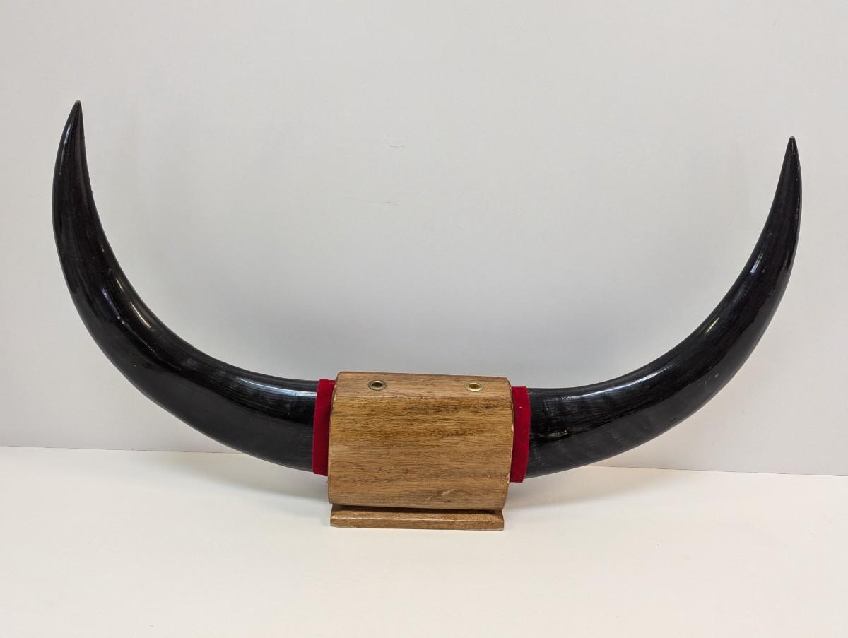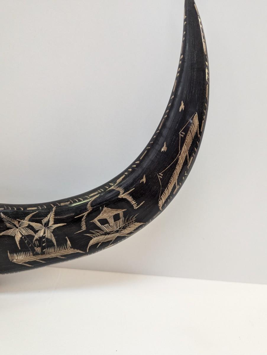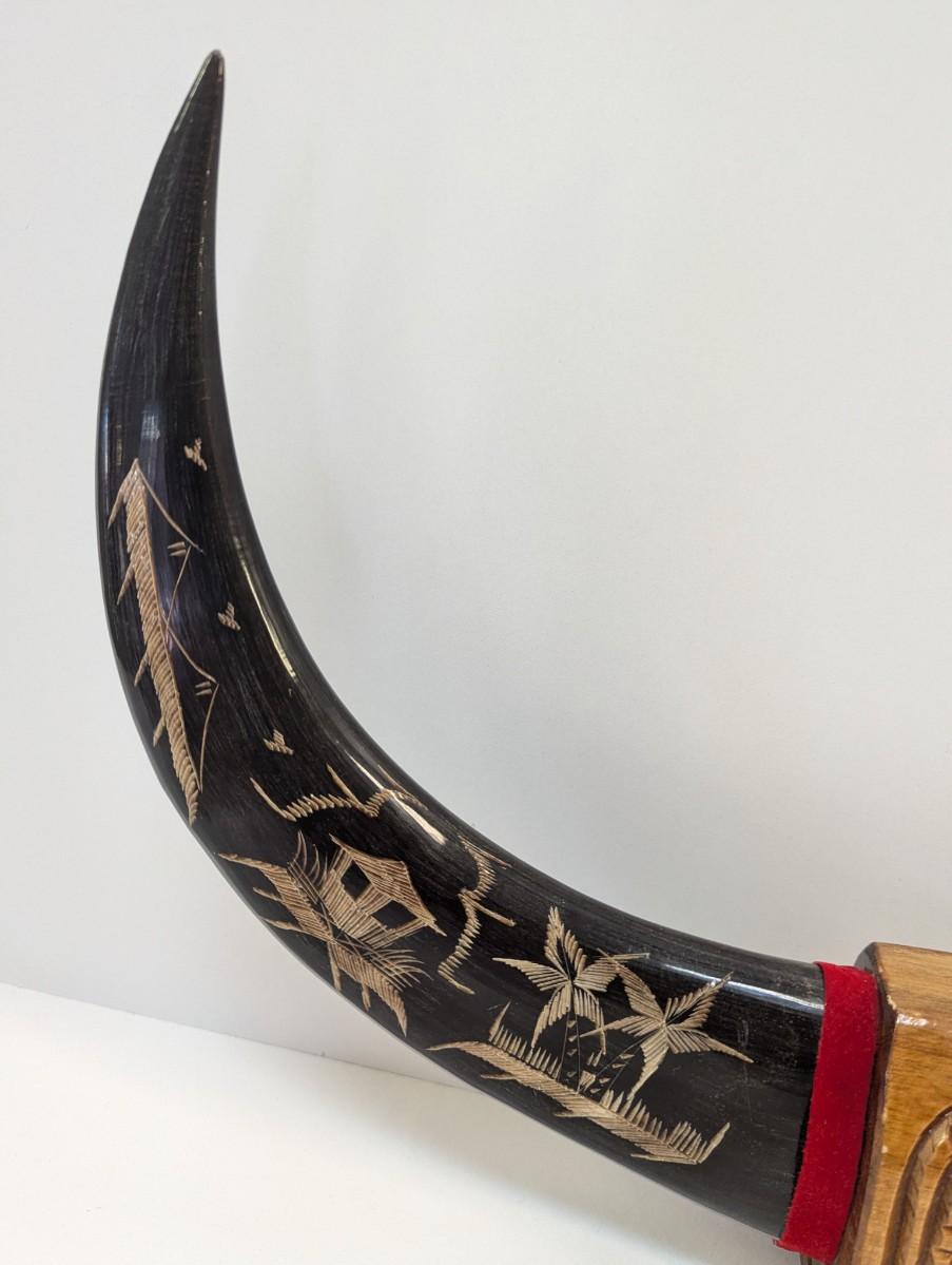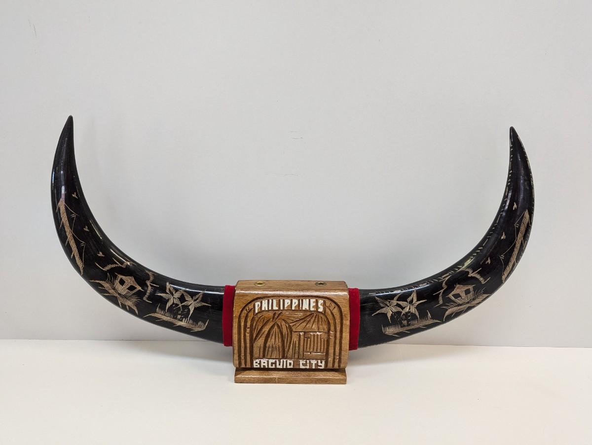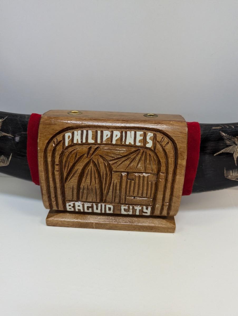 Vintage Philippines Wood Pen Pencil Holder Hand Carved & Engraved Horns