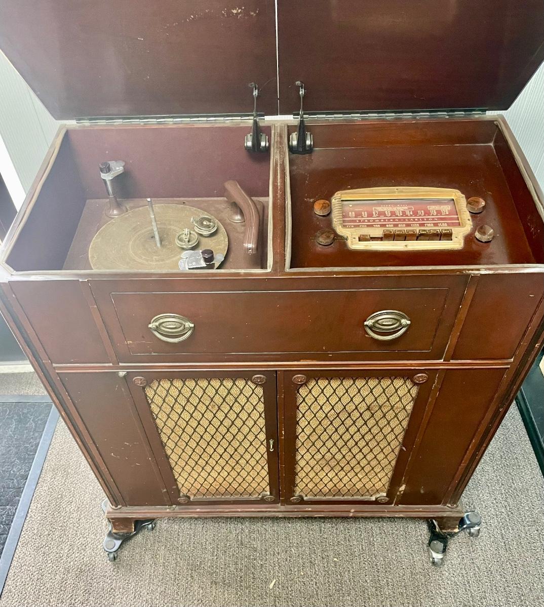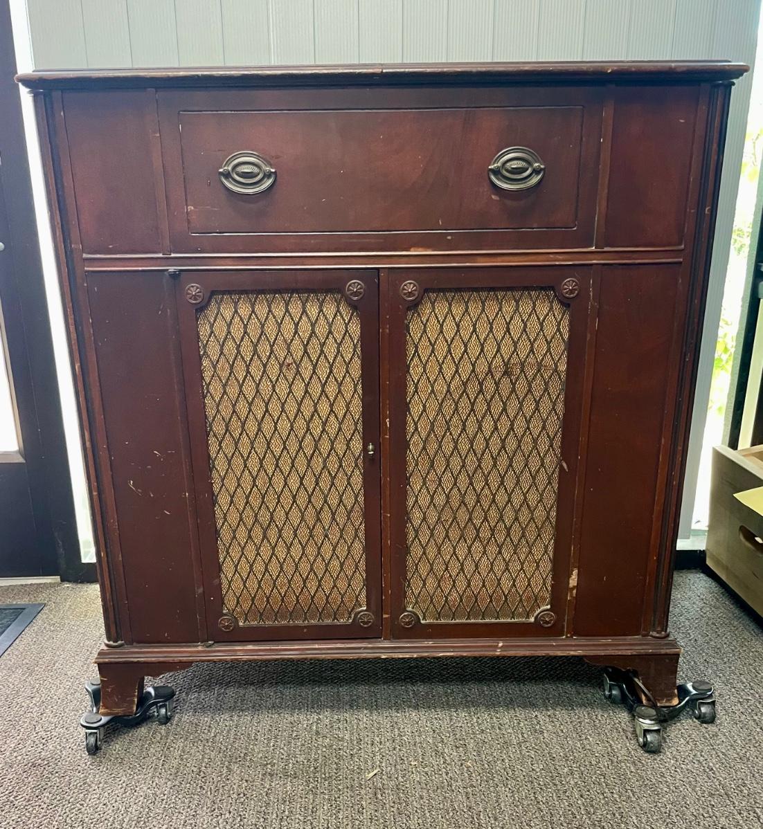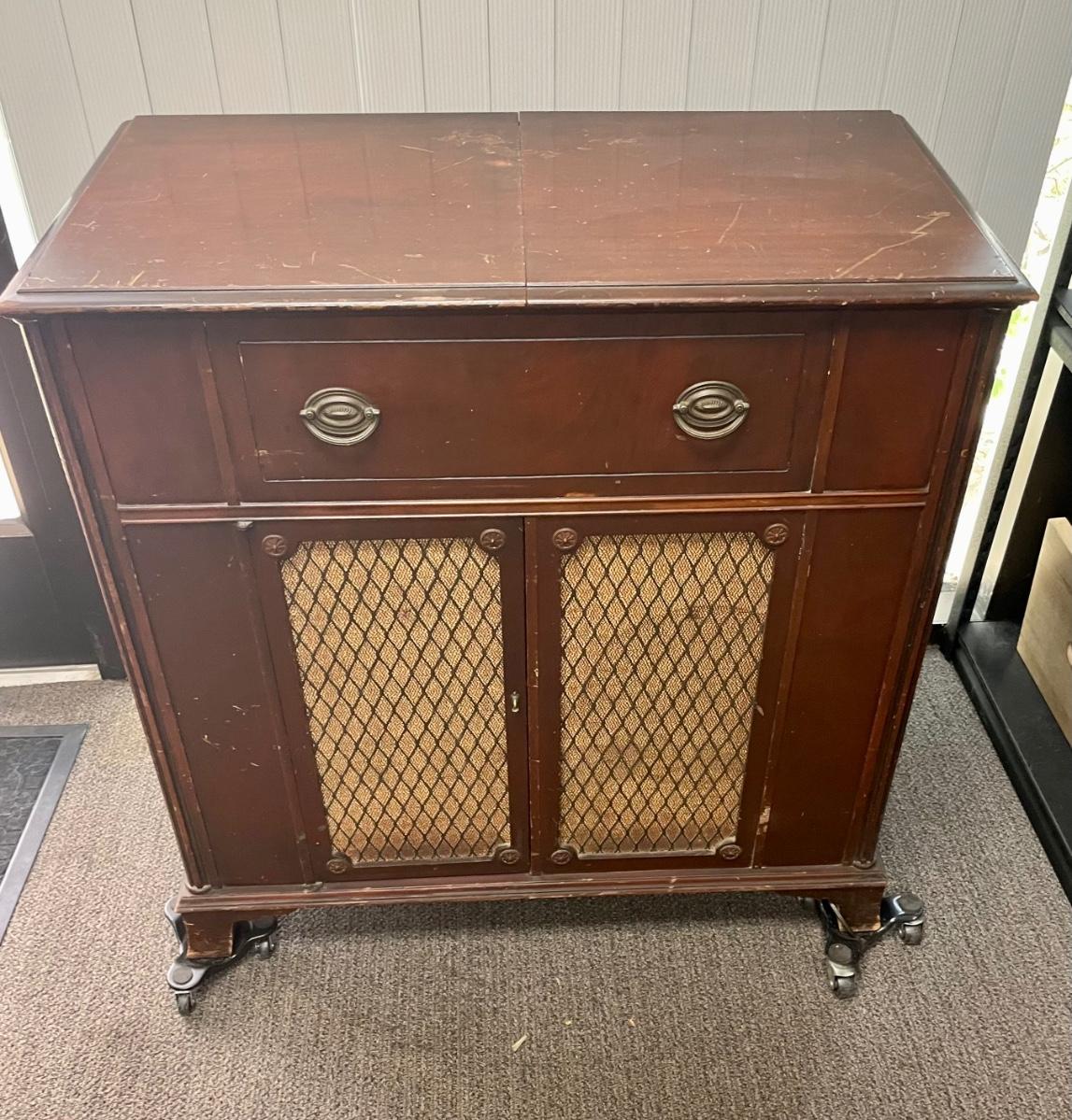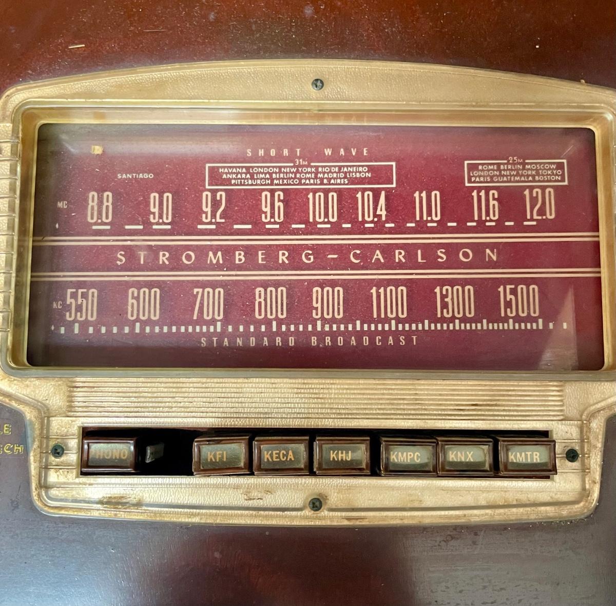 By Stromberg Carlson.. hardwood cabinet is in good overall condition but could use refinishing. Radio and phonograph are untested.