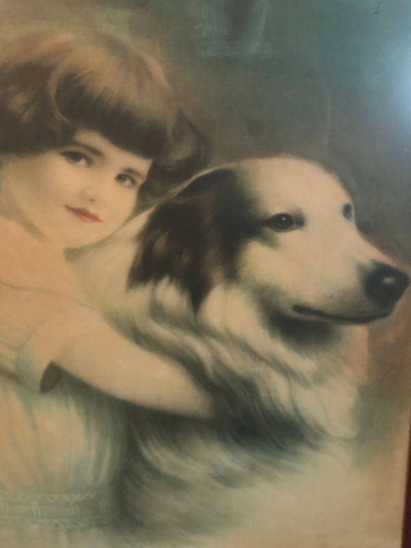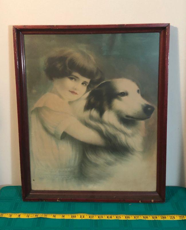 Vintage Girl with Dog art. Looks like a colorized photo sketch. Framed.