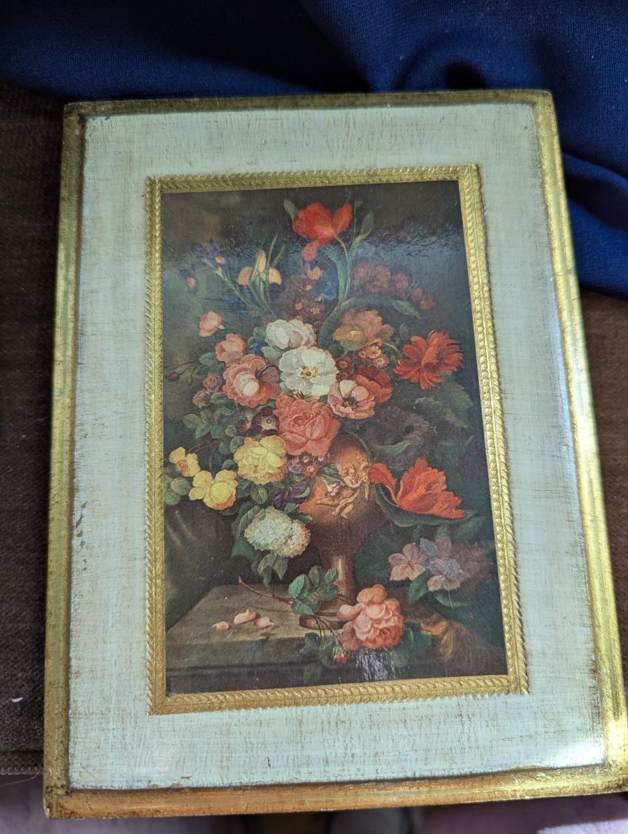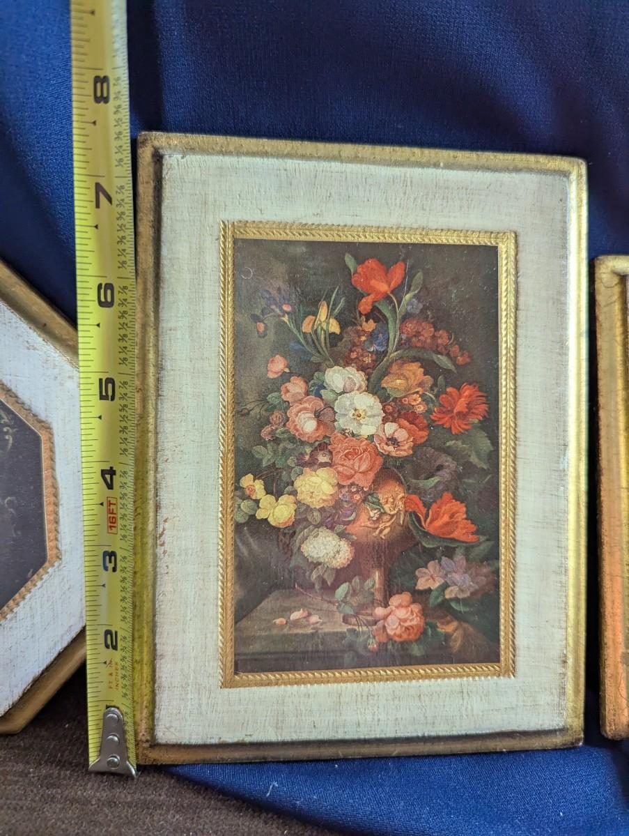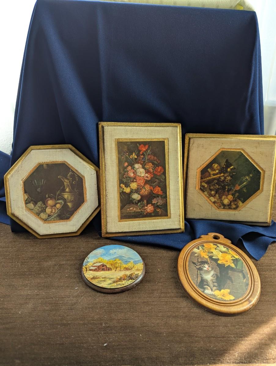 Some nice Wall Hangings, "Still Life with Flowers" by Franz Xaver Pieler Gold Guilt. Vintage Picture of Kitten With Daffodils,Florentine Fruit and Floral print Gilded Edges with Paper Art, Florentine Water Pitcher and Fruit Gilded Edges, Small Round Wooden Wall Hanging Barn Scene Painted by Gladys Estes.