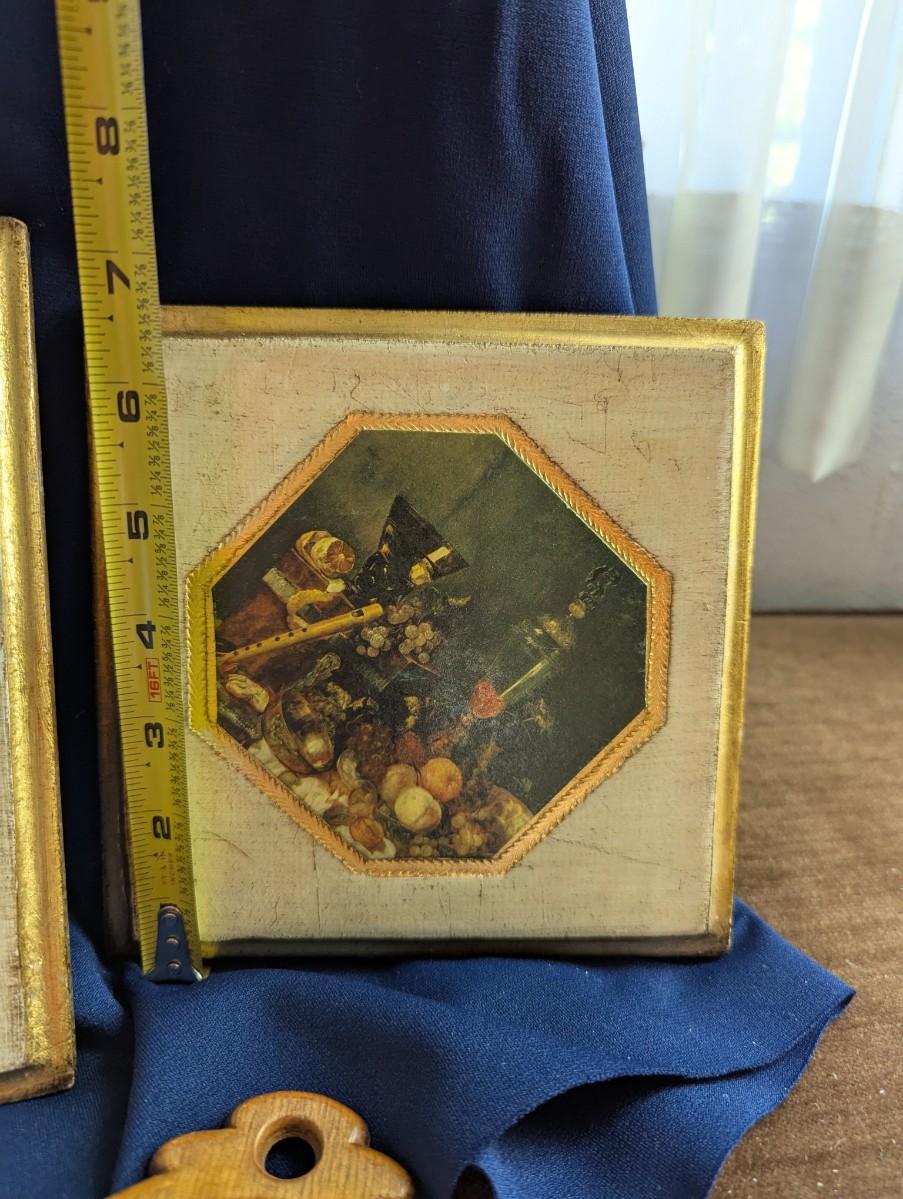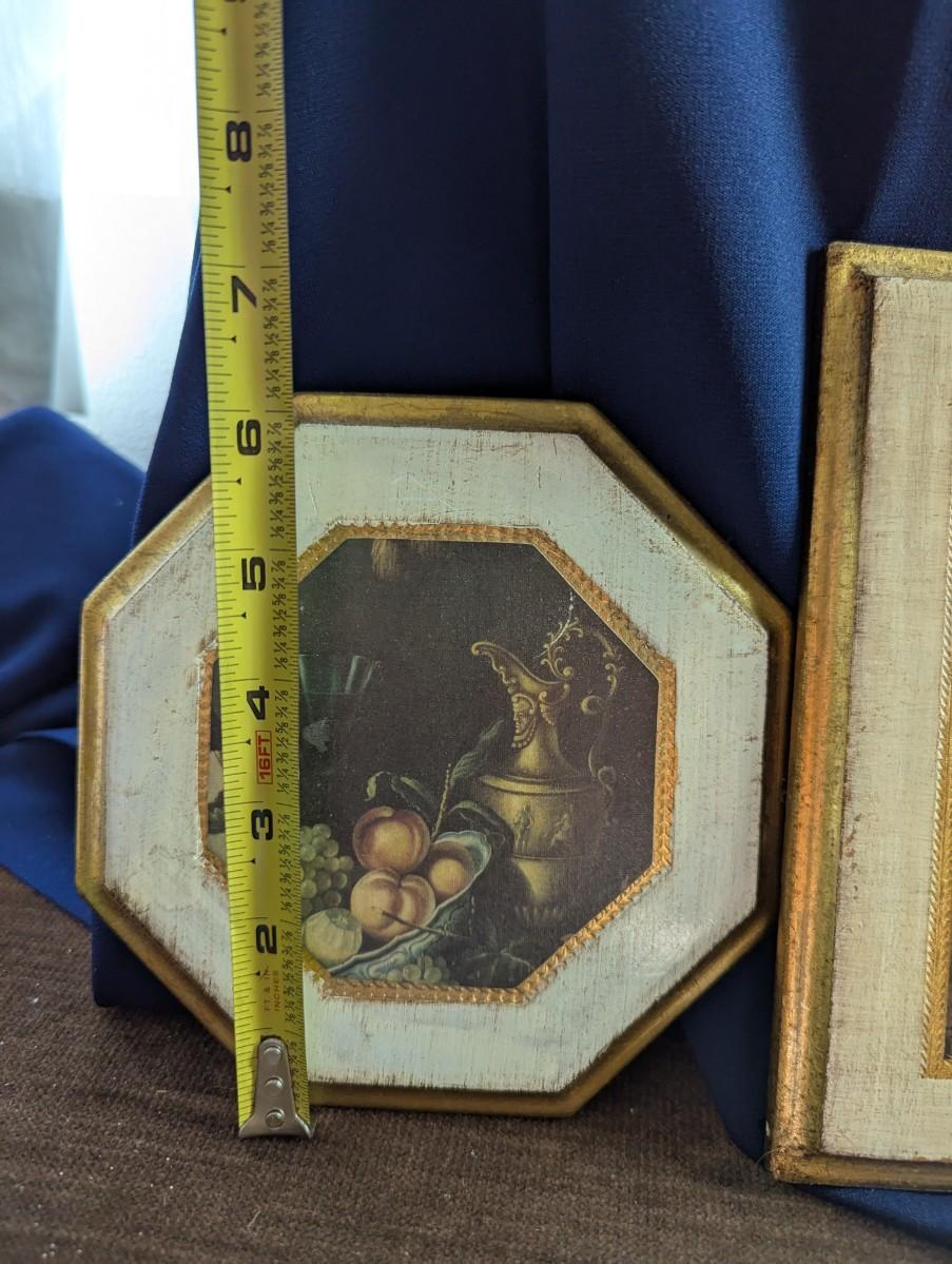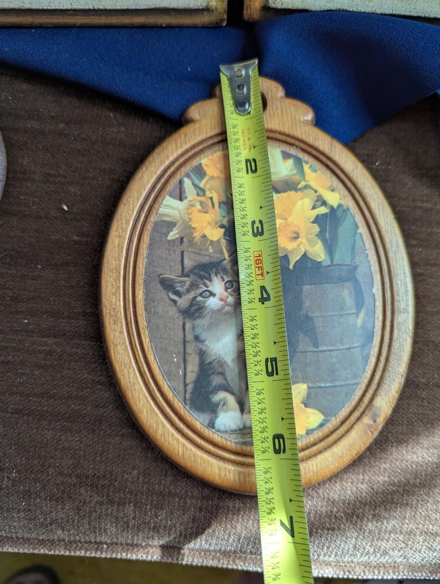 Some nice Wall Hangings, "Still Life with Flowers" by Franz Xaver Pieler Gold Guilt. Vintage Picture of Kitten With Daffodils,Florentine Fruit and Floral print Gilded Edges with Paper Art, Florentine Water Pitcher and Fruit Gilded Edges, Small Round Wooden Wall Hanging Barn Scene Painted by Gladys Estes.