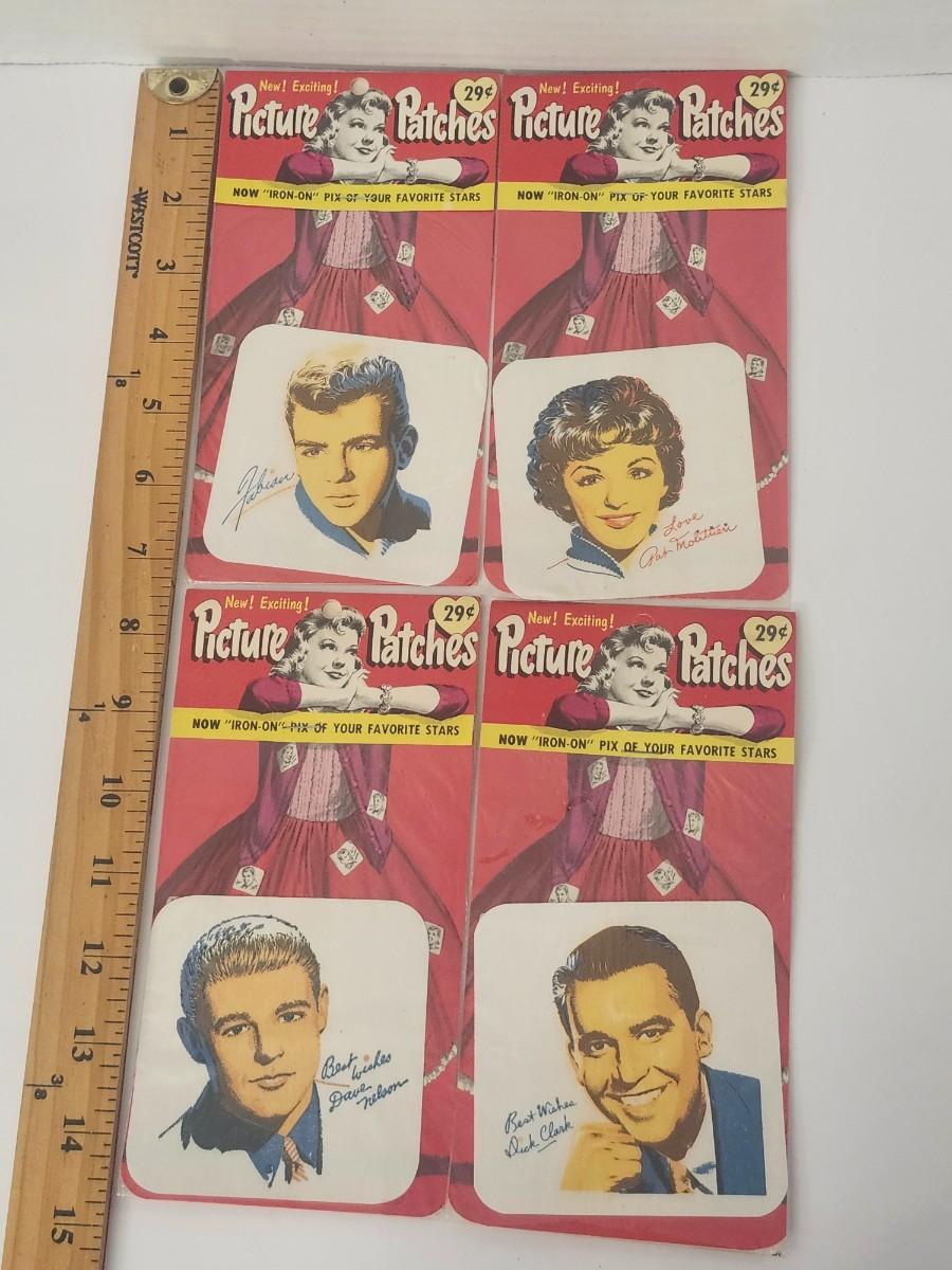Lot of four vintage Picture Patches iron on transfers featuring popular celebrities. Packaged and sealed on original 29 cent cards. Includes Johnny Fabian Dorothy and Rick Nelson plus Dick Clark. Packaging shows age consistent wear as seen. Great retro collectible for display crafts or nostalgia.
