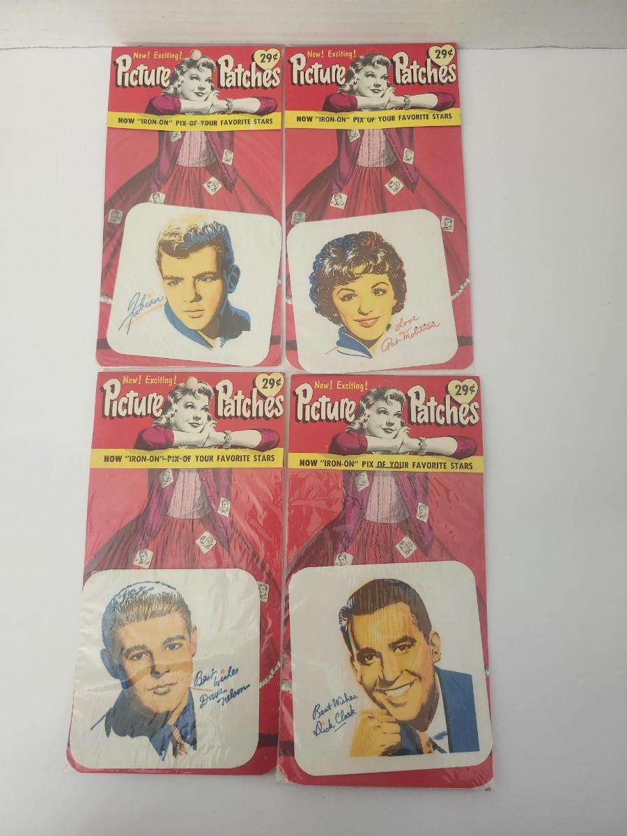Lot of four vintage Picture Patches iron on transfers featuring popular celebrities. Packaged and sealed on original 29 cent cards. Includes Johnny Fabian Dorothy and Rick Nelson plus Dick Clark. Packaging shows age consistent wear as seen. Great retro collectible for display crafts or nostalgia.