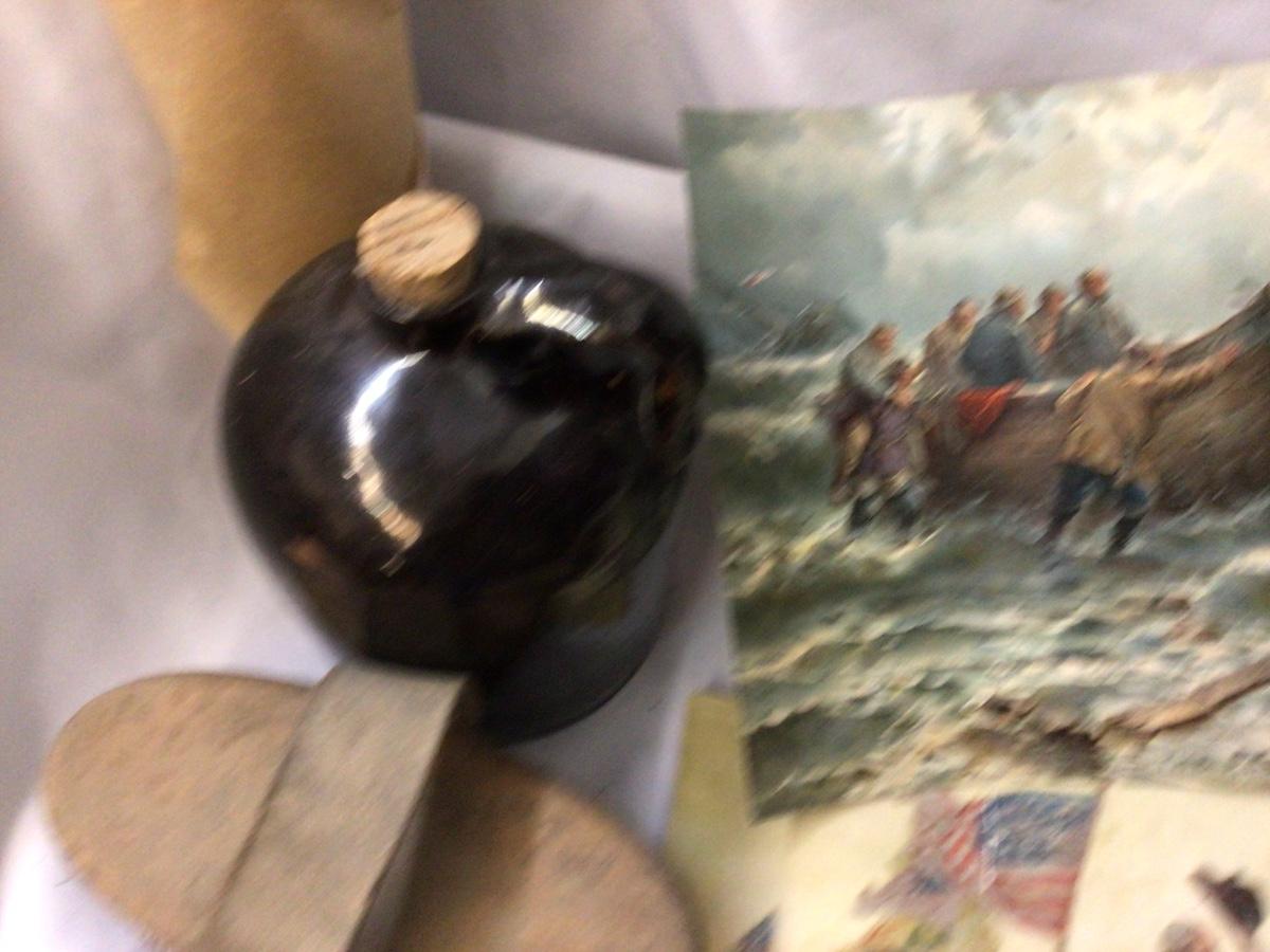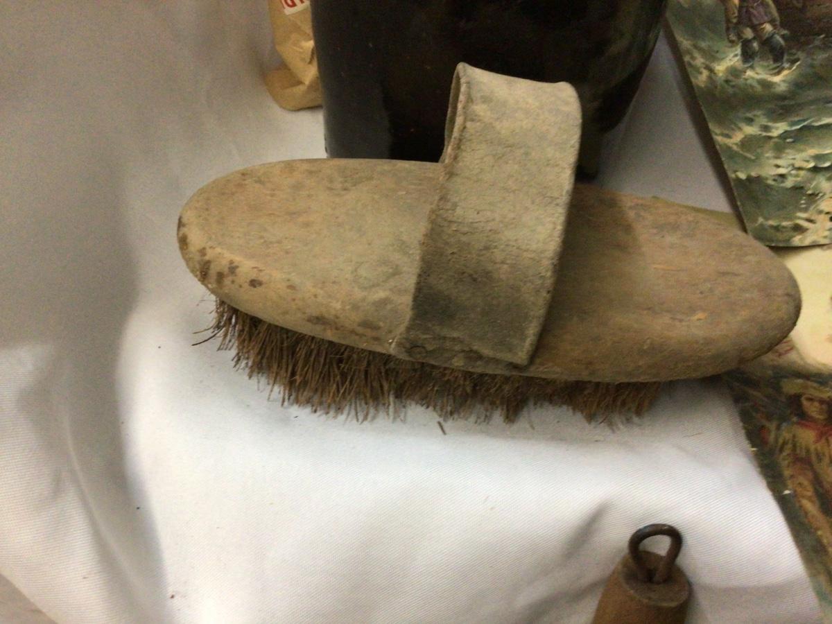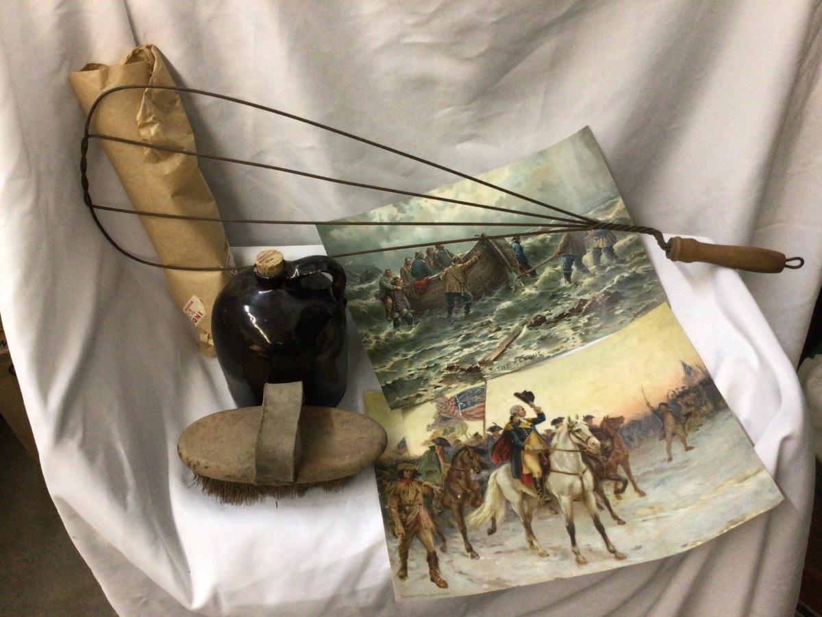 You get two vintage picture General Washington, and fishing boat. There is also a vintage rug beater, nice brown jug, and a really cool vintage industrial floor scrub brush with a foot/hand strap.