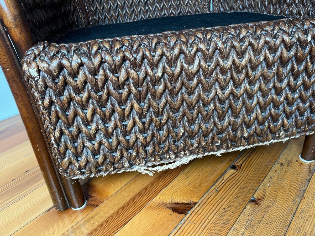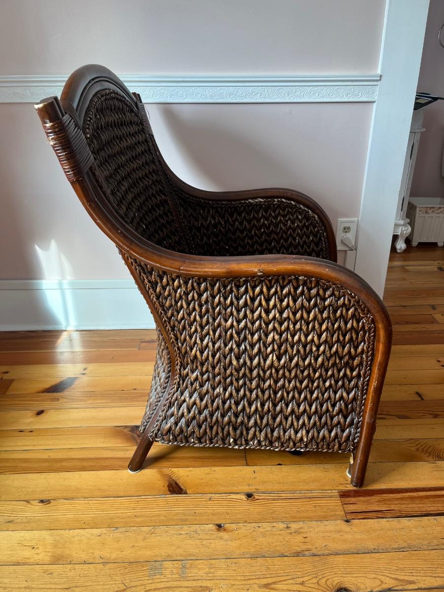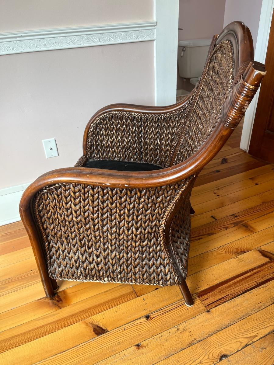 Pier 1 wicker/Indonesian seagrass King armchair; approx. H: 15" (seat) x 30.5" x 30", 39" (back)