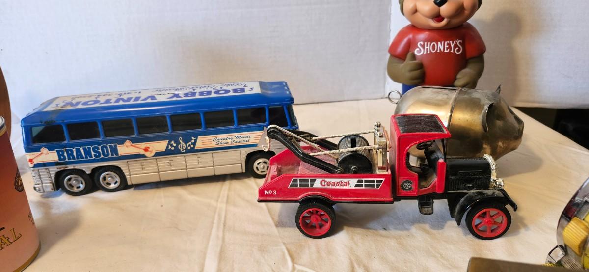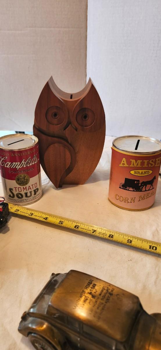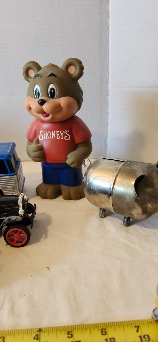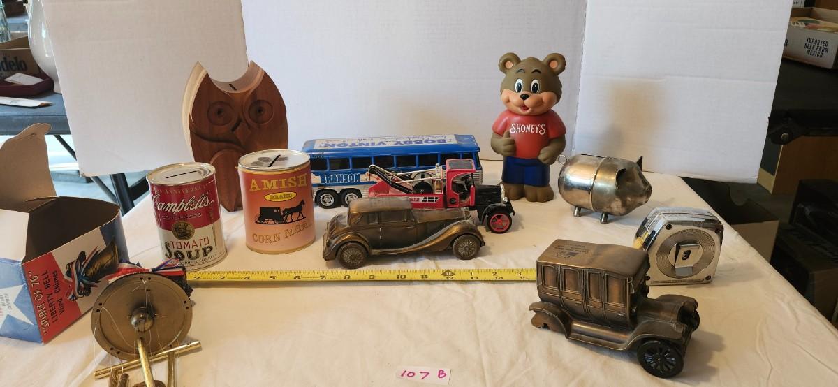 Vintage Piggy Banks lot, including Campbell, Shoney's, Cars, Owl