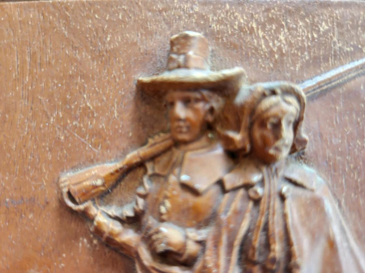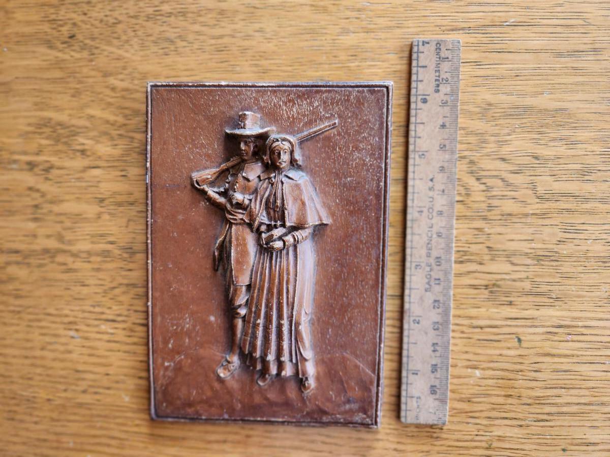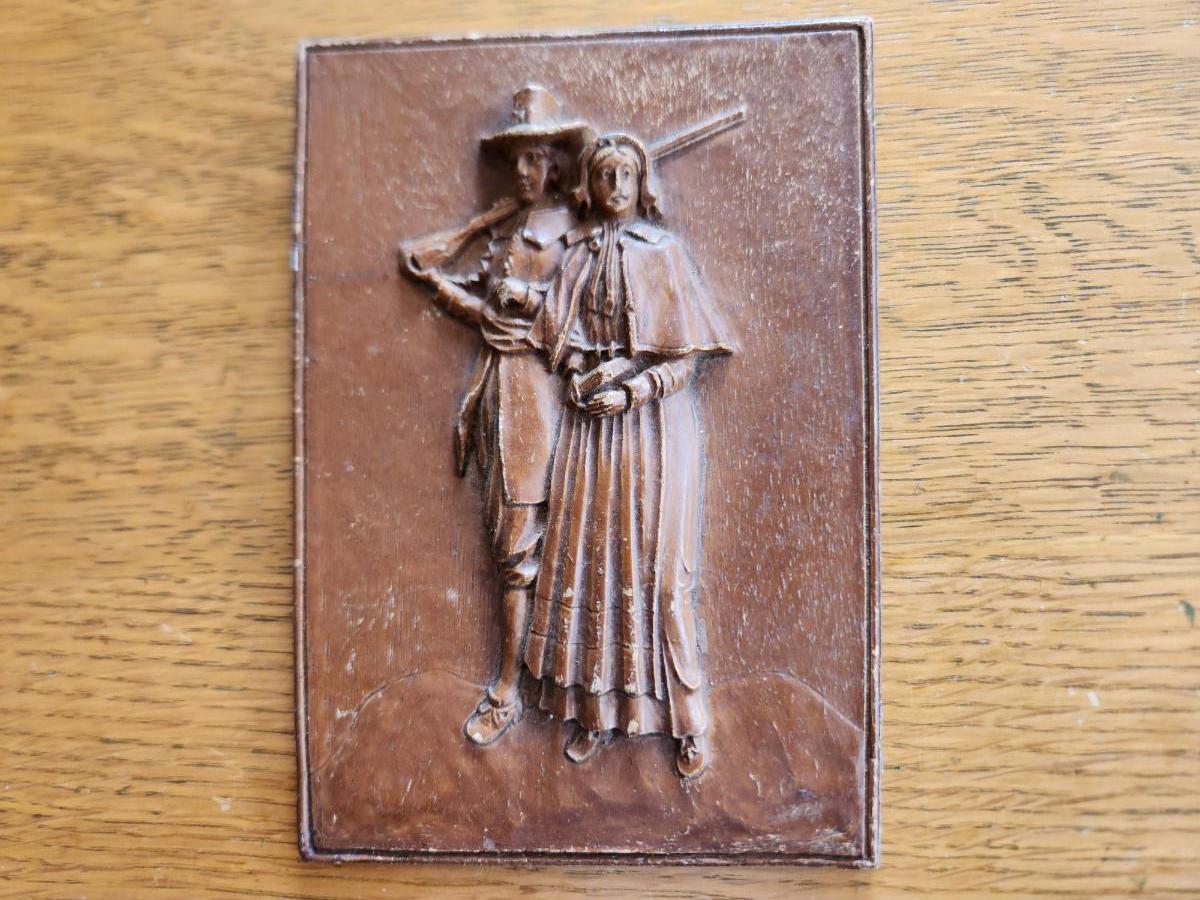 This auction lot is for a rare and Vintage Pilgrim Thanksgiving Plaque. Unmarked as of marker but surely quite vintage this unique piece will look great on any shelf or part of a display of Americana. Constructed of any unknown composite material. Fun brown coloration. Measures about 4.5X6-inches.