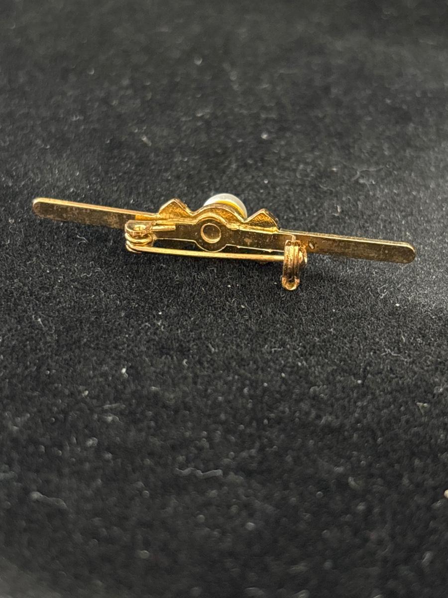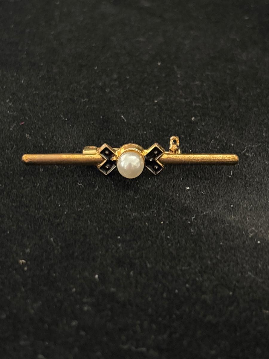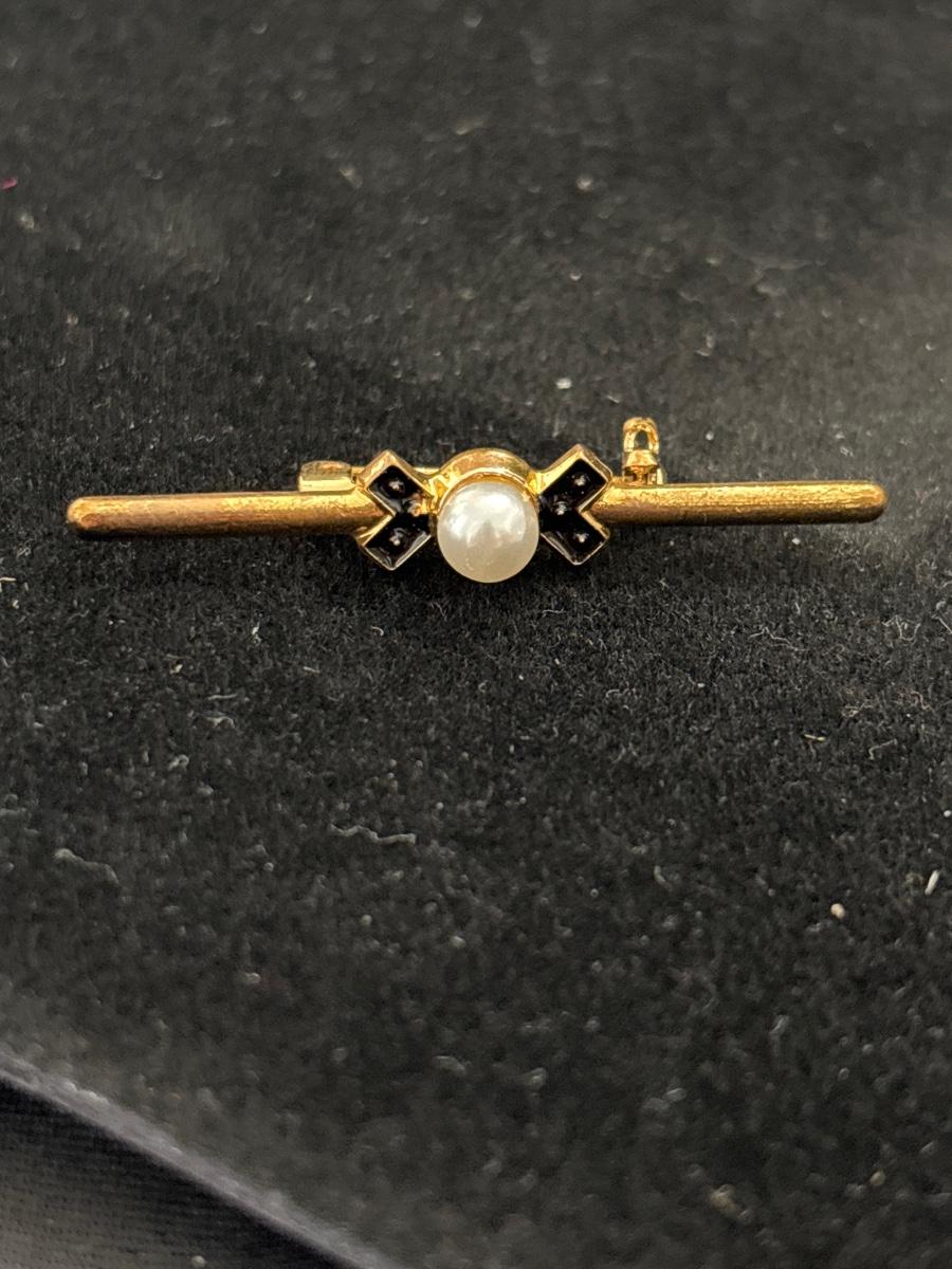 Vintage Pin Brooch Gold Toned Bar Design With White Faux Pearl And Black Enamel