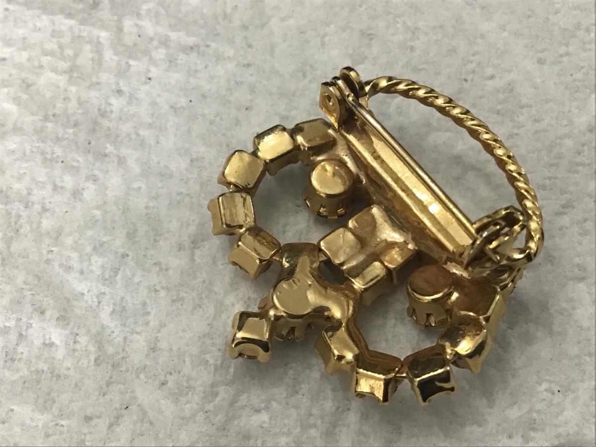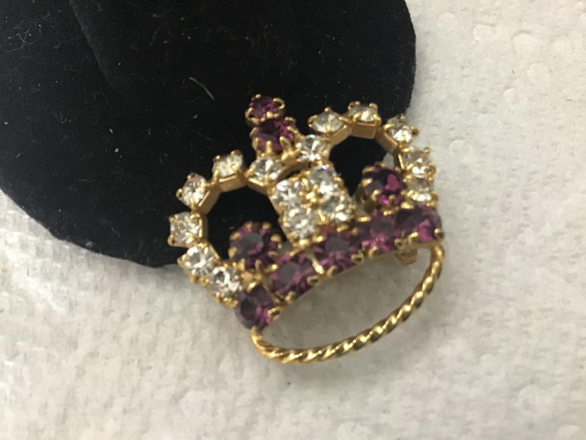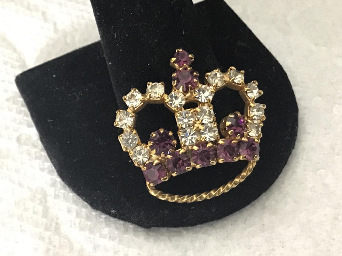 Vintage Pin Brooch Gold Toned Crown Design With Purple And Clear Rhinestones