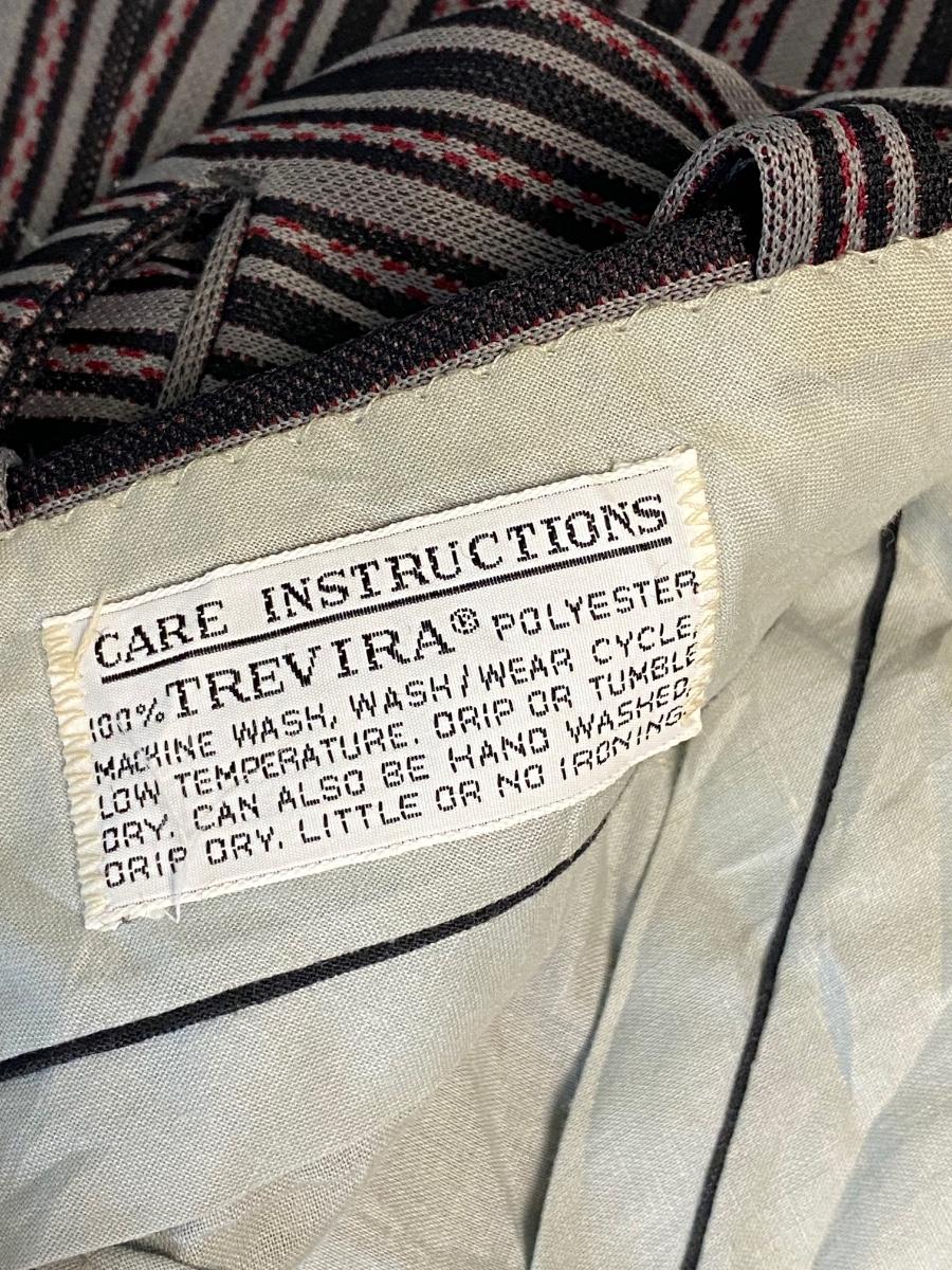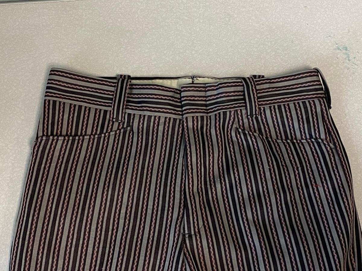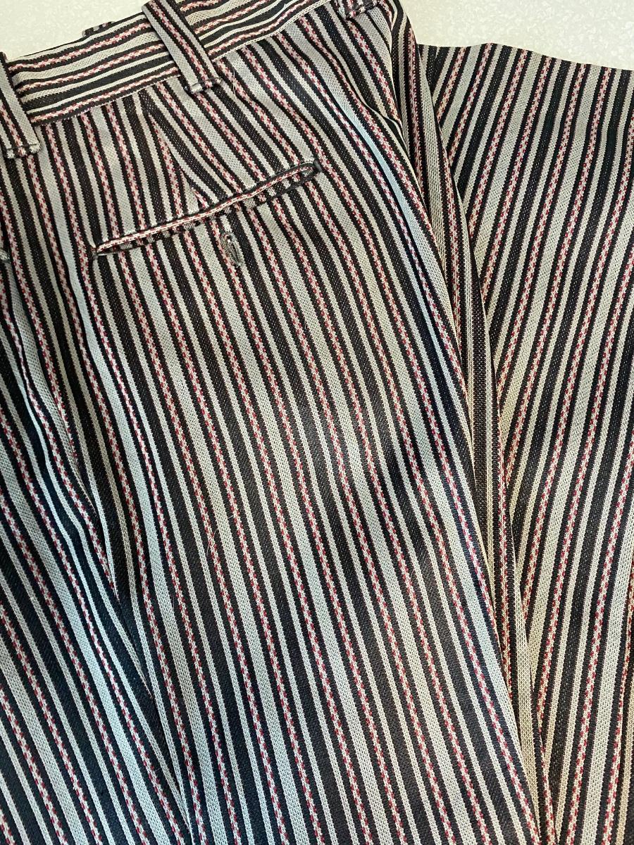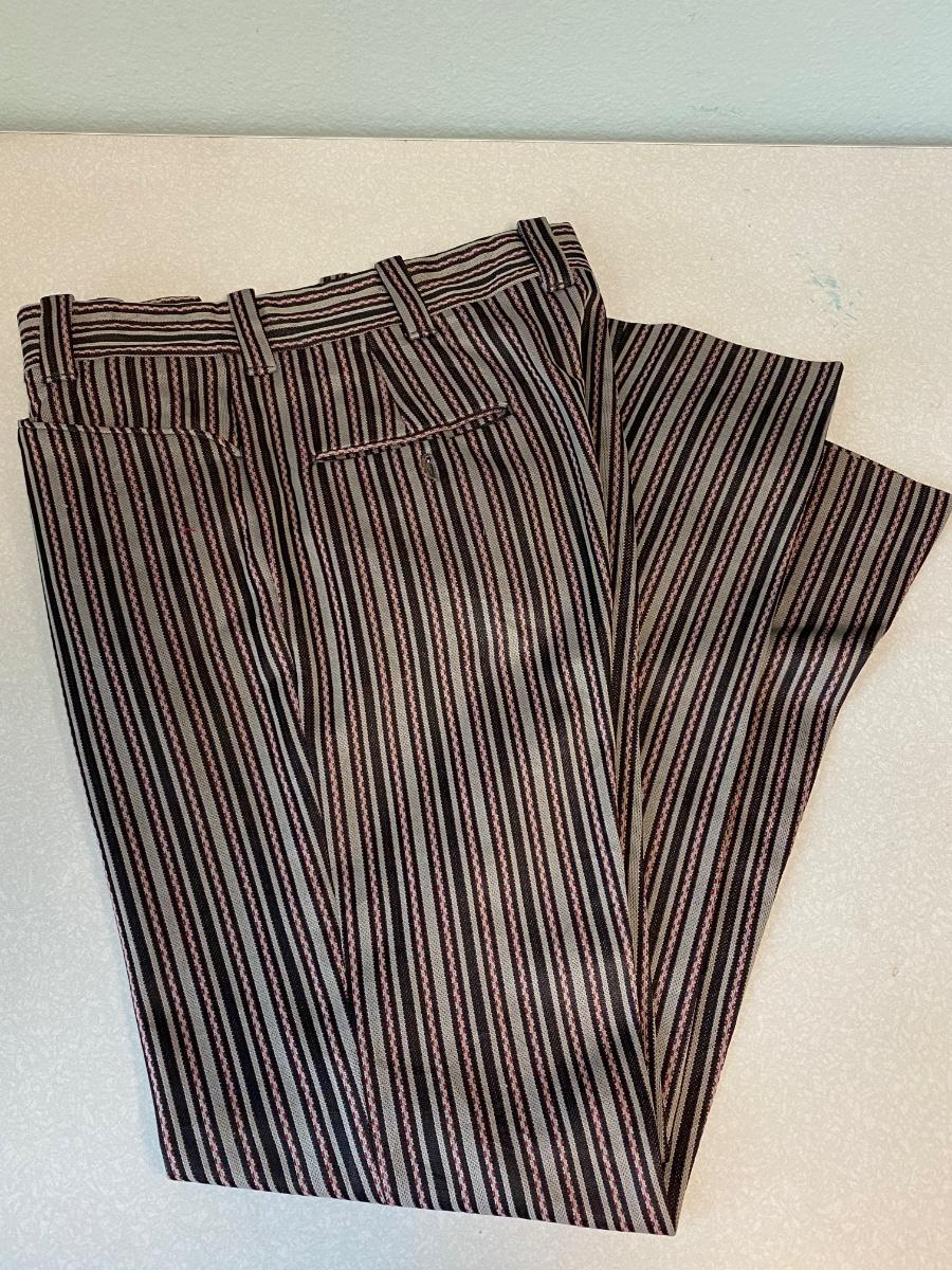 Vintage men's pinstriped slacks. Polyester, grey, red, blue stripe pattern. No maker or size tag but they are on the smaller size. In good condition.