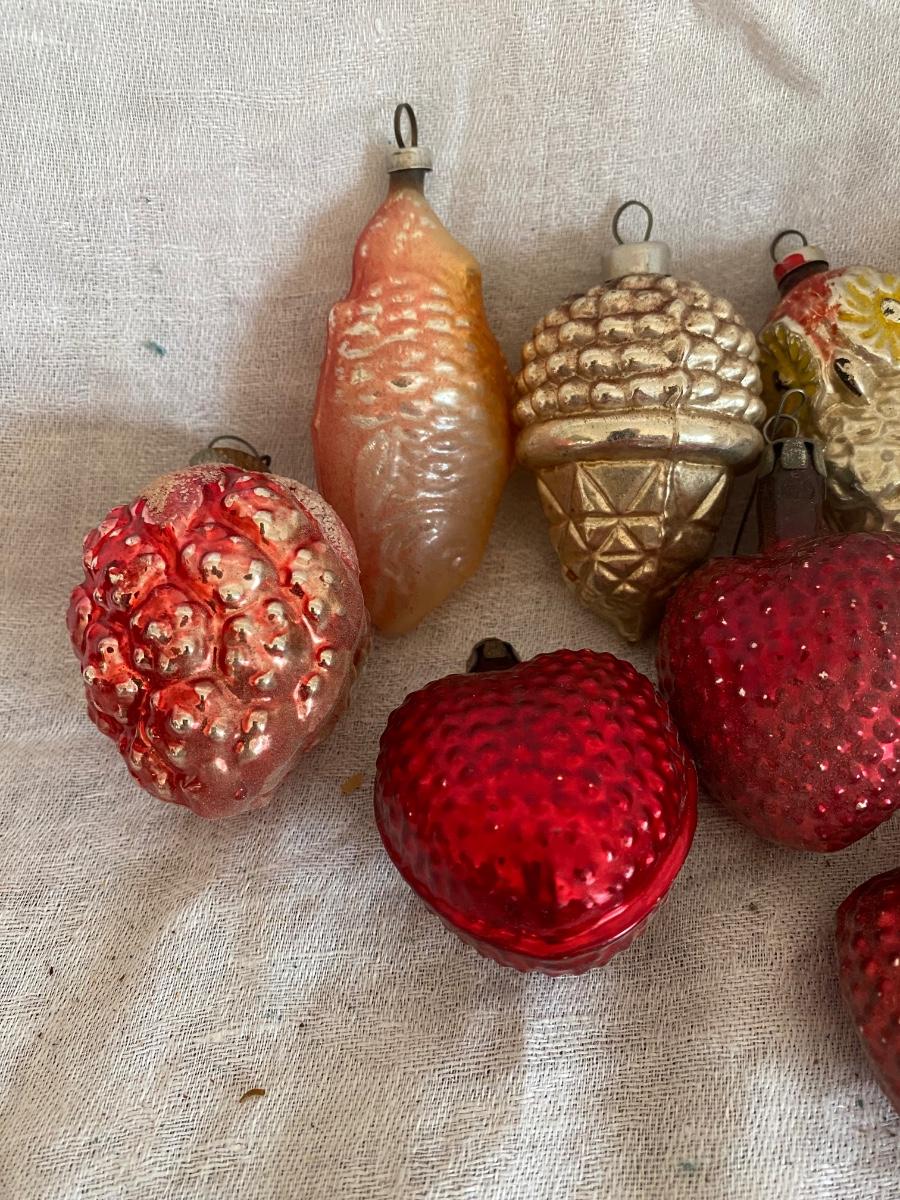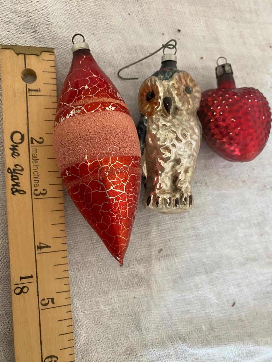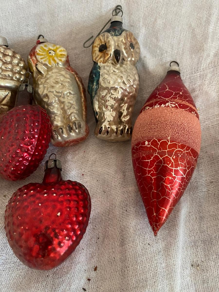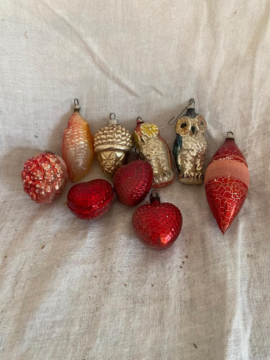 Vintage Pine cone, owl and heart Christmas glass ornaments. 8 in total. All in very good vintage condtion. Average 2" for heart to 4 for teardrop ornament.