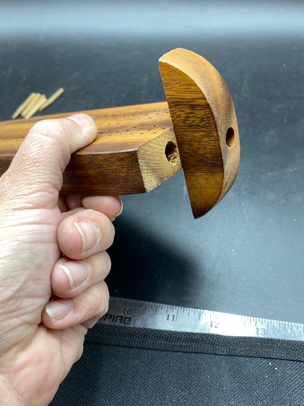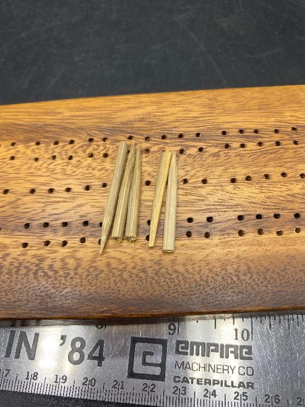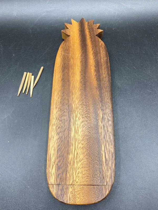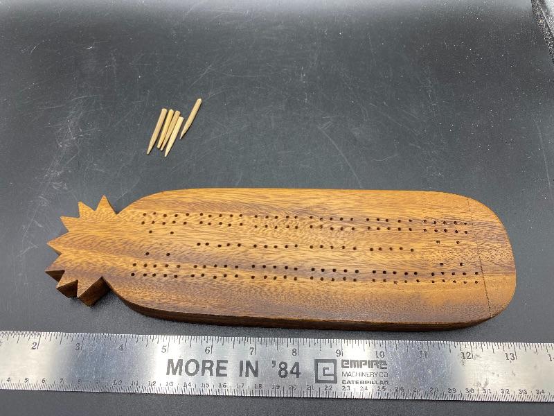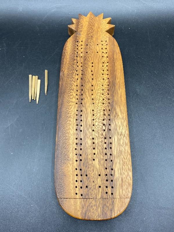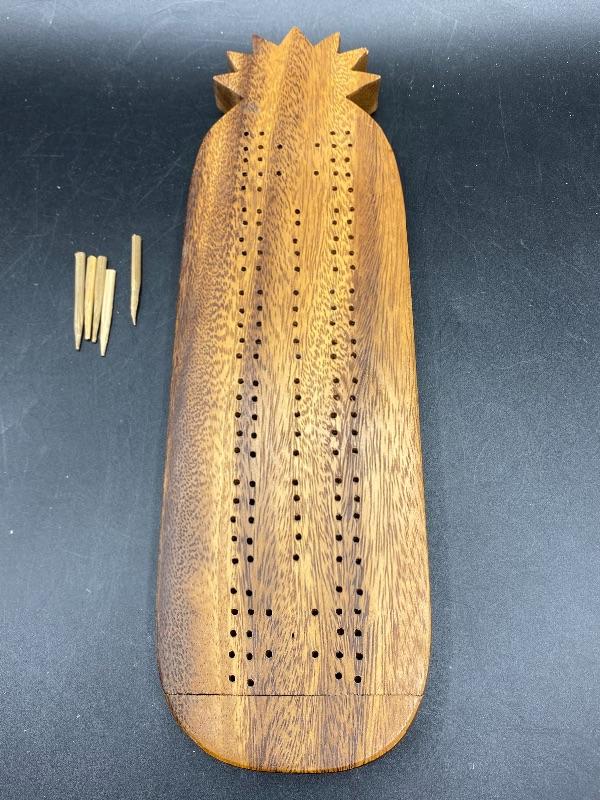 Vintage pineapple shaped cribbage board. Bottom piece turns for peg storage. About 11" long. Has 5 handmade pegs, look like skewer ends.
