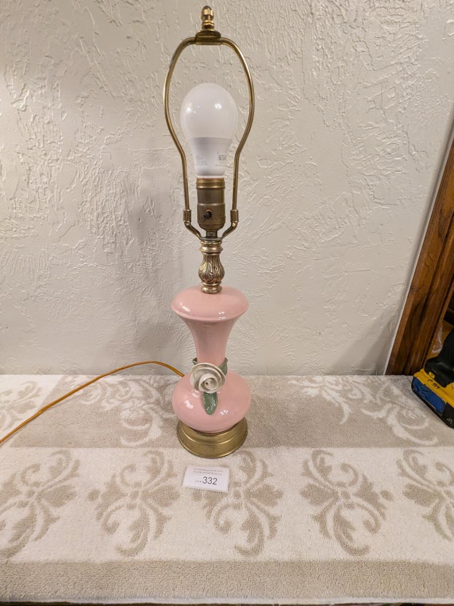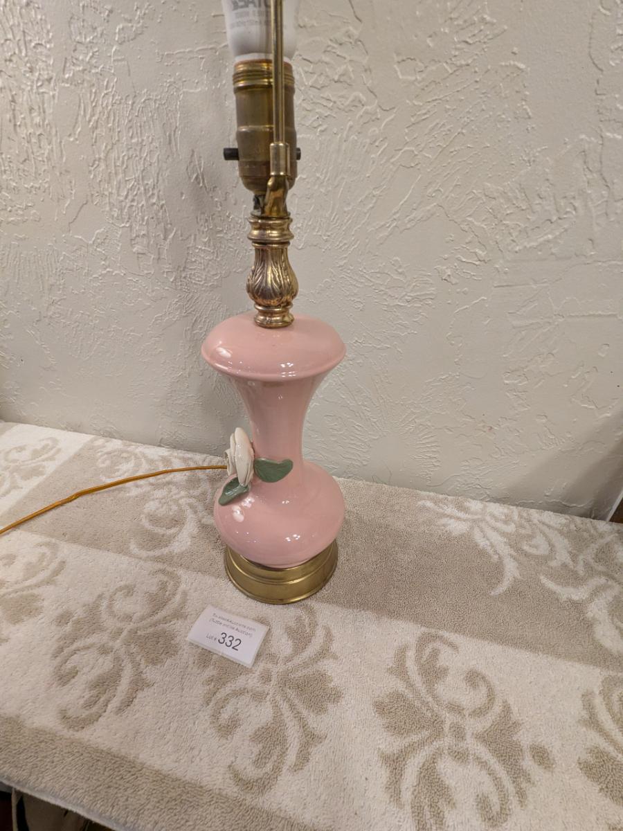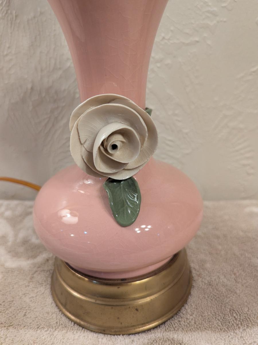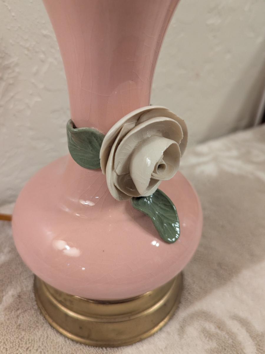 Vintage Pink Alacite glass lamp with flower on it. Brand unknown see all photos. Flower has a Capodimonte like style to it.
