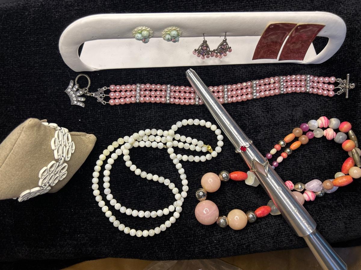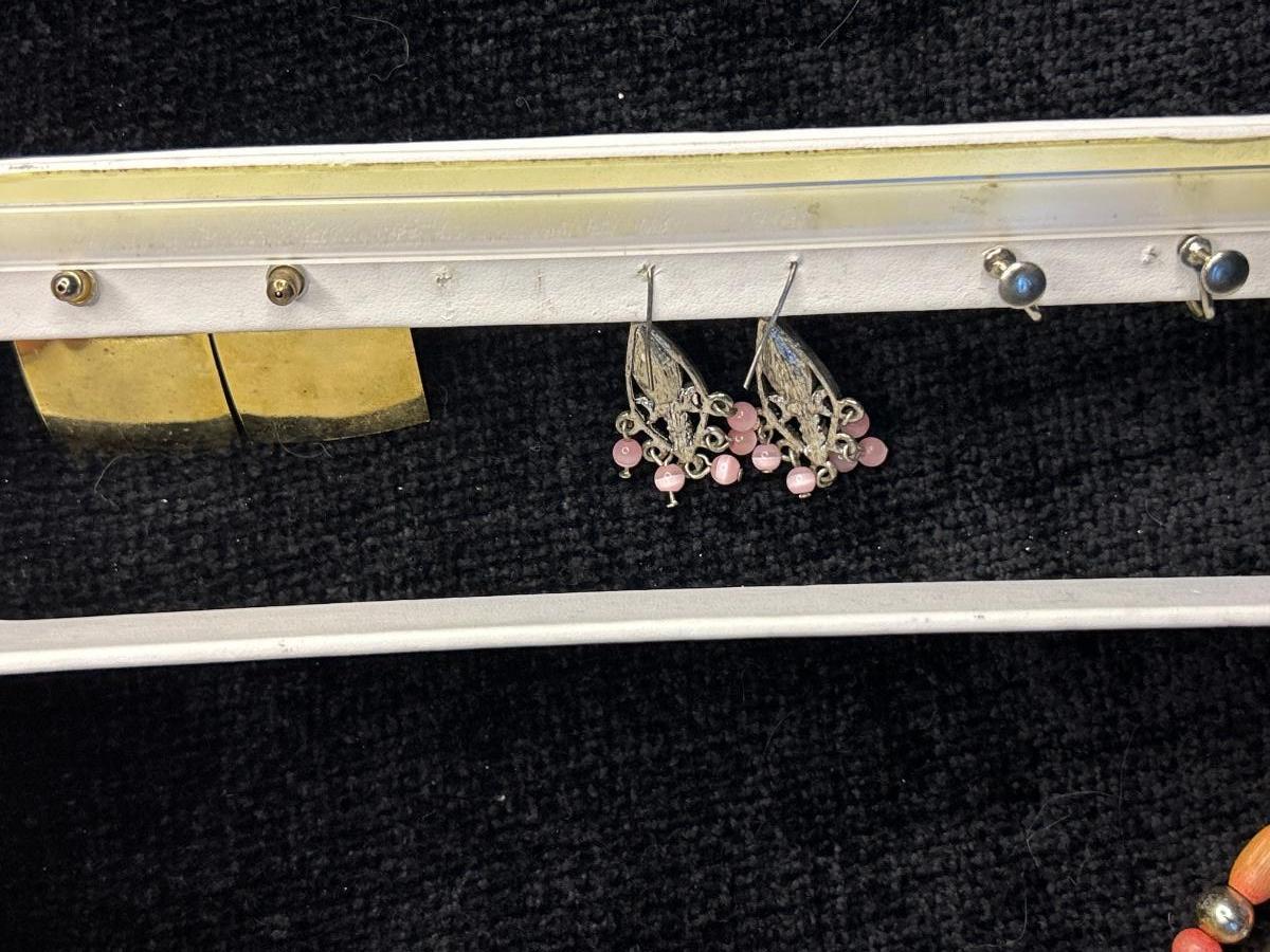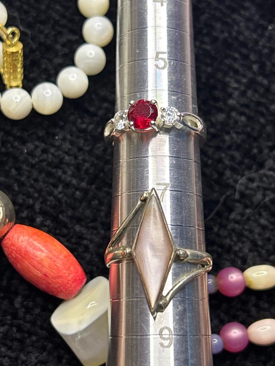 The two white necklaces are glass. The two pink pair of earrings are pierced, and the other is clip. The ring with the red stone is stamped 925. The other is not, but it looks like Sterling.